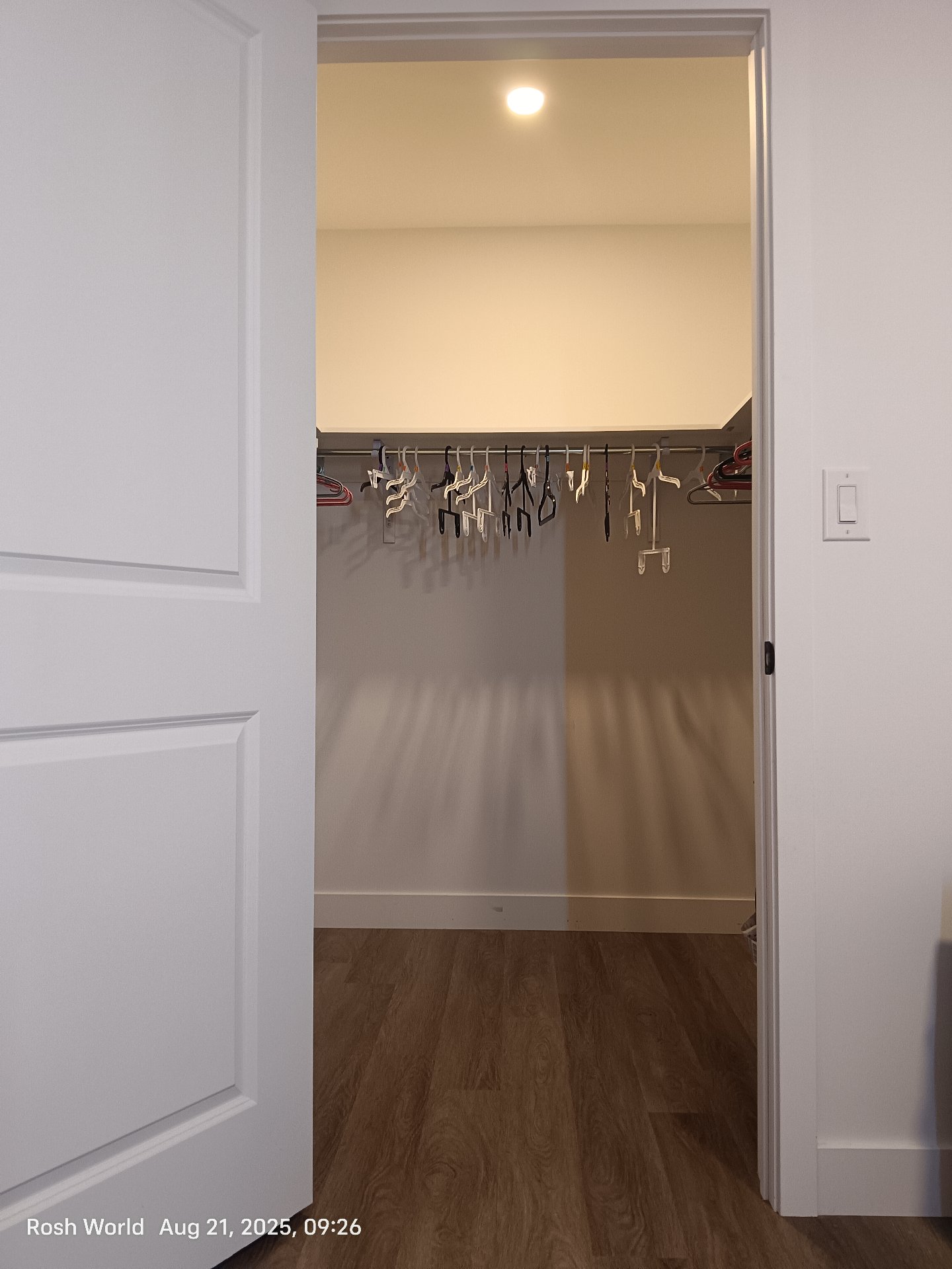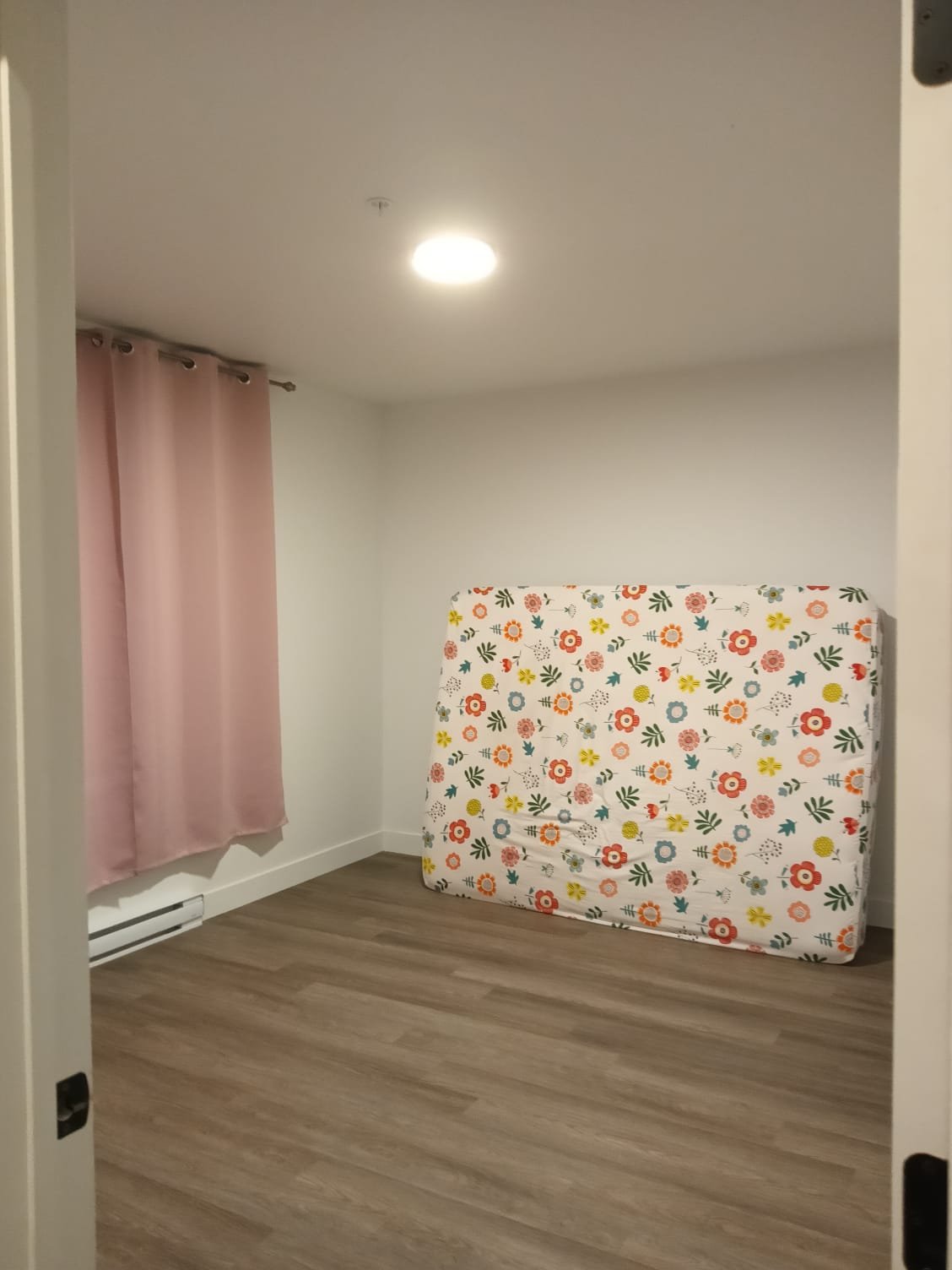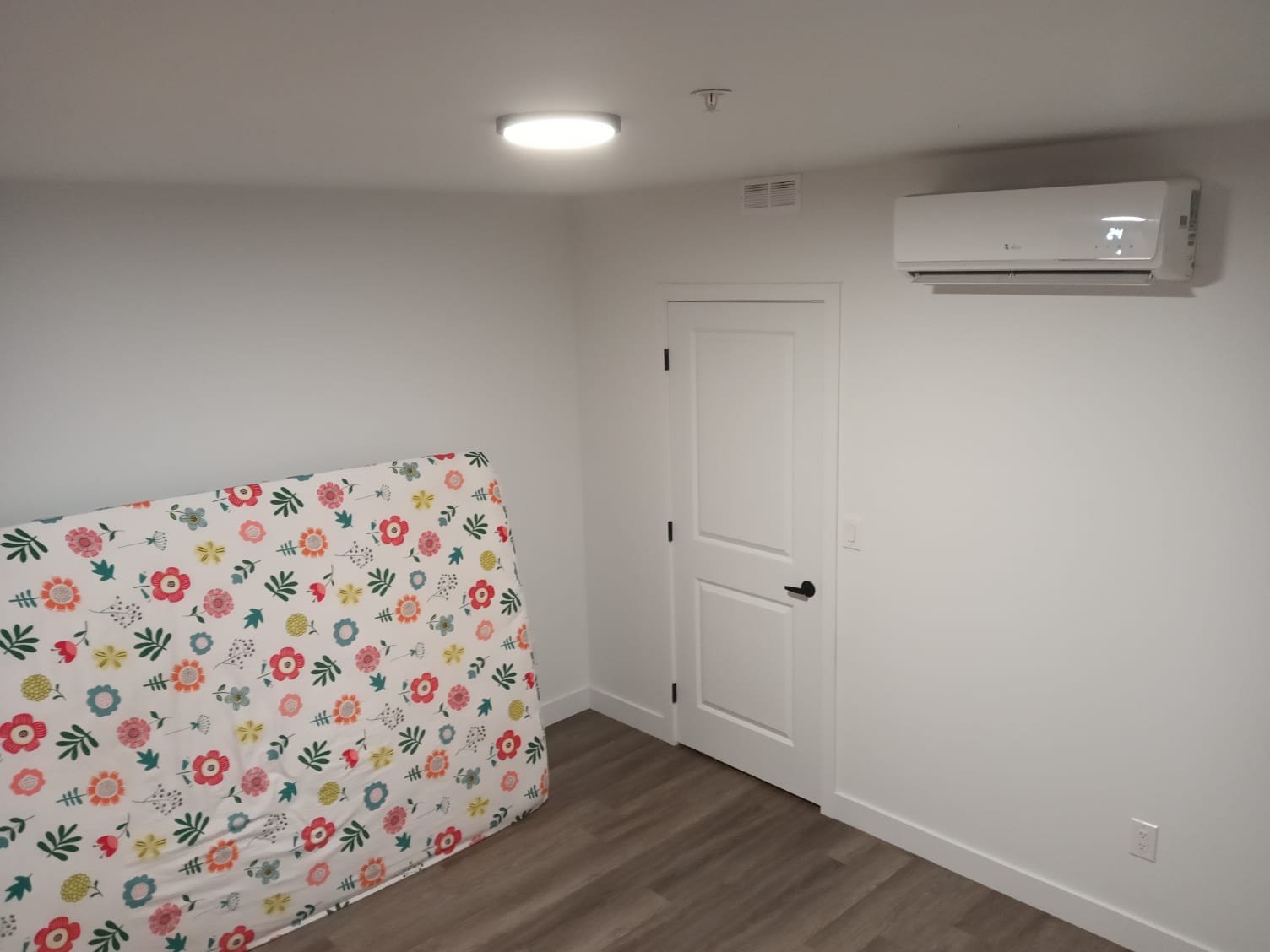 -- Large bedroom with A/C, electric heated flooring and a closet.