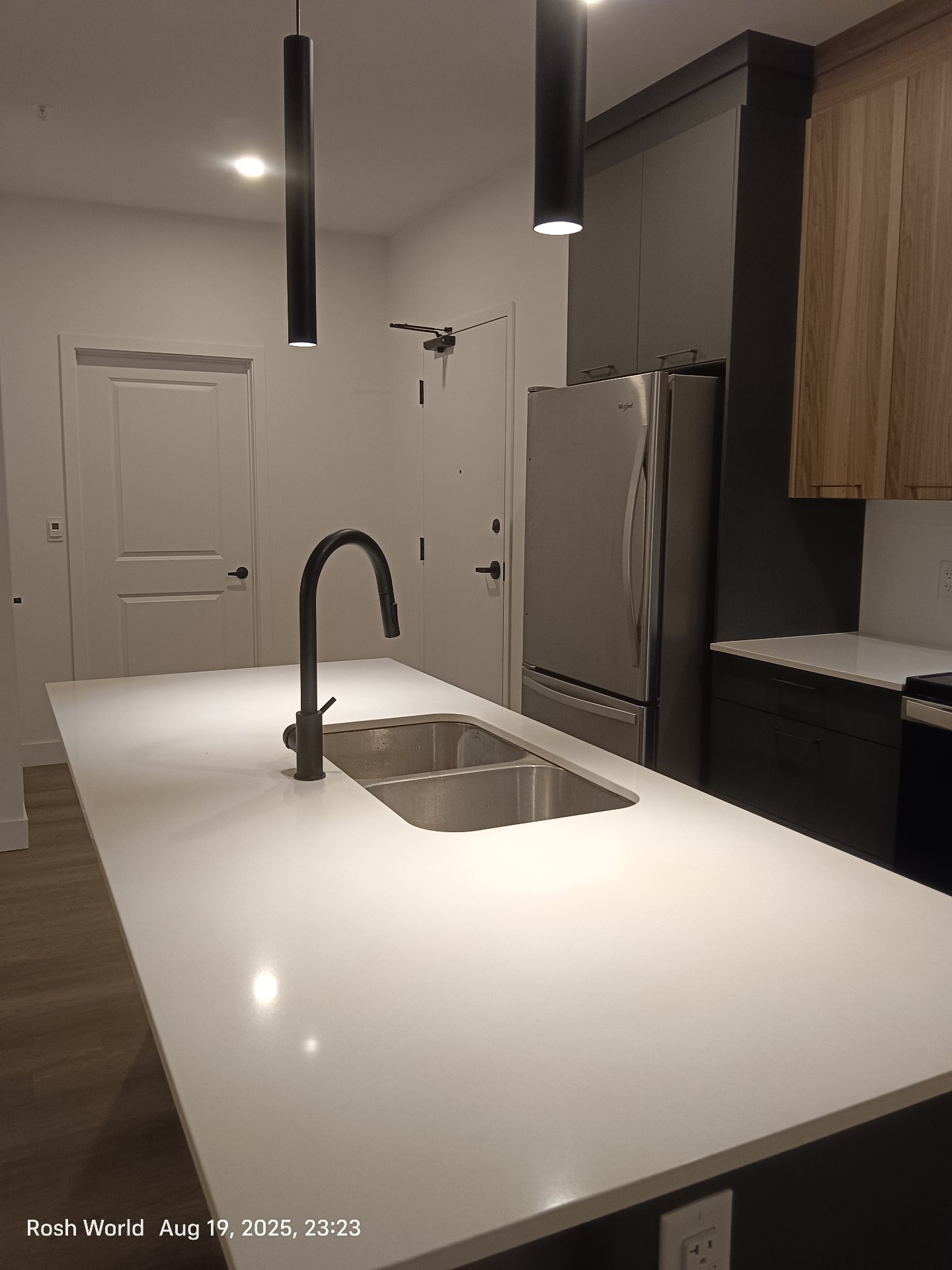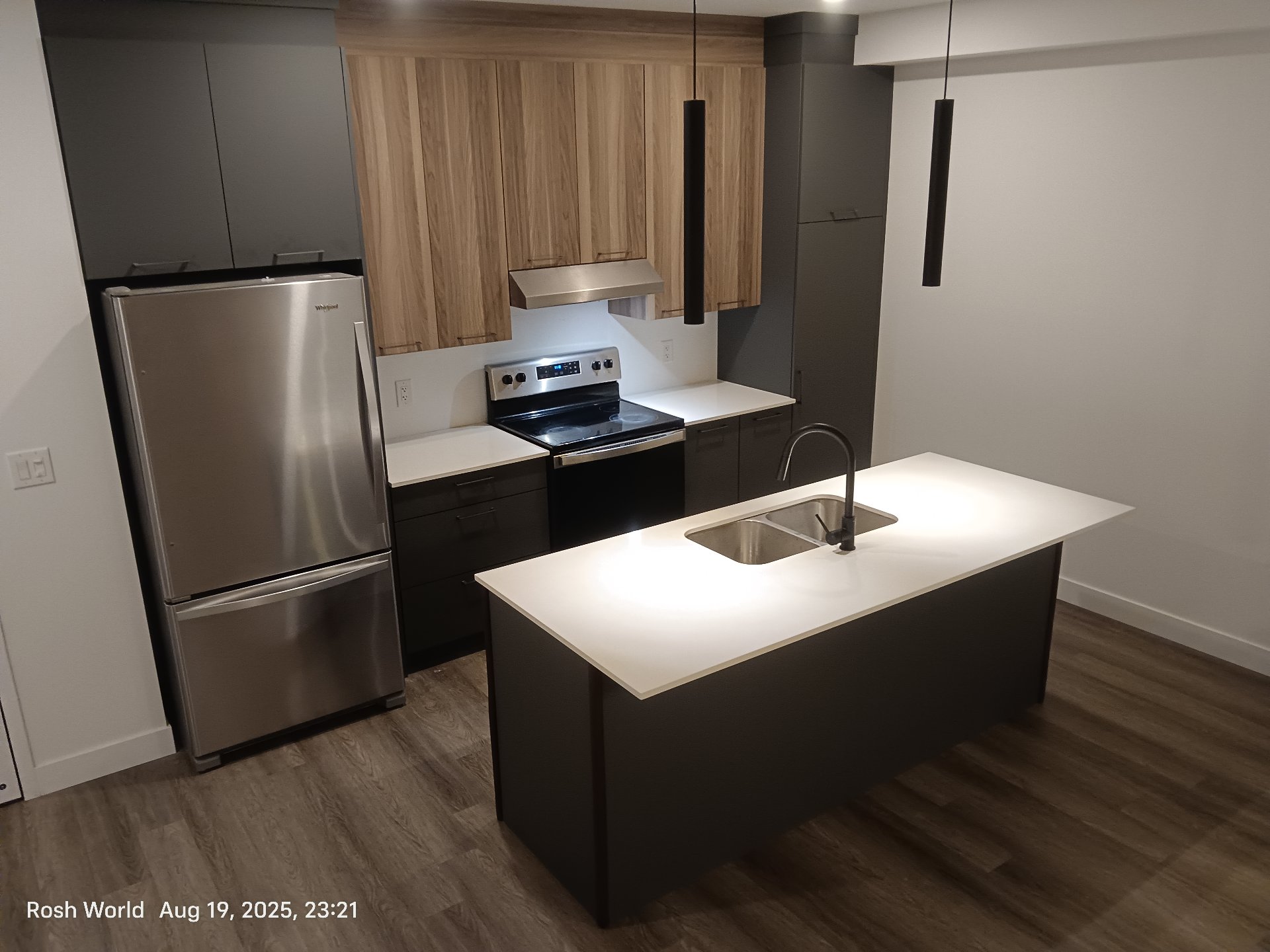 -- Modern kitchen with quartz countertops, contemporary cabinetry and high-end appliances (fridge, dishwasher, cooktop + oven).