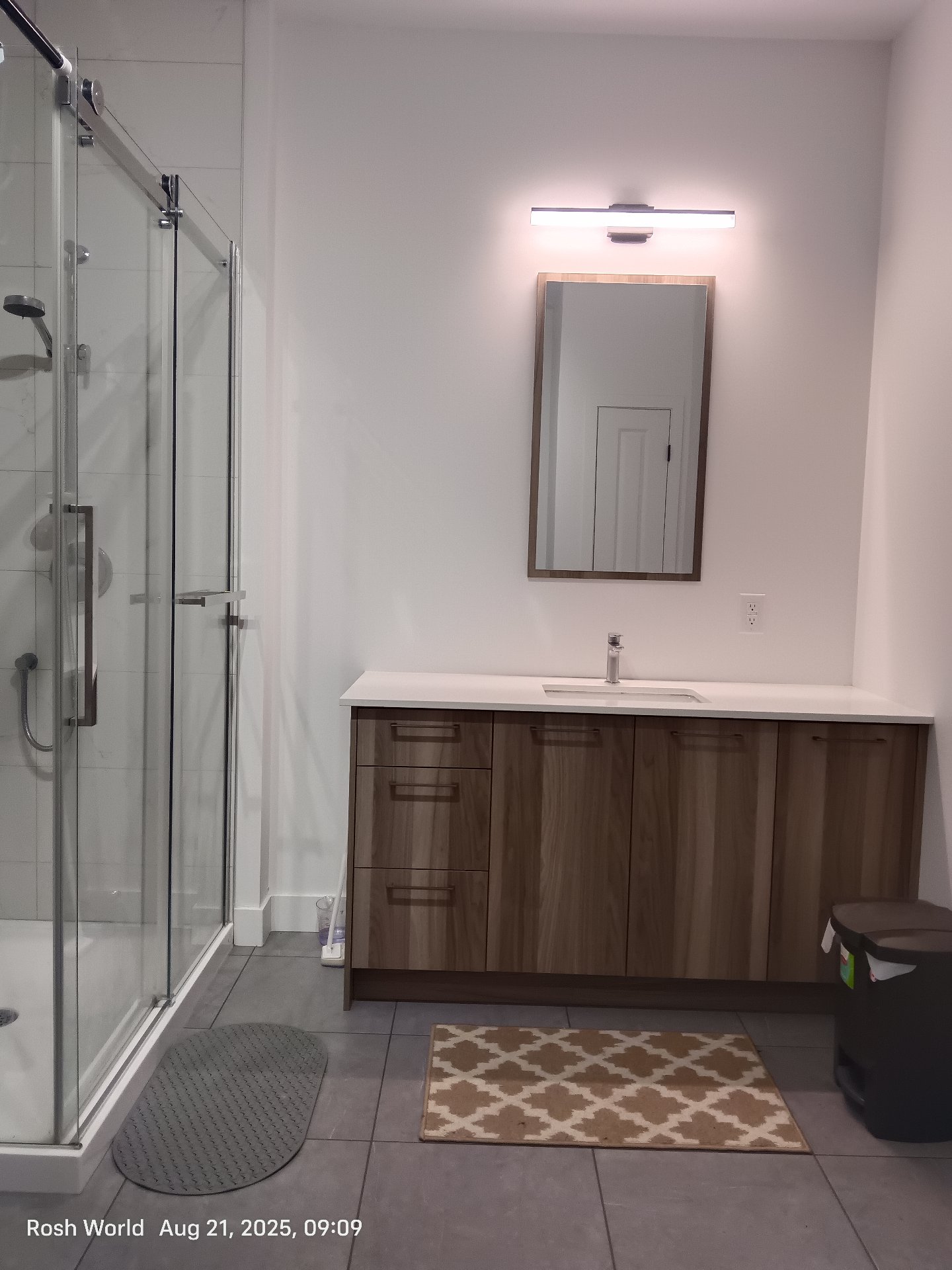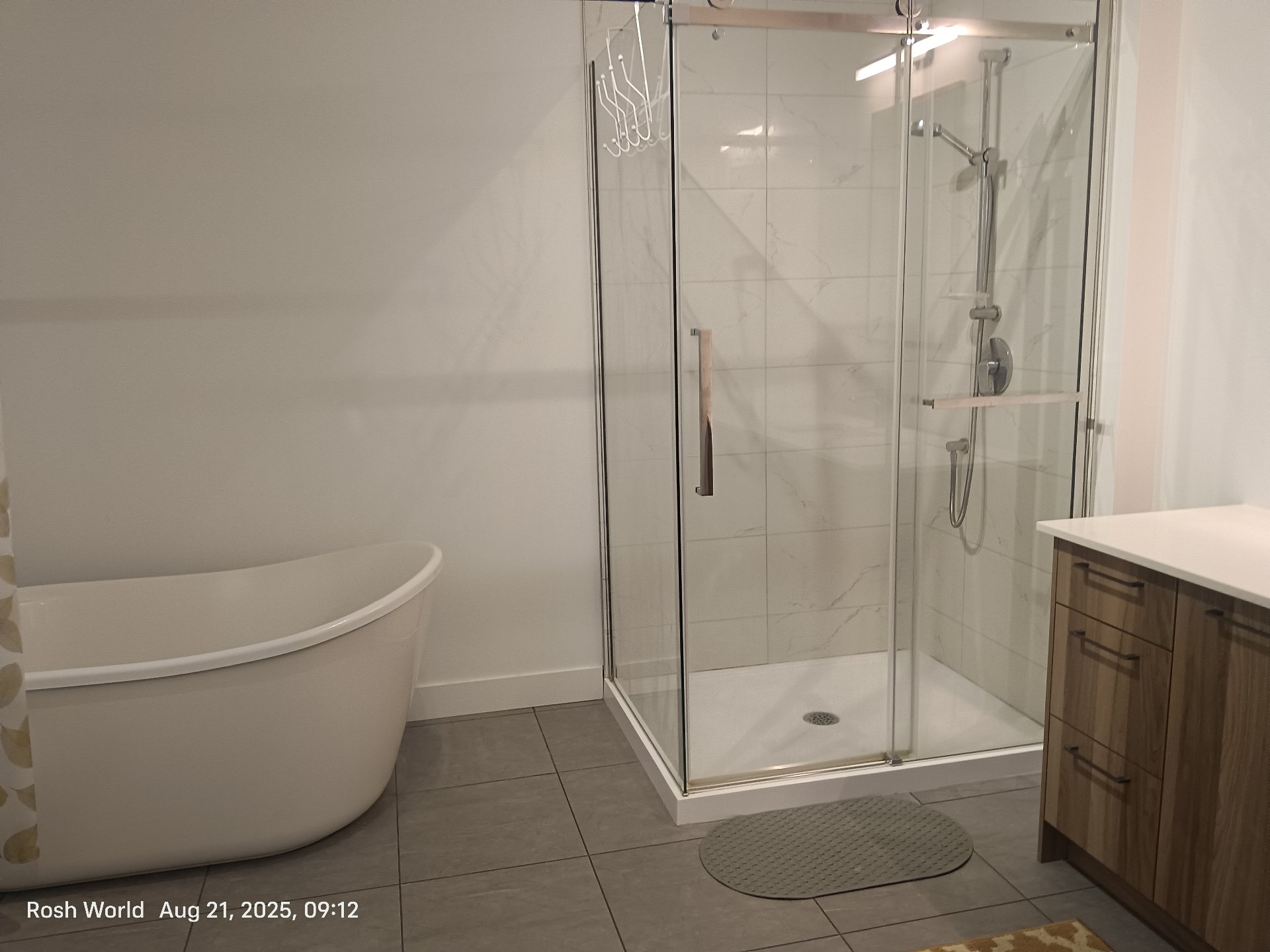 -- Bathroom with heated floors, glass shower, bathtub and generous storage.