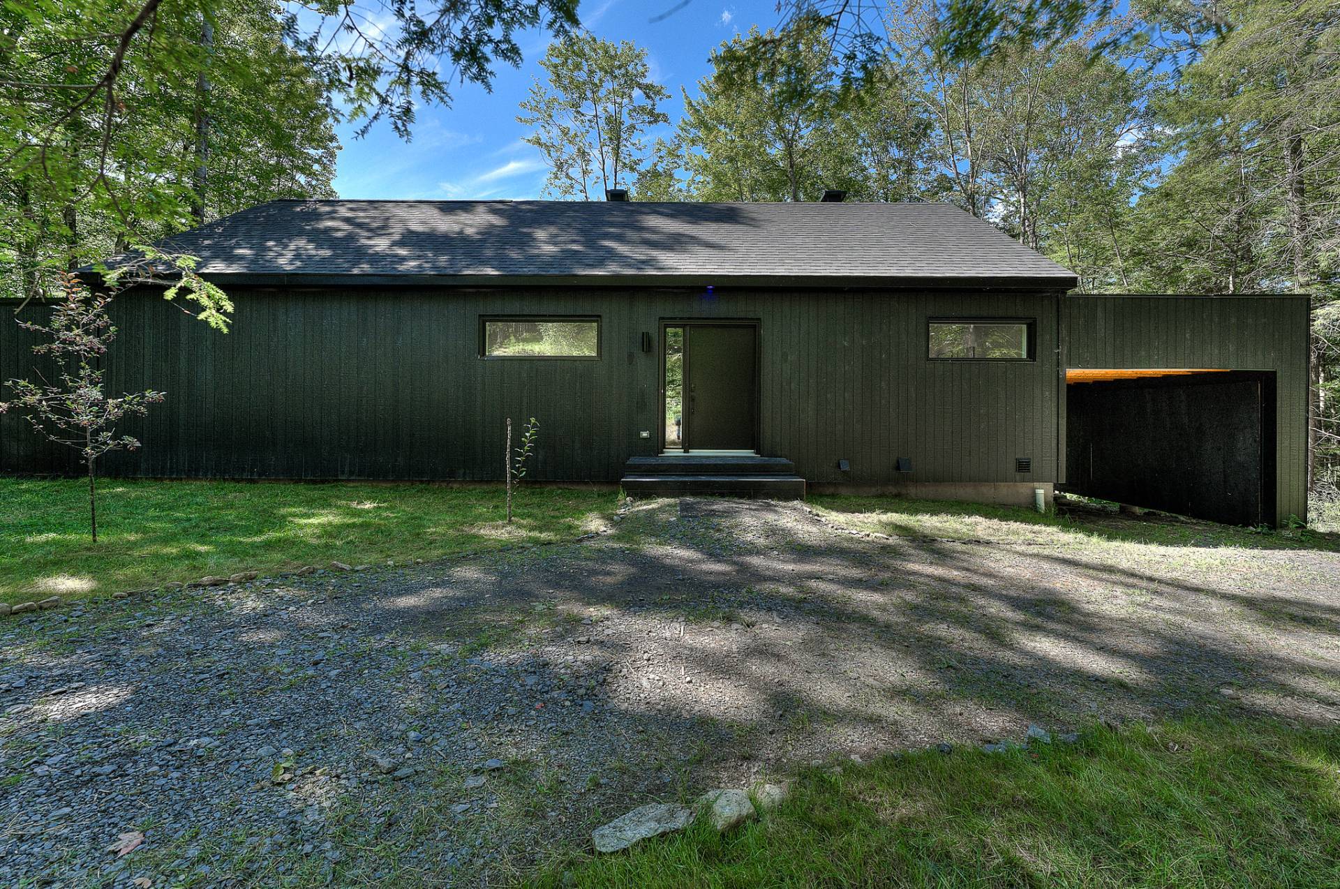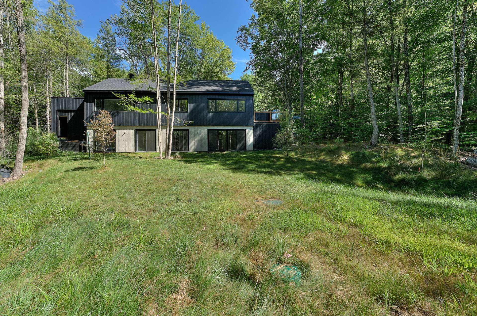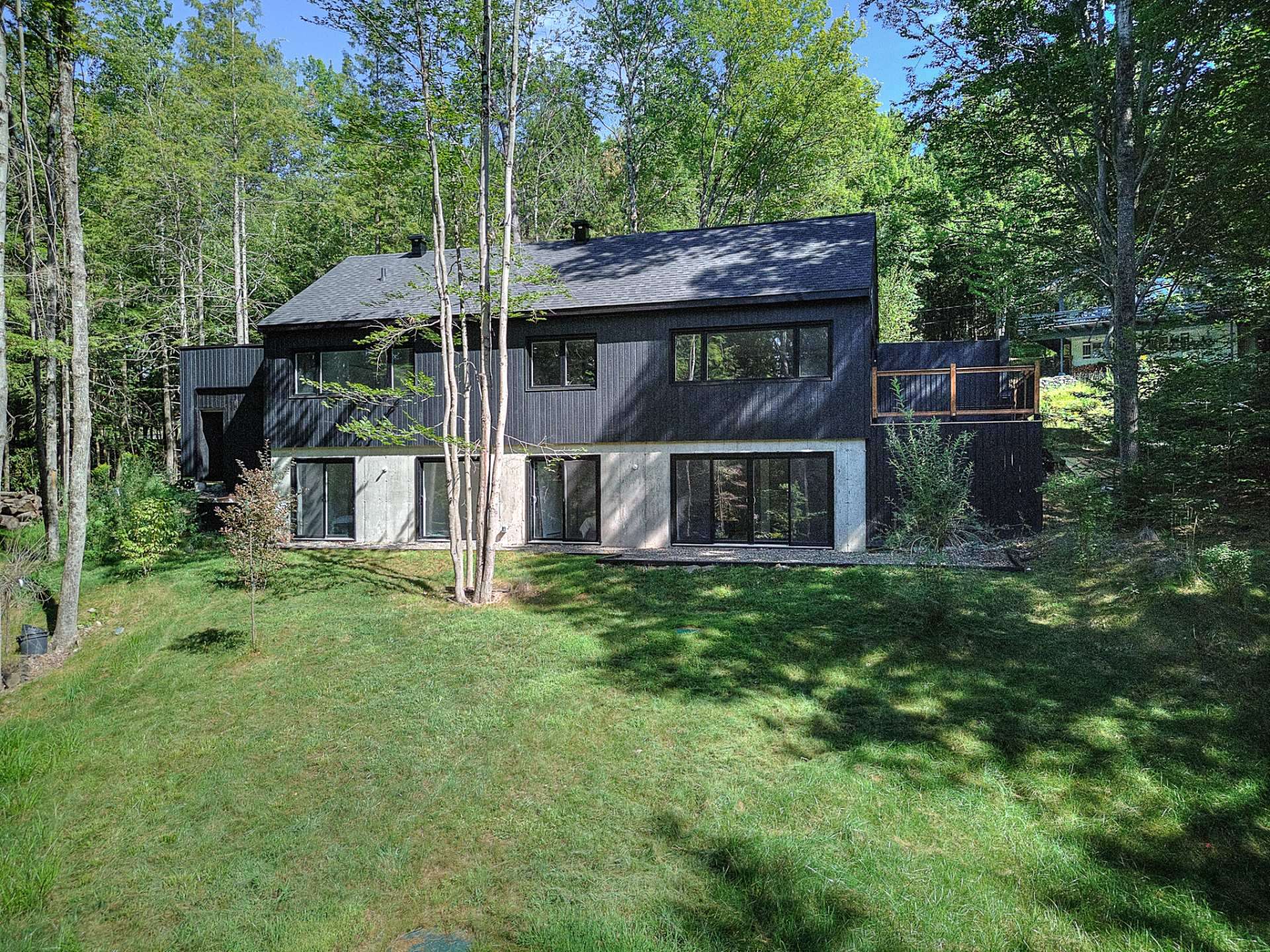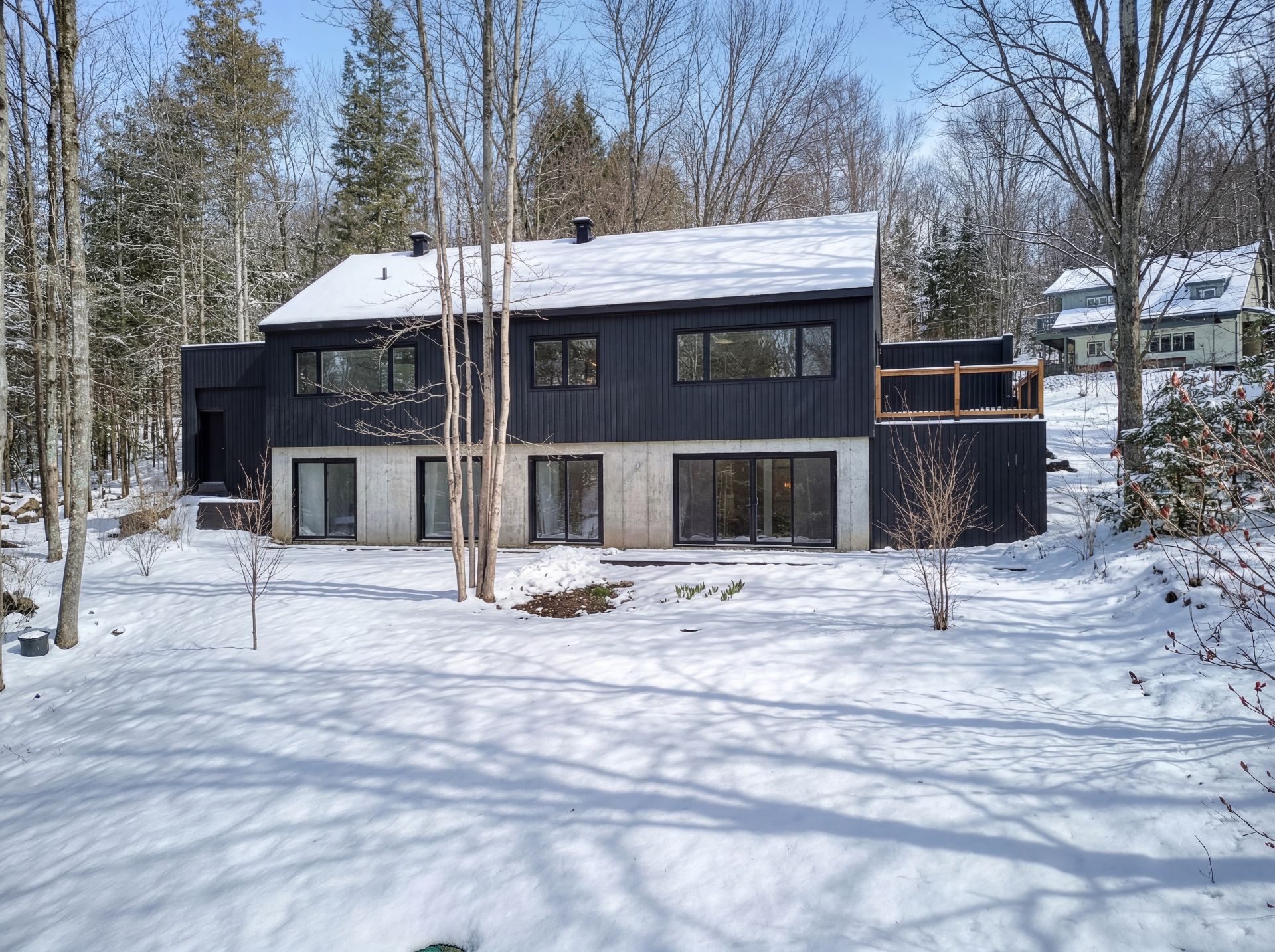 Discover a unique property combining Scandinavian design and modern comfort, nestled in the prestigious Domaine Mon-Louis in Sutton. This house, with its sleek, contemporary style, captivates at first glance thanks to its black exterior cladding and simple architectural lines, perfectly blending into the surrounding nature.