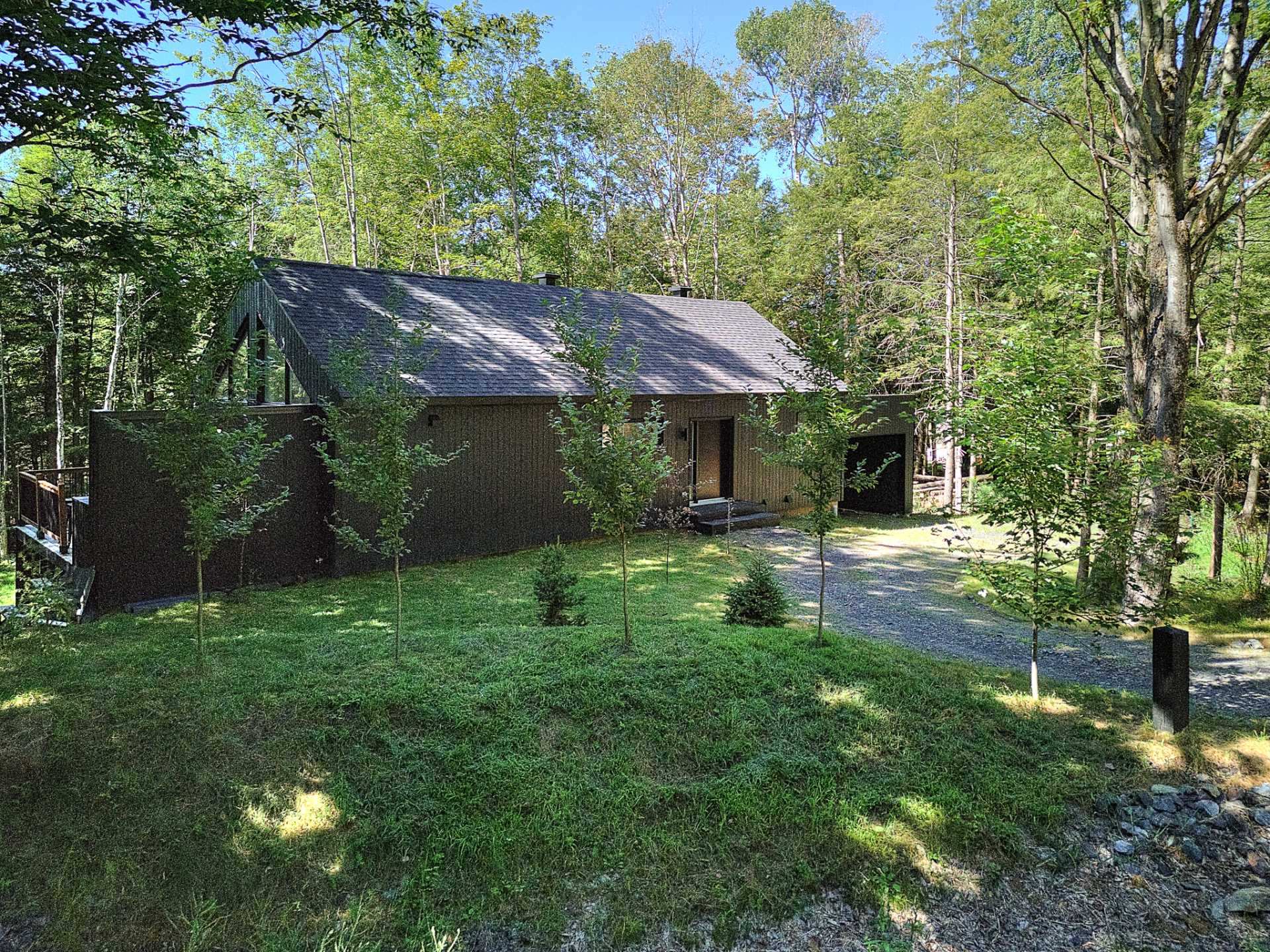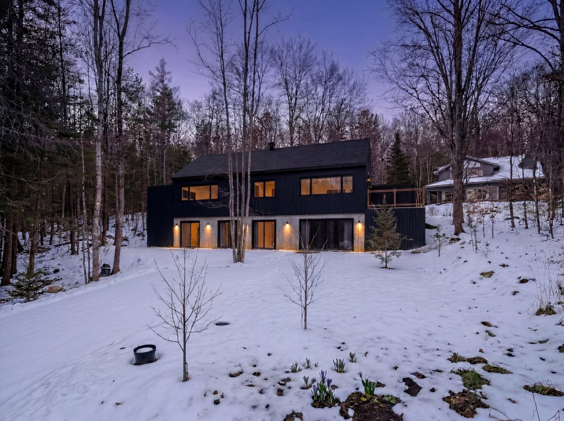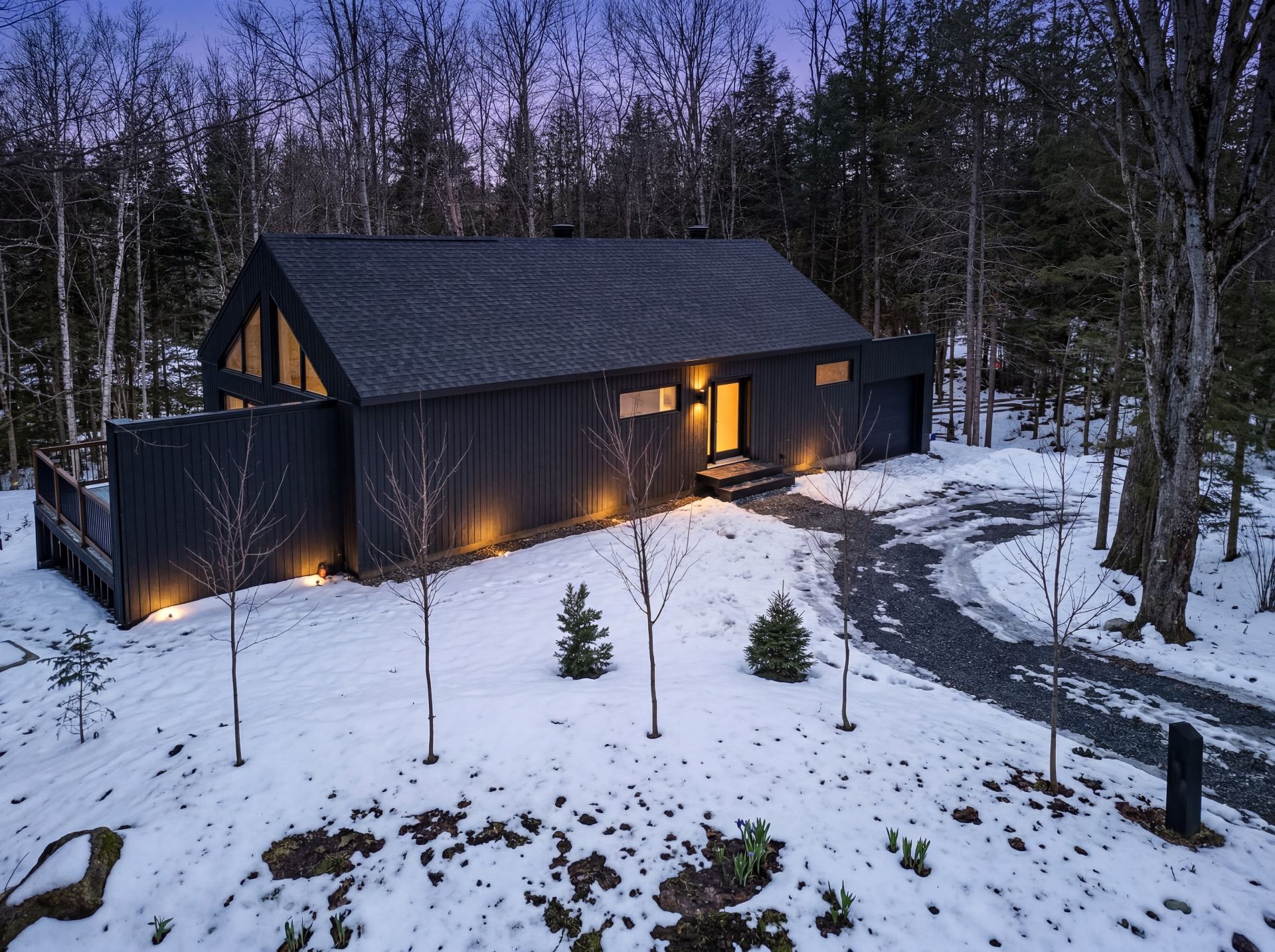 Discover a unique property combining Scandinavian design and modern comfort, nestled in the prestigious Domaine Mon-Louis in Sutton. This house, with its sleek, contemporary style, captivates at first glance thanks to its black exterior cladding and simple architectural lines, perfectly blending into the surrounding nature.