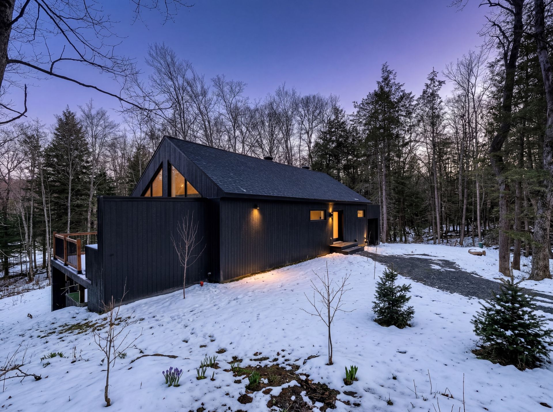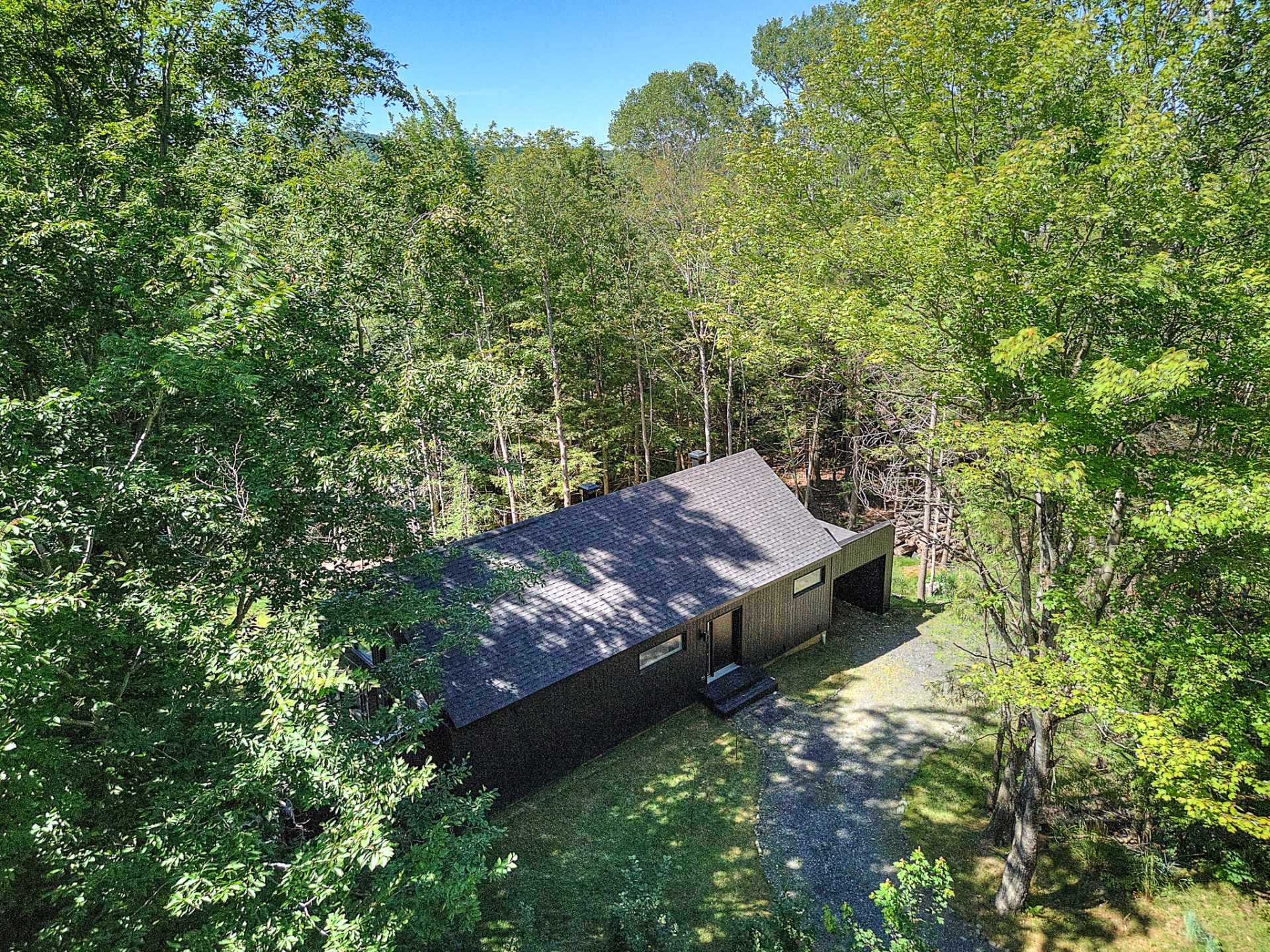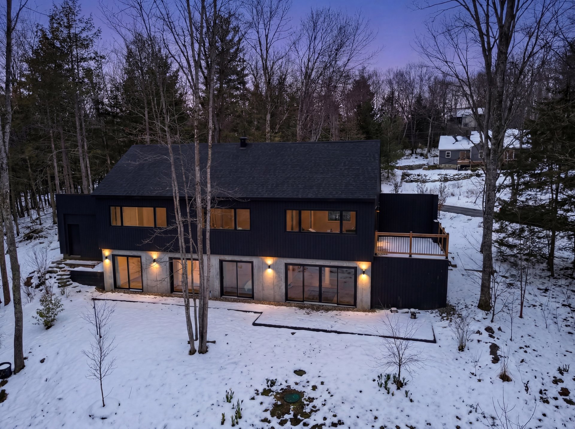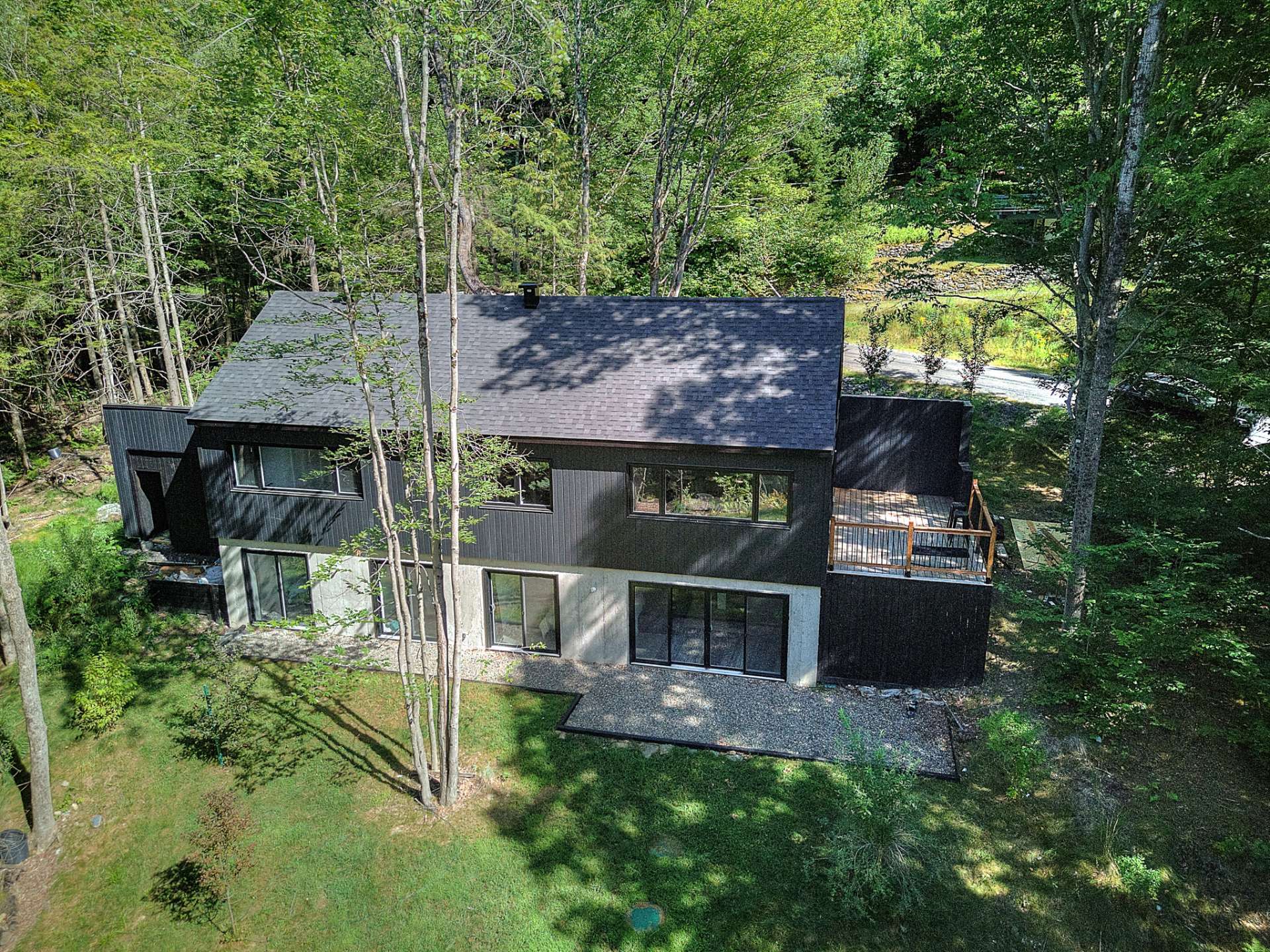 Discover a unique property combining Scandinavian design and modern comfort, nestled in the prestigious Domaine Mon-Louis in Sutton. This house, with its sleek, contemporary style, captivates at first glance thanks to its black exterior cladding and simple architectural lines, perfectly blending into the surrounding nature.