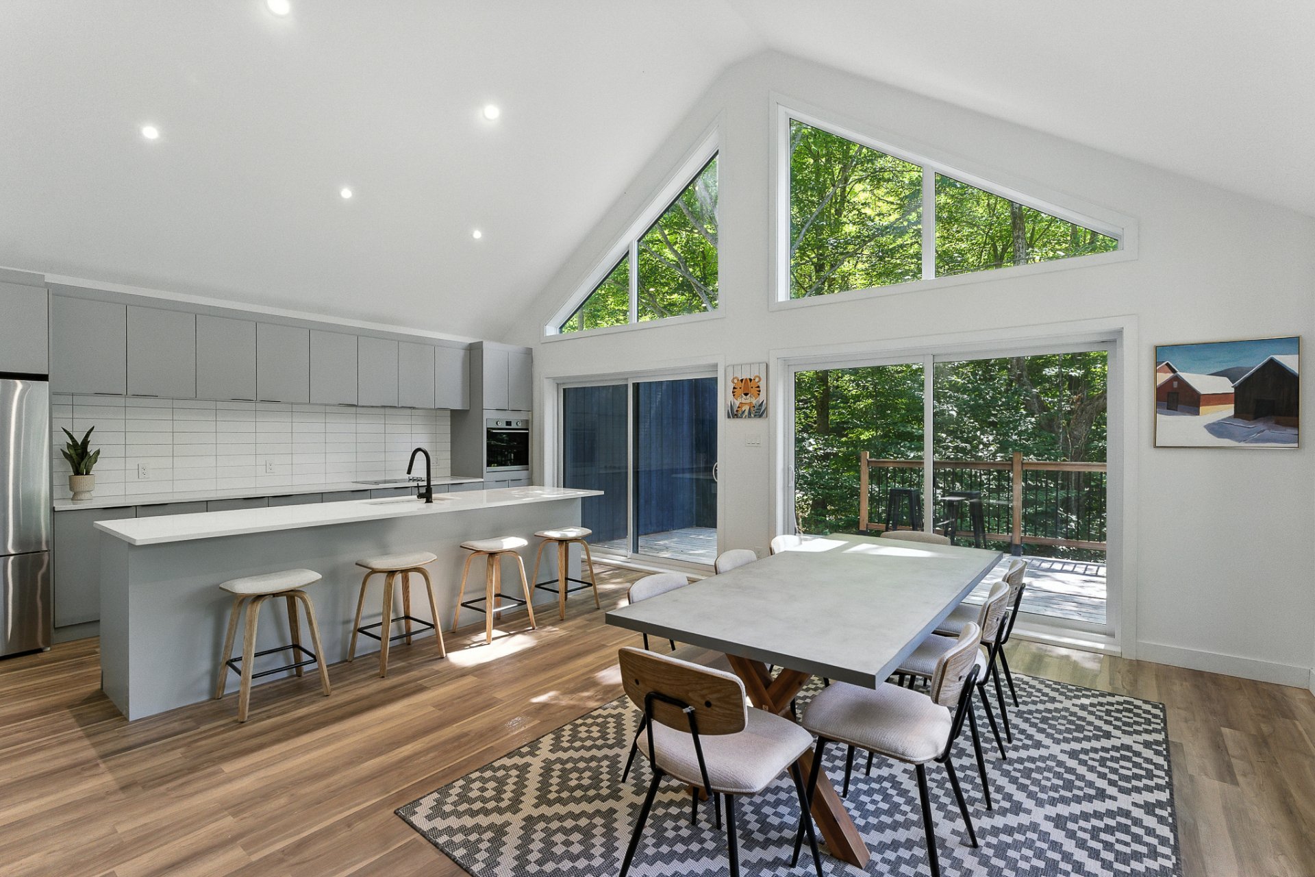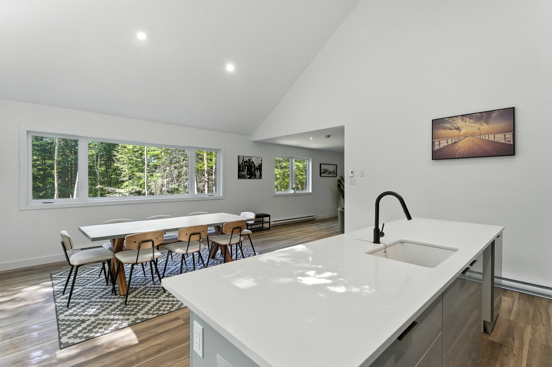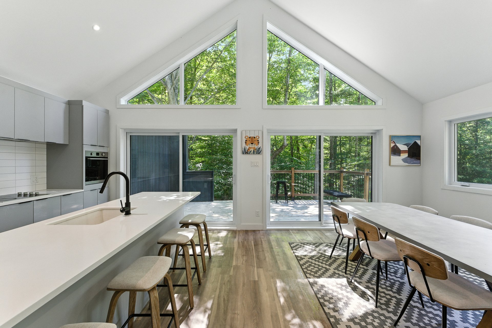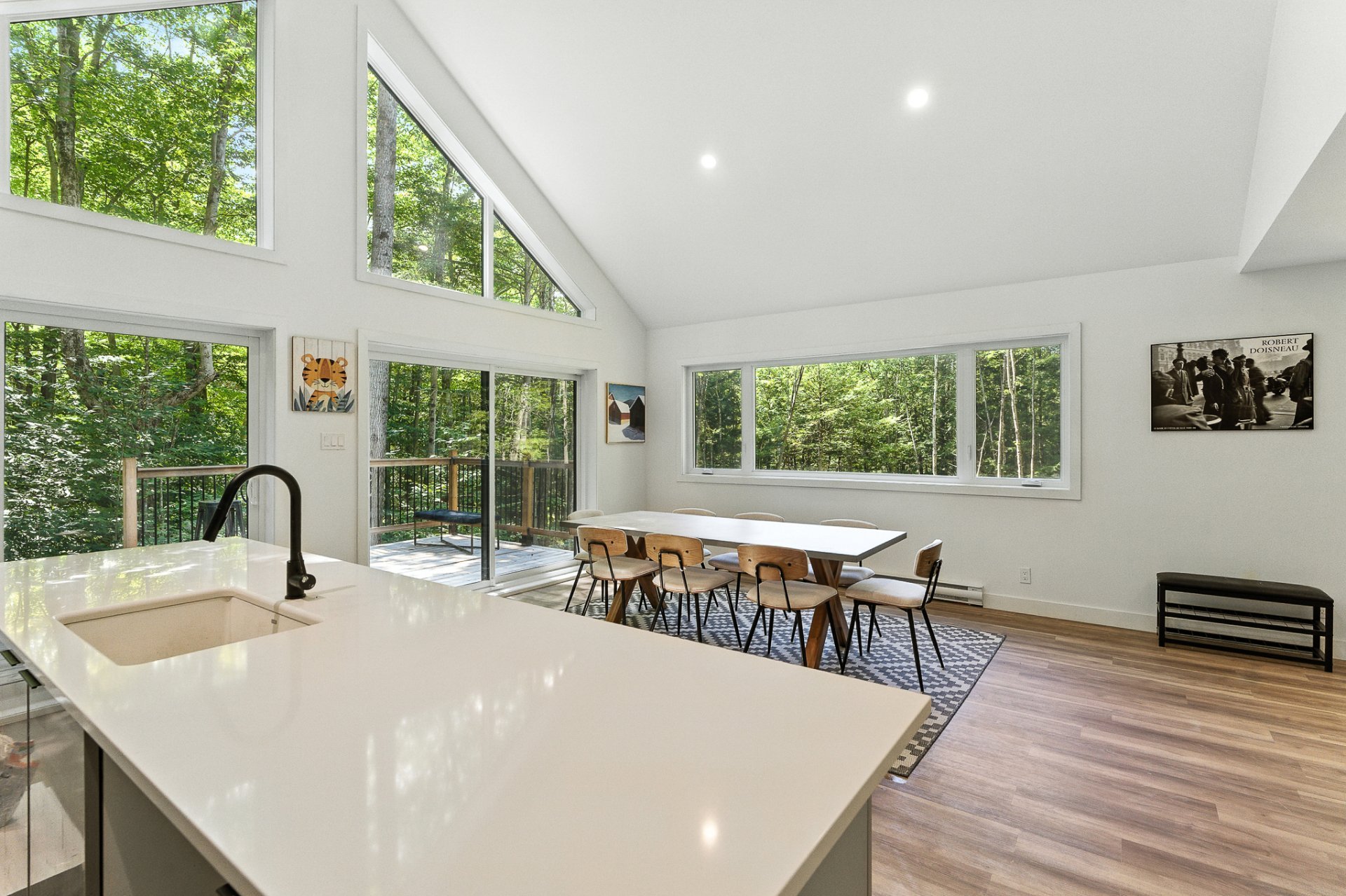 The interior offers a bright, open-concept living space, enhanced by large floor-to-ceiling windows that frame the forest and flood the rooms with natural light. The modern kitchen, with its central island and inviting lunch counter, opens onto the dining room and living room, creating a warm environment ideal for entertaining family and friends.