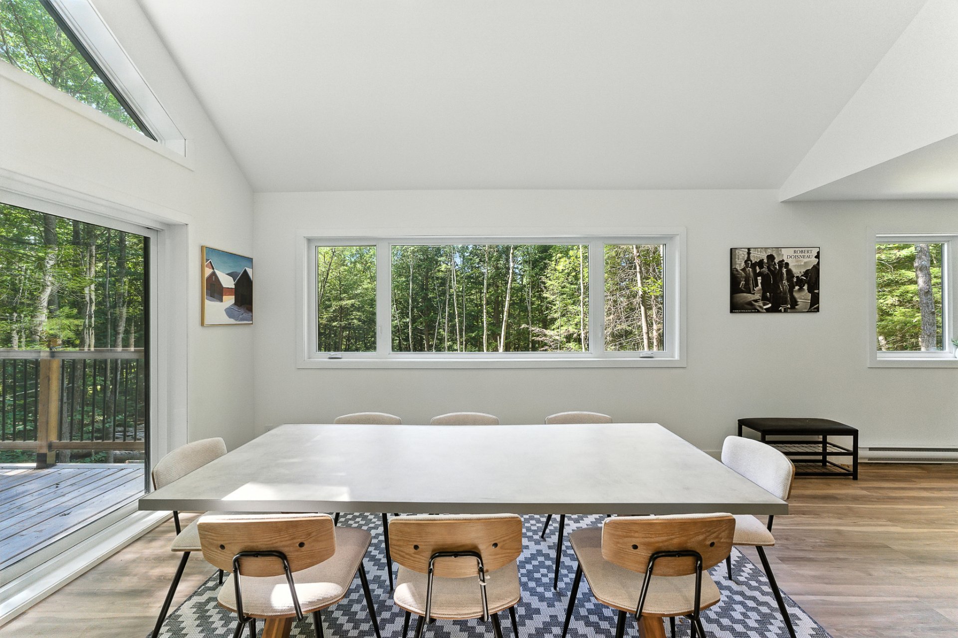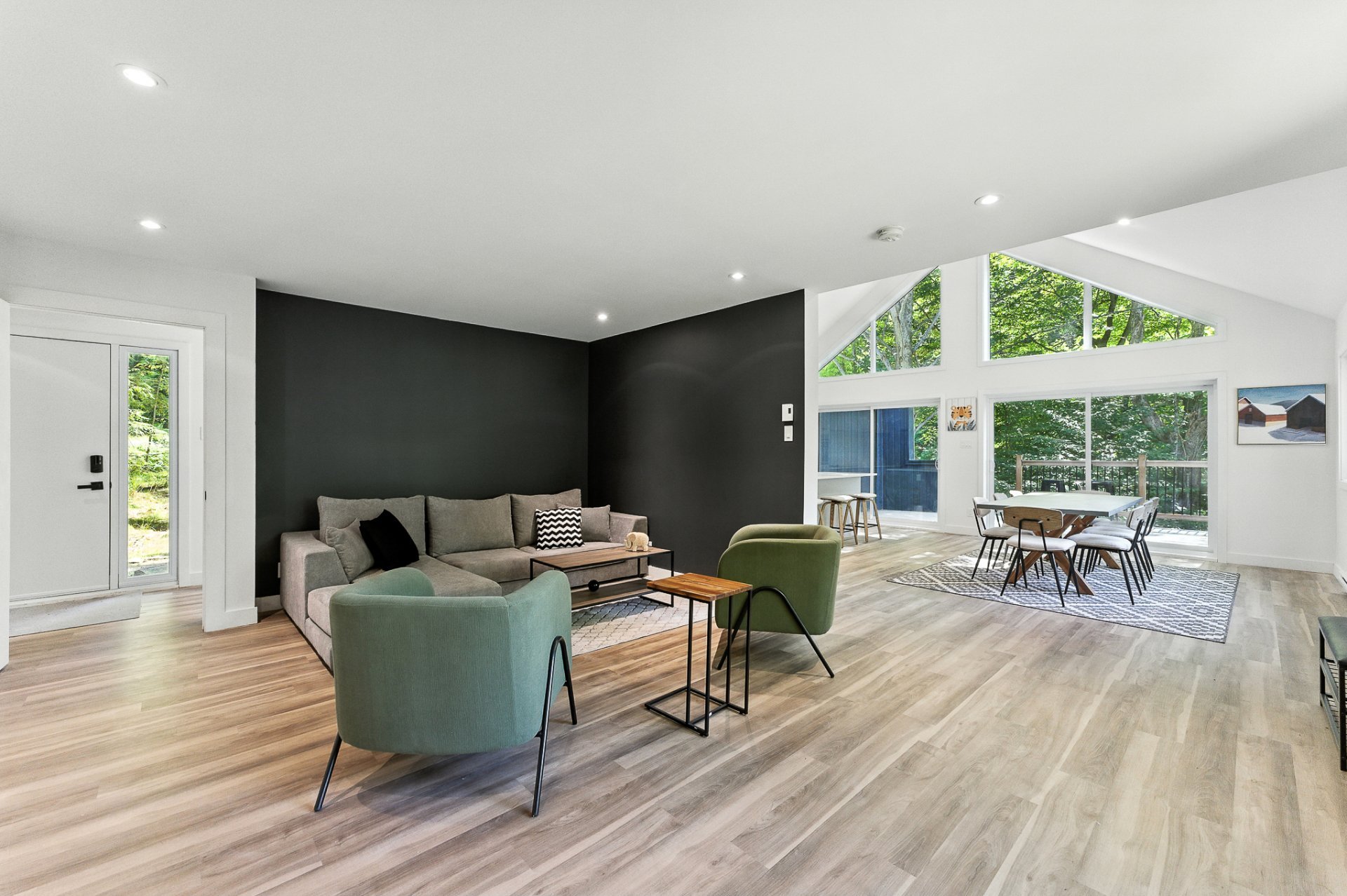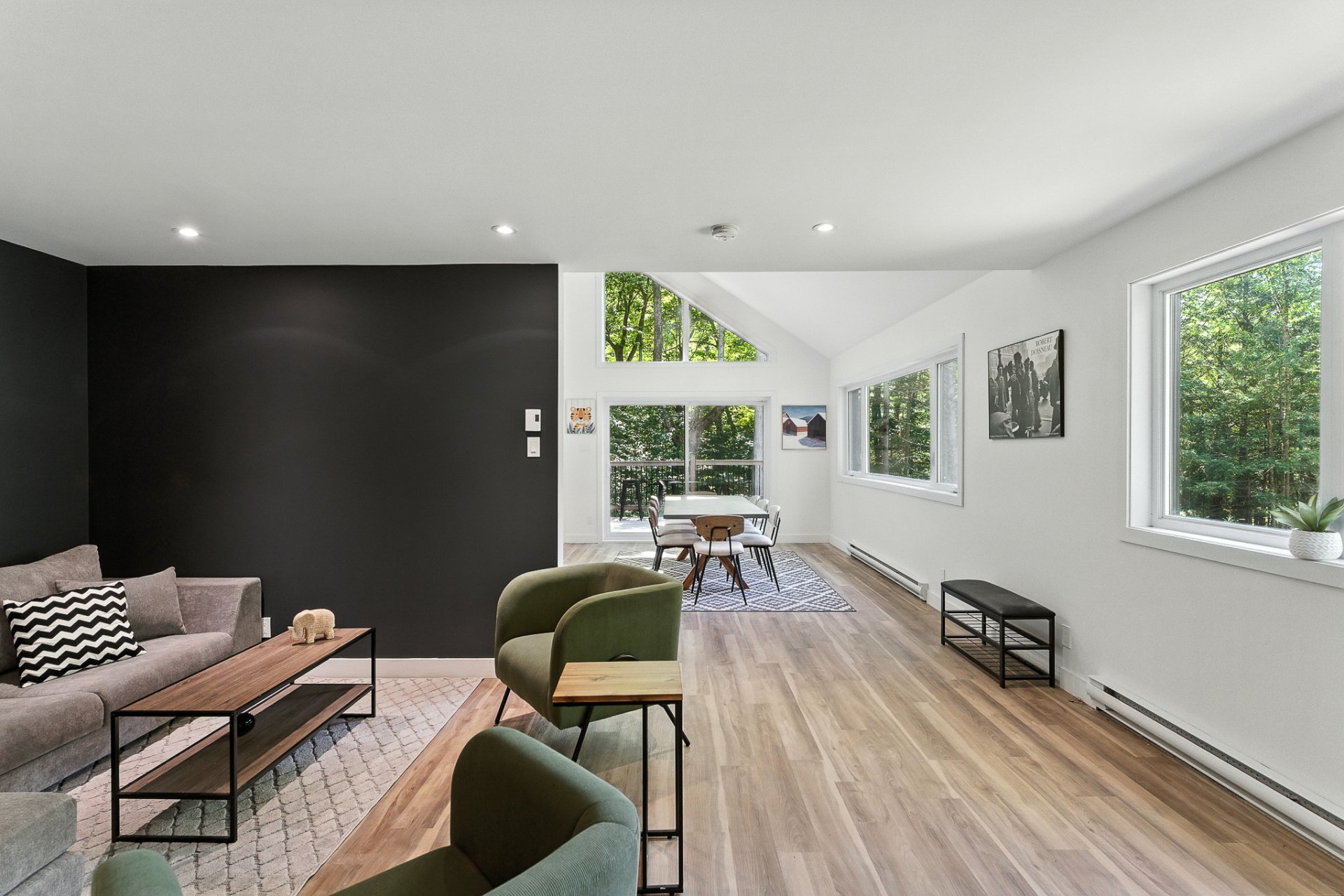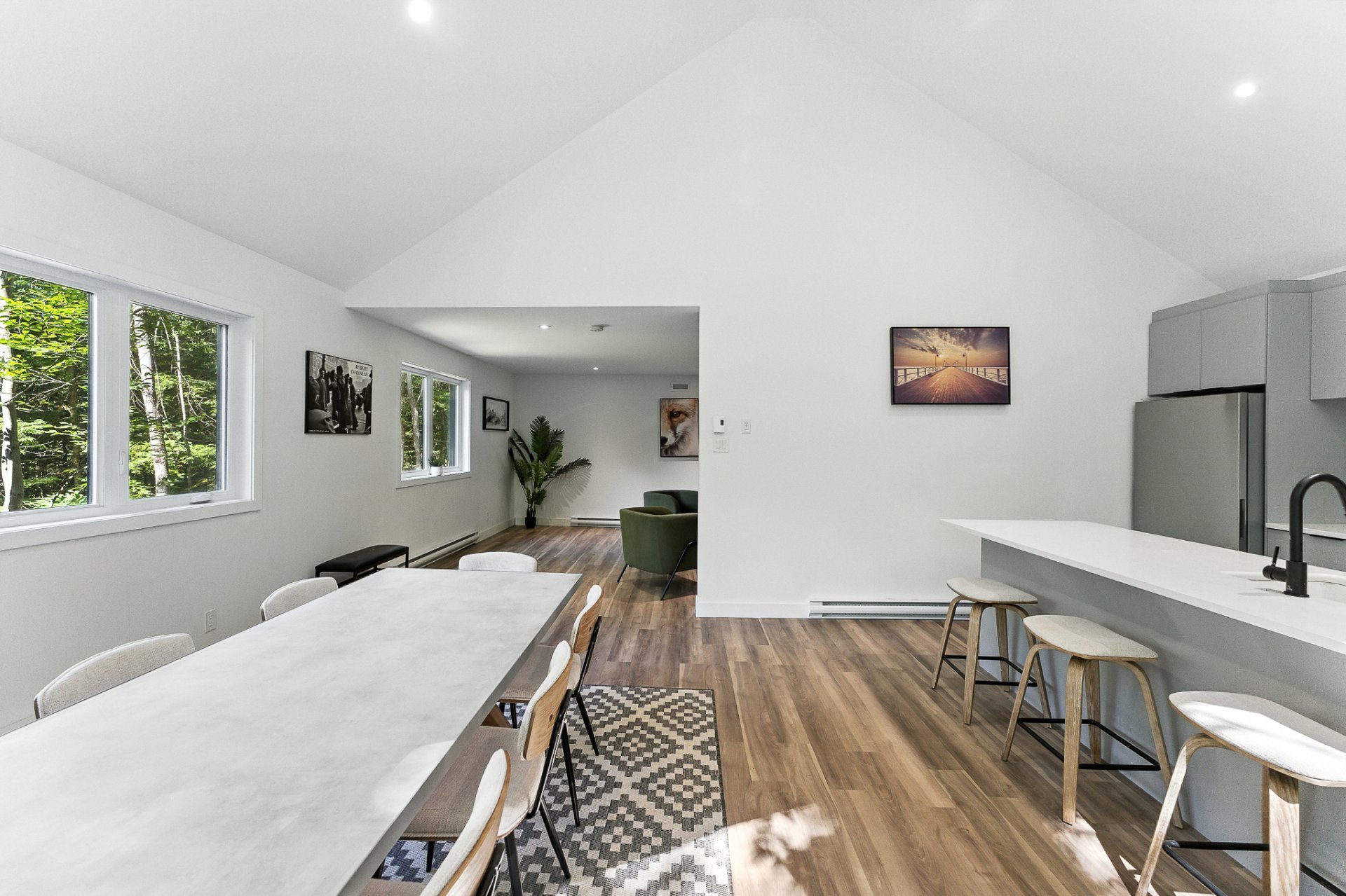 The interior offers a bright, open-concept living space, enhanced by large floor-to-ceiling windows that frame the forest and flood the rooms with natural light. The modern kitchen, with its central island and inviting lunch counter, opens onto the dining room and living room, creating a warm environment ideal for entertaining family and friends.