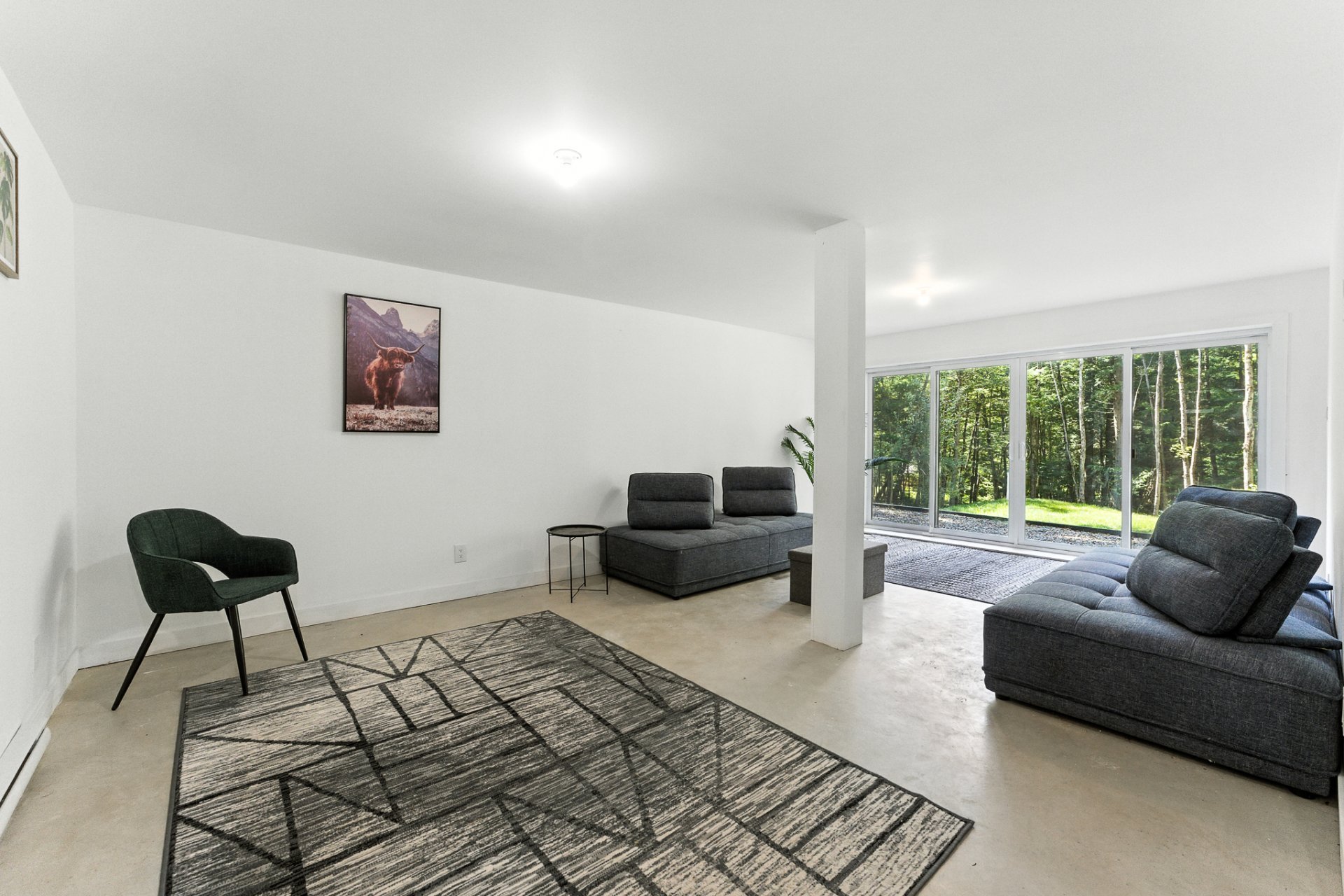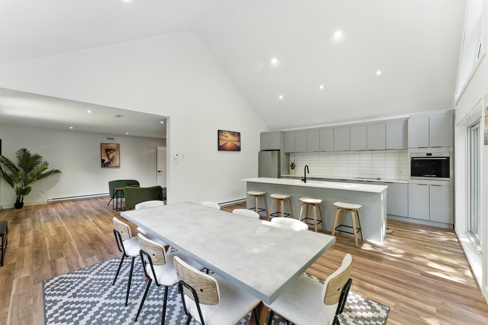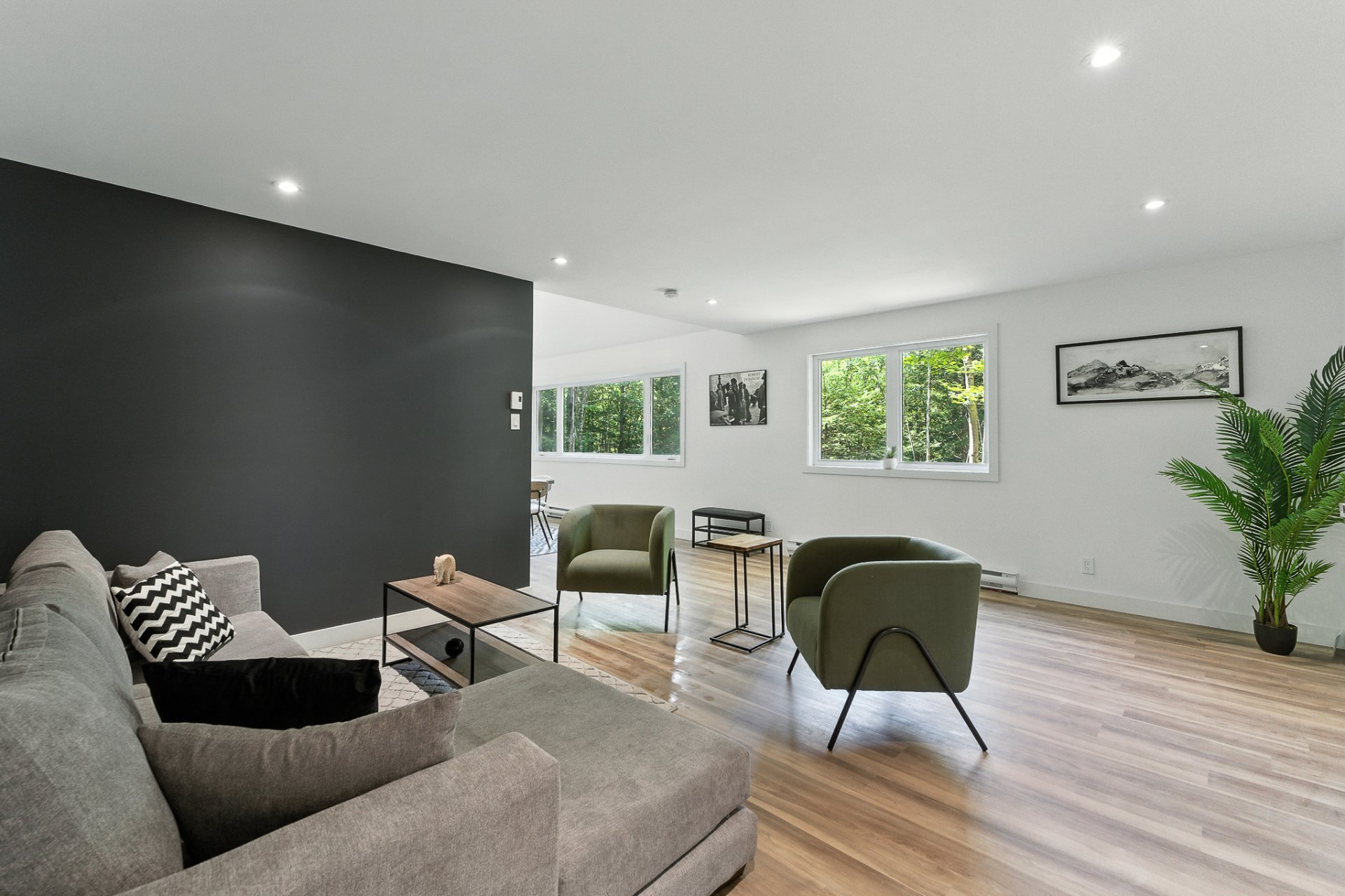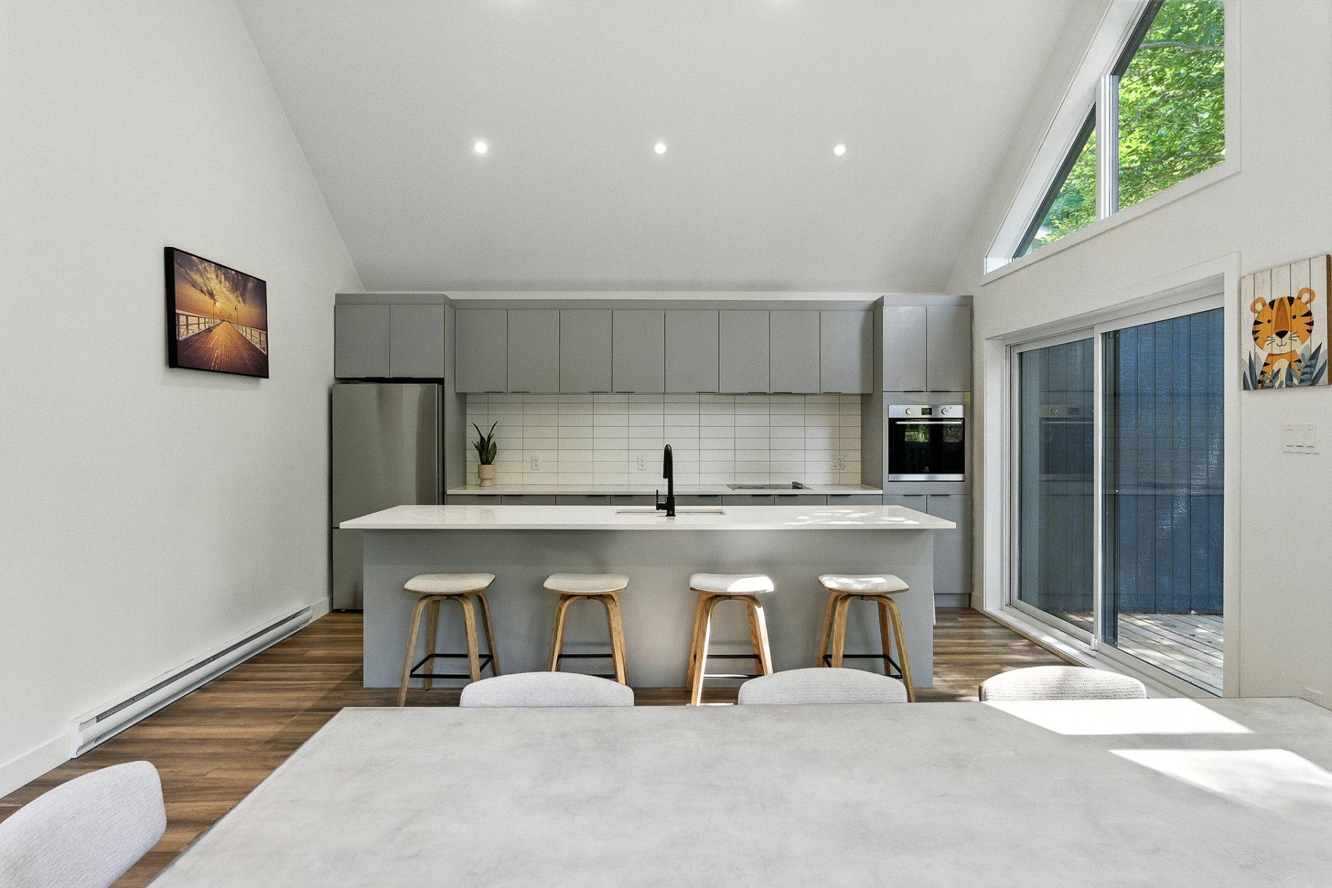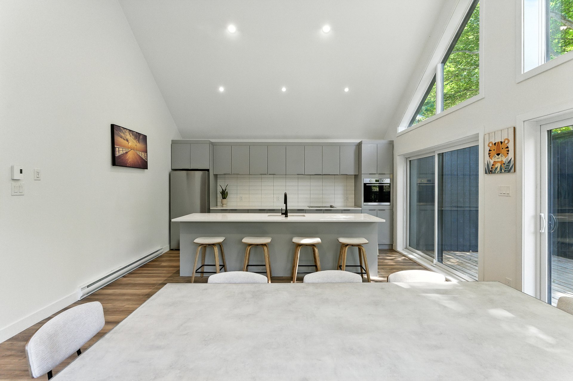 The interior offers a bright, open-concept living space, enhanced by large floor-to-ceiling windows that frame the forest and flood the rooms with natural light. The modern kitchen, with its central island and inviting lunch counter, opens onto the dining room and living room, creating a warm environment ideal for entertaining family and friends.