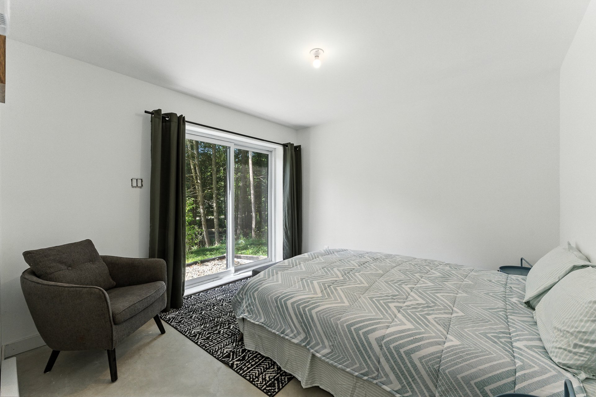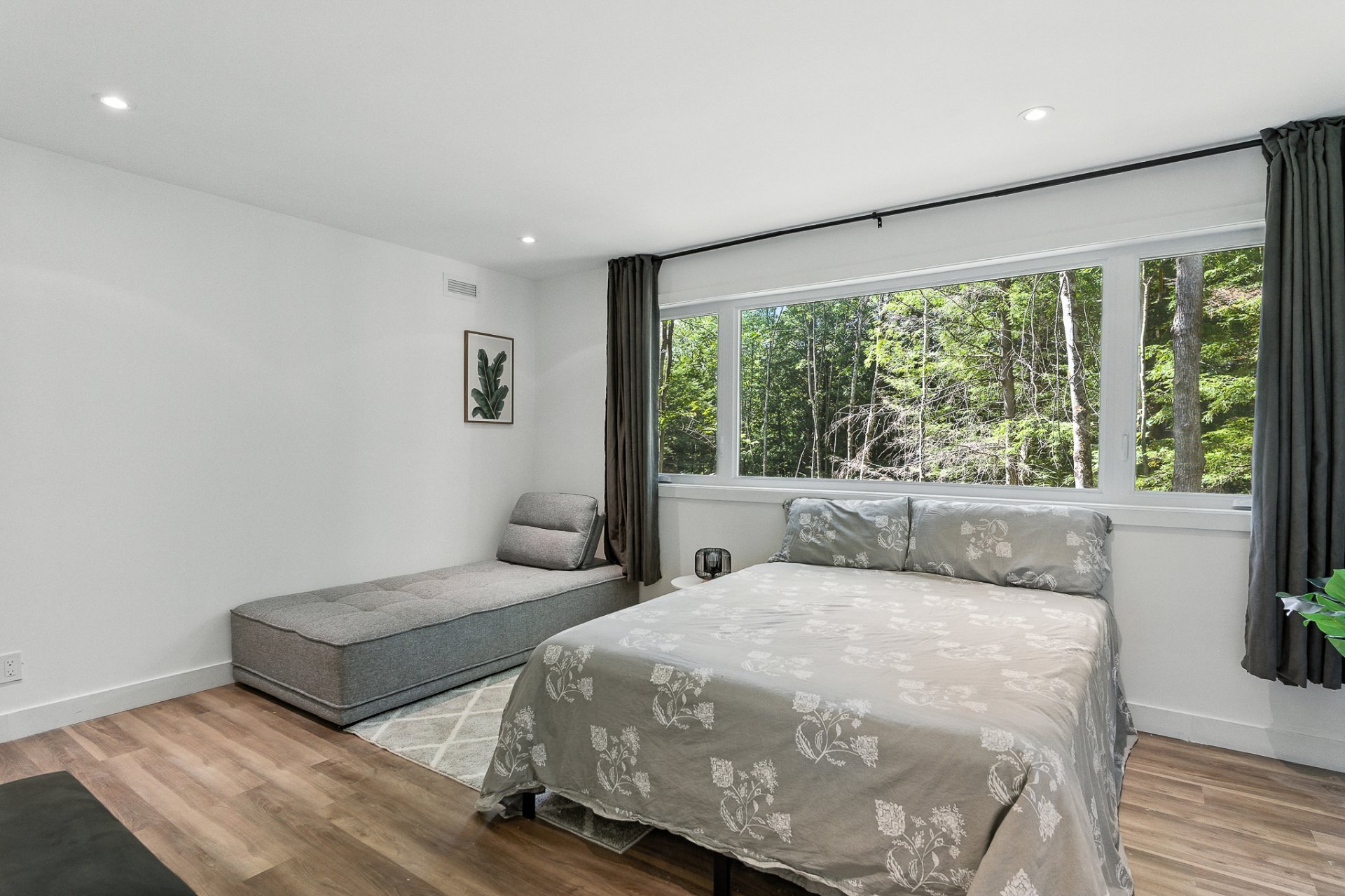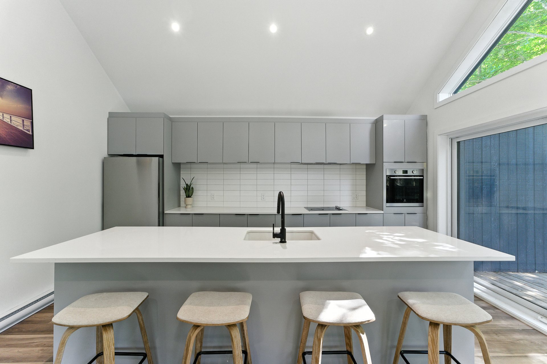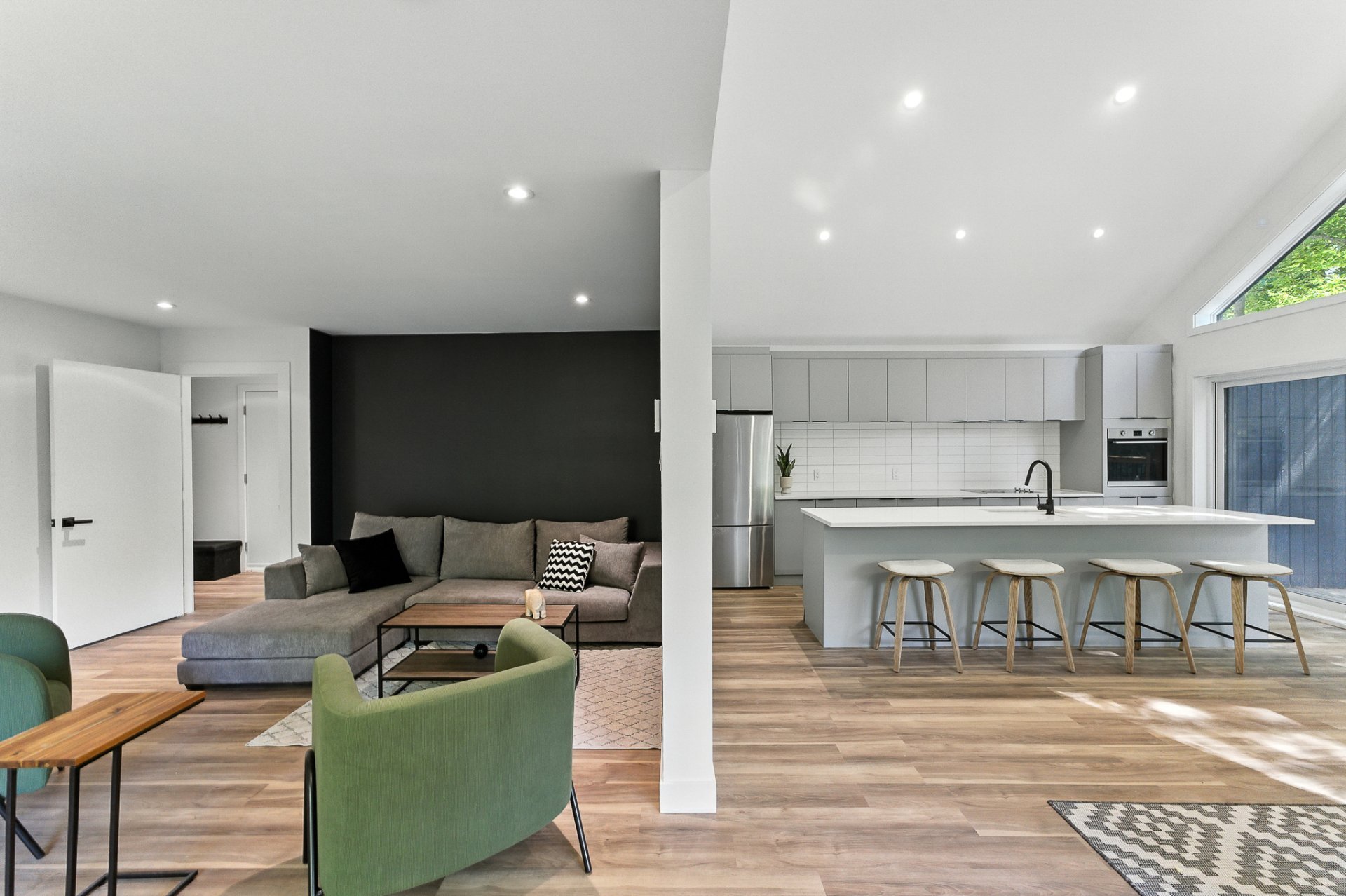 The interior offers a bright, open-concept living space, enhanced by large floor-to-ceiling windows that frame the forest and flood the rooms with natural light. The modern kitchen, with its central island and inviting lunch counter, opens onto the dining room and living room, creating a warm environment ideal for entertaining family and friends.