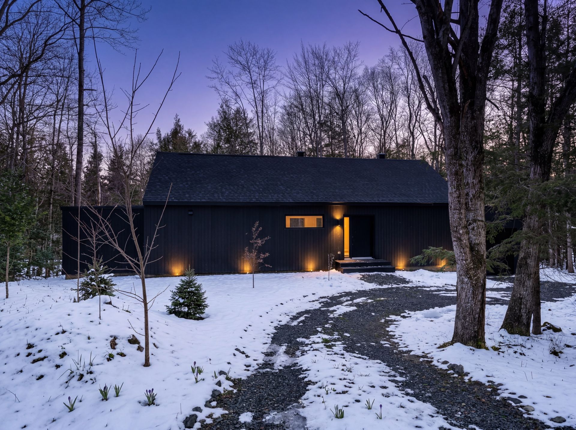 Located in the heart of Domaine Mon-Louis, this elegant Scandinavian home with black siding offers 4 bedrooms, 2 bathrooms, and 1 powder room. Its open concept, large windows, and light-filled garden-level basement create a warm and modern setting. Halfway between the picturesque village of Sutton and the ski mountain, enjoy a sought-after setting with trails and a private lake nearby.