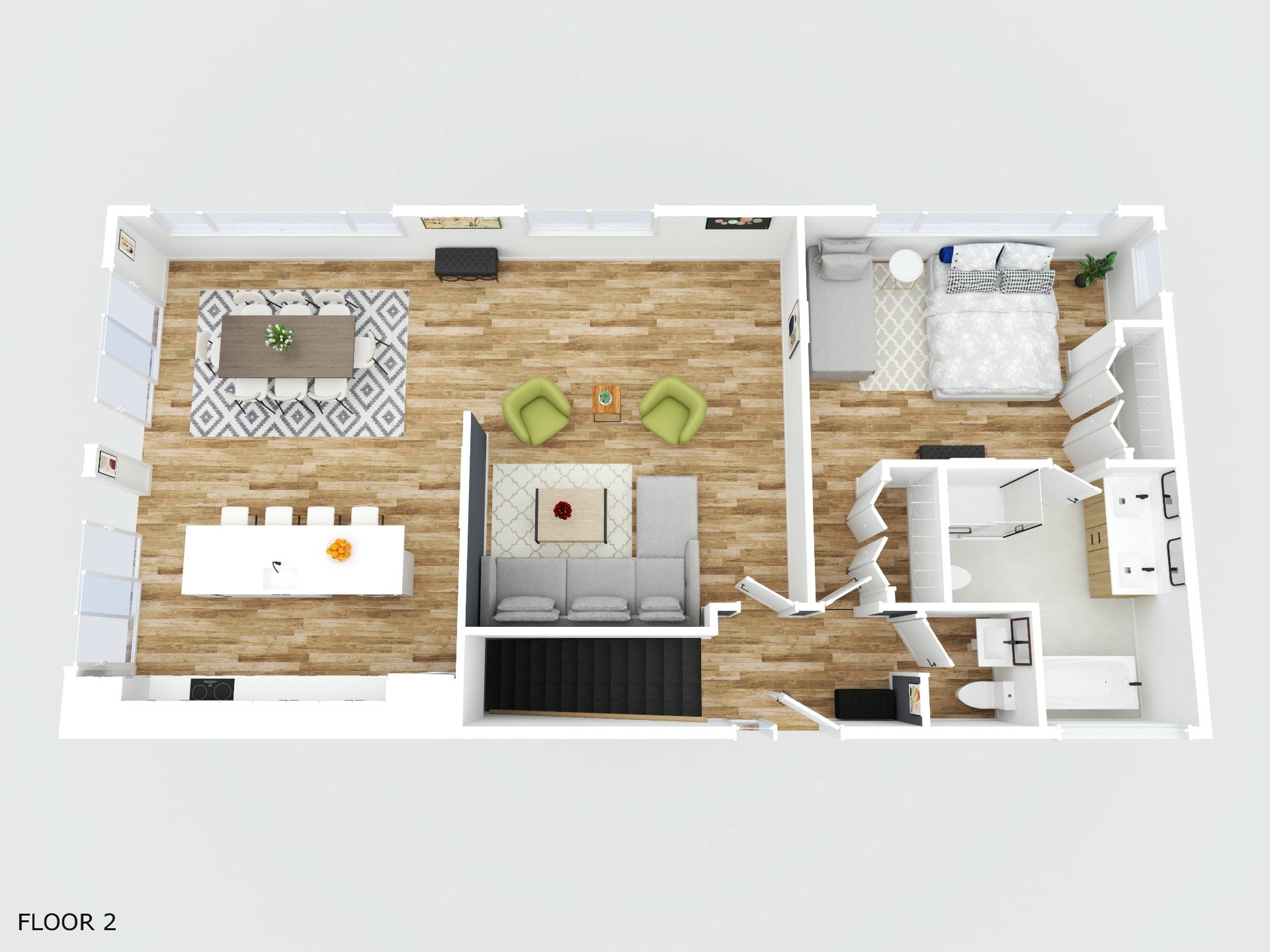 - Bright open concept with high ceilings and large windows