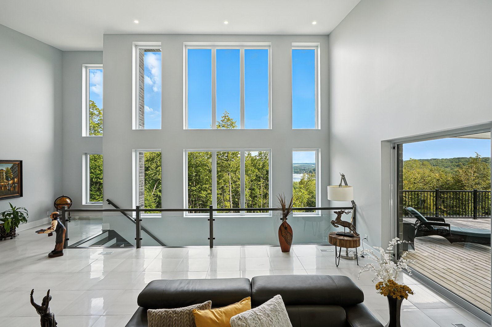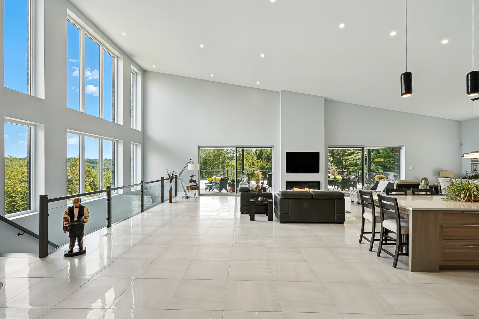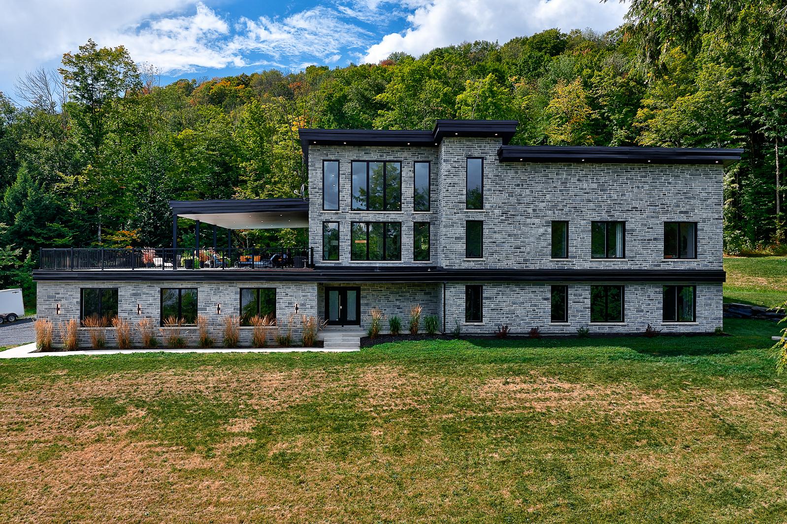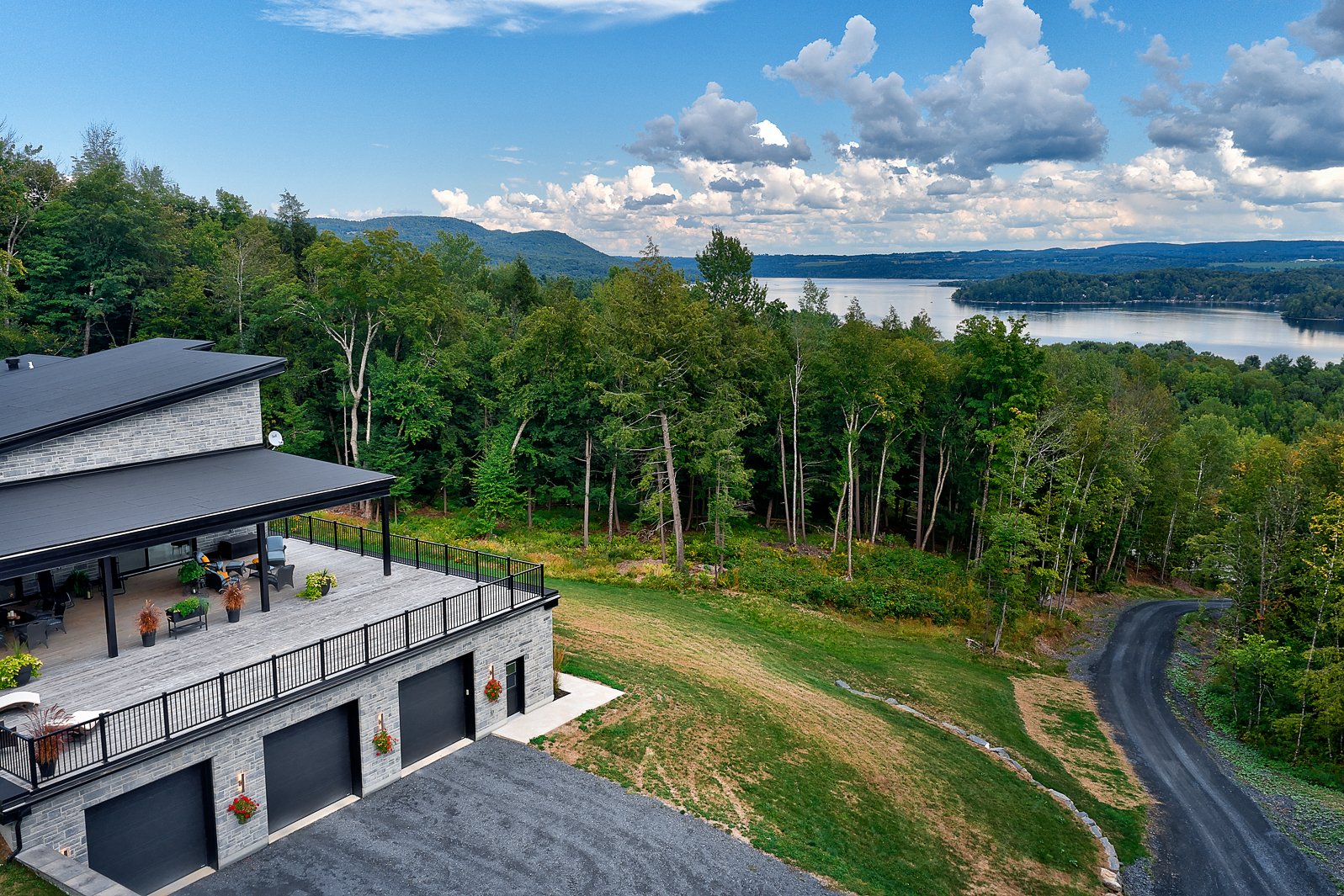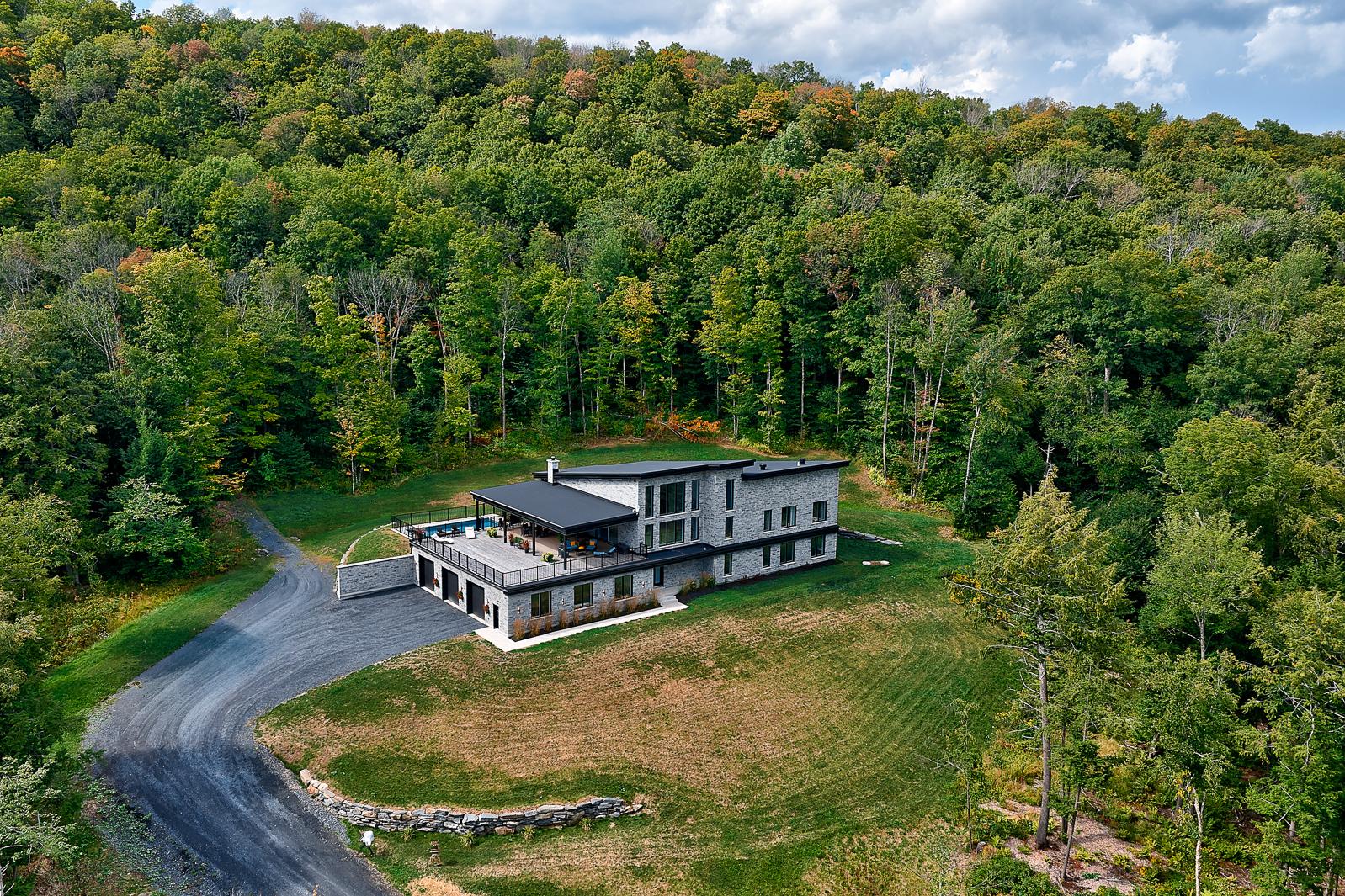 Residence built in 2021 with NUDURA insulated concrete forms and full stone cladding on all four façades, set on 5.8 private acres in Sainte-Catherine-de-Hatley, next to Ayer's Cliff and with easy highway access. Offering ±6,800 sq.ft. of living space, it features oversized garages, radiant heated floors, and a living room with 20-ft ceilings and abundant windows. The expansive terrace and covered balcony extend the interiors toward panoramic views of Lake Massawippi. In-ground pool, three bedrooms, and a garden level ready to be customized. An exceptional property awaiting its next owners.