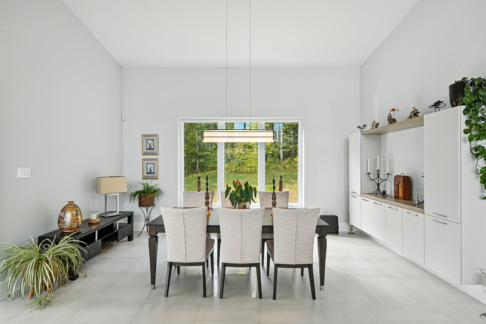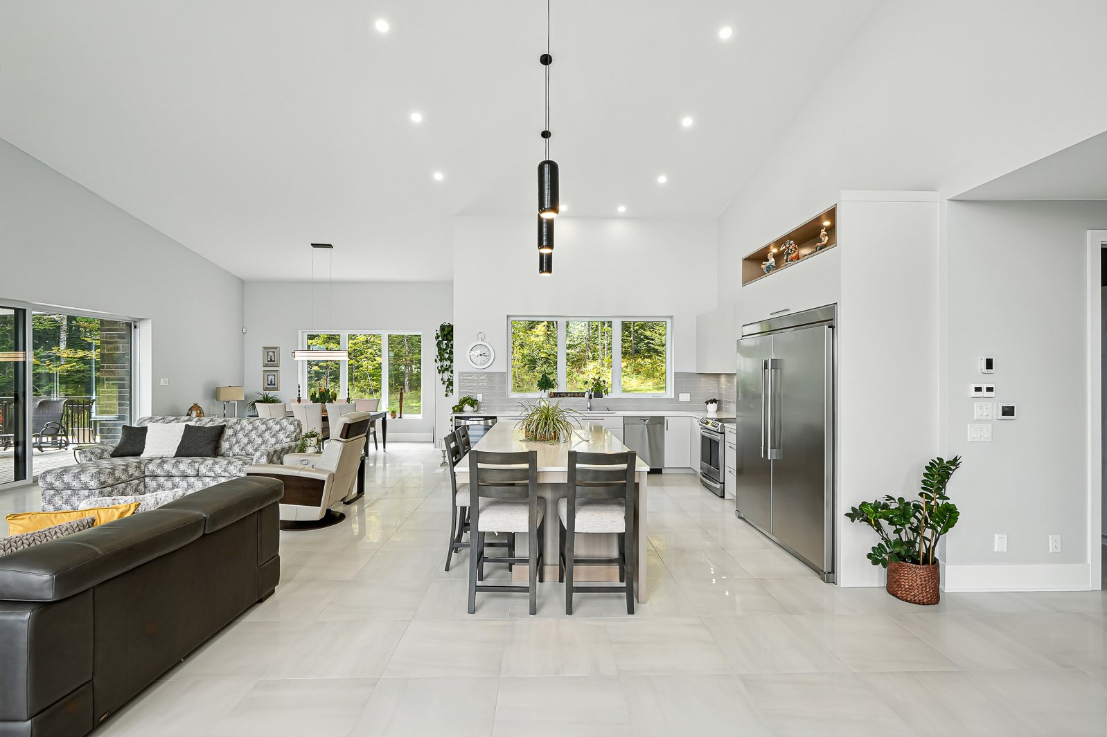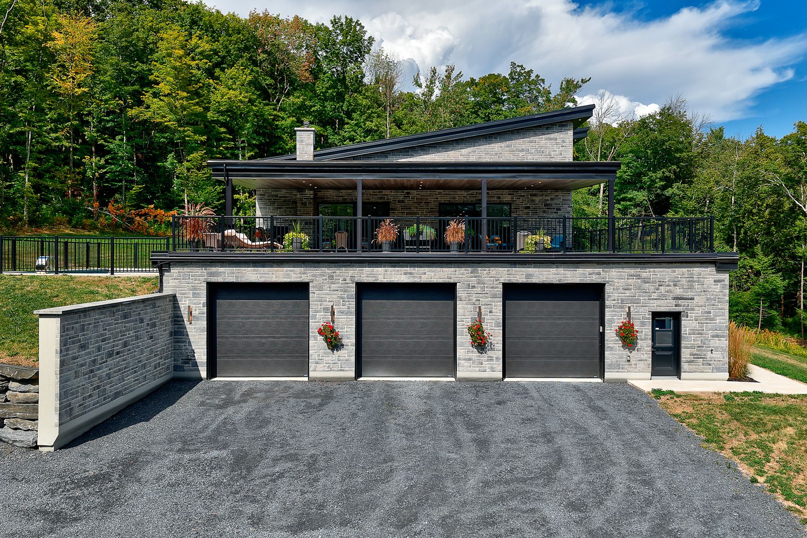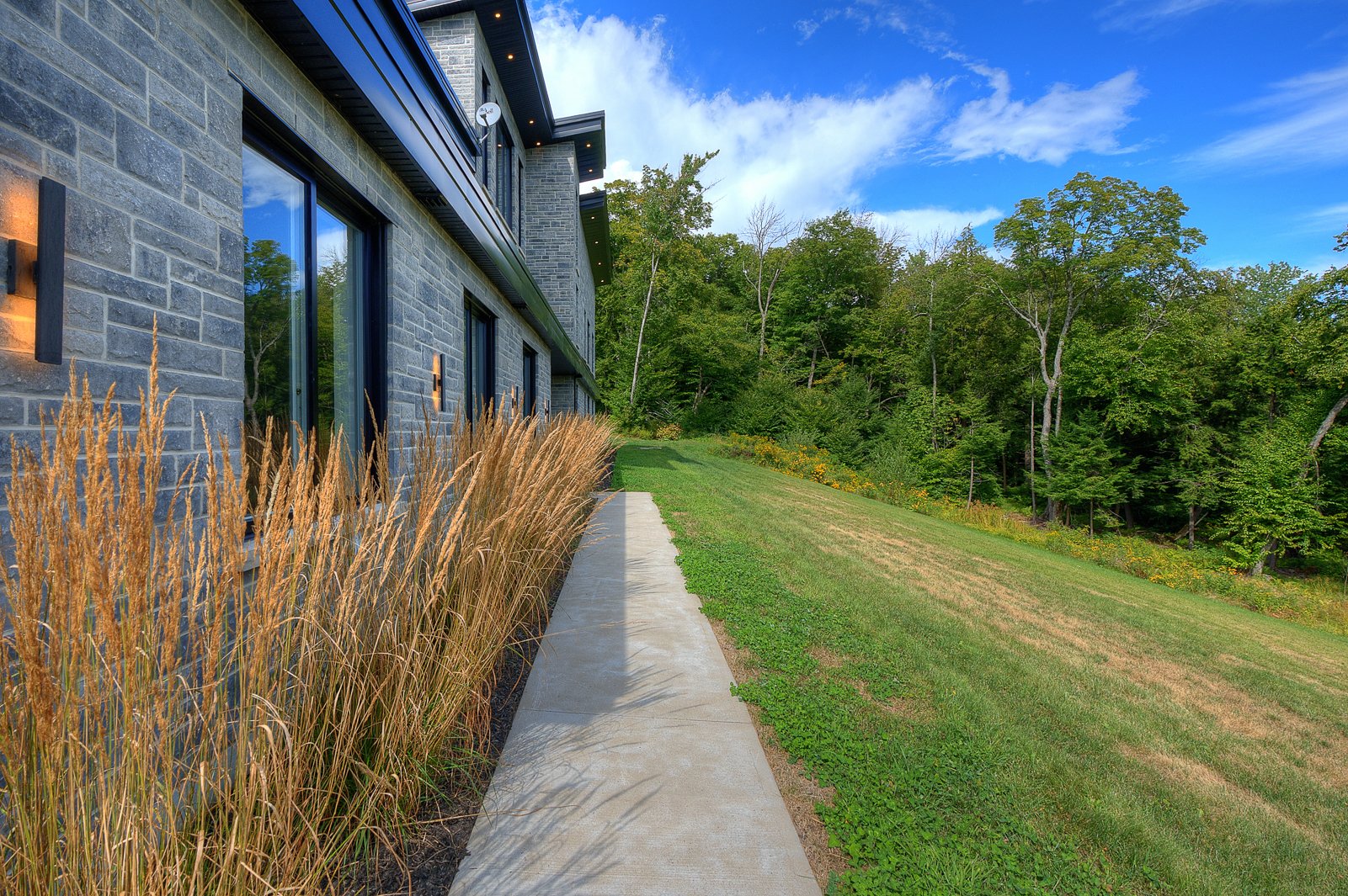 Residence built in 2021 with NUDURA insulated concrete forms and full stone cladding on all four façades, set on 5.8 private acres in Sainte-Catherine-de-Hatley, next to Ayer's Cliff and with easy highway access. Offering ±6,800 sq.ft. of living space, it features oversized garages, radiant heated floors, and a living room with 20-ft ceilings and abundant windows. The expansive terrace and covered balcony extend the interiors toward panoramic views of Lake Massawippi. In-ground pool, three bedrooms, and a garden level ready to be customized. An exceptional property awaiting its next owners.
