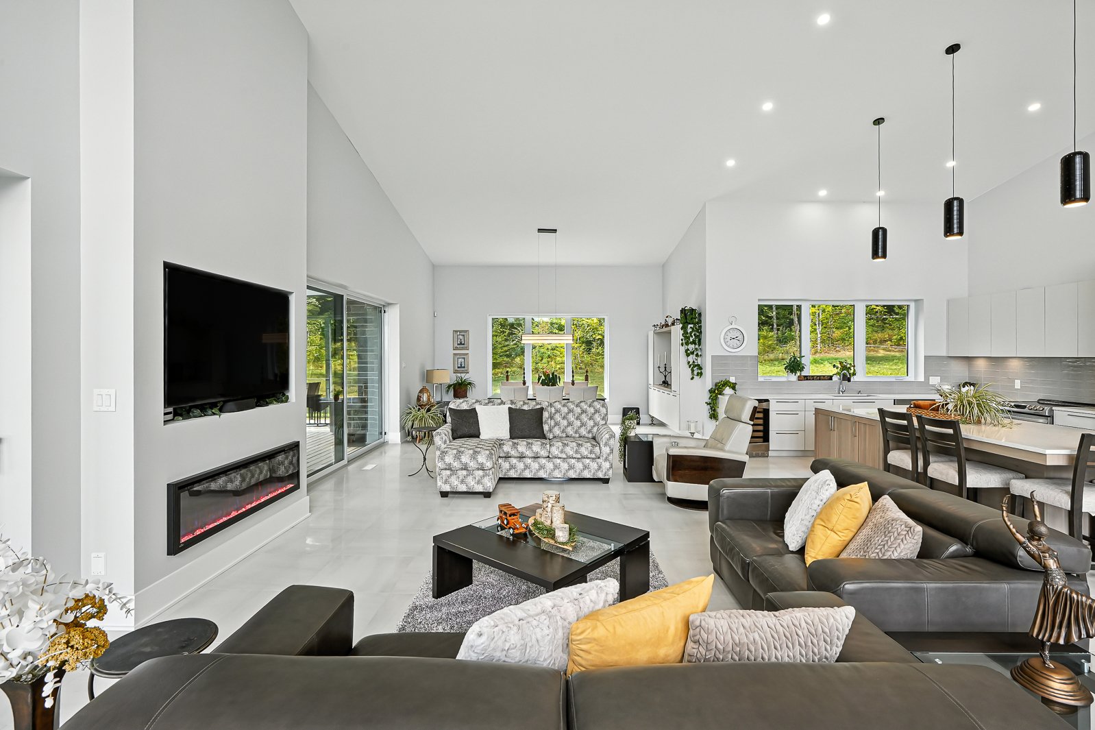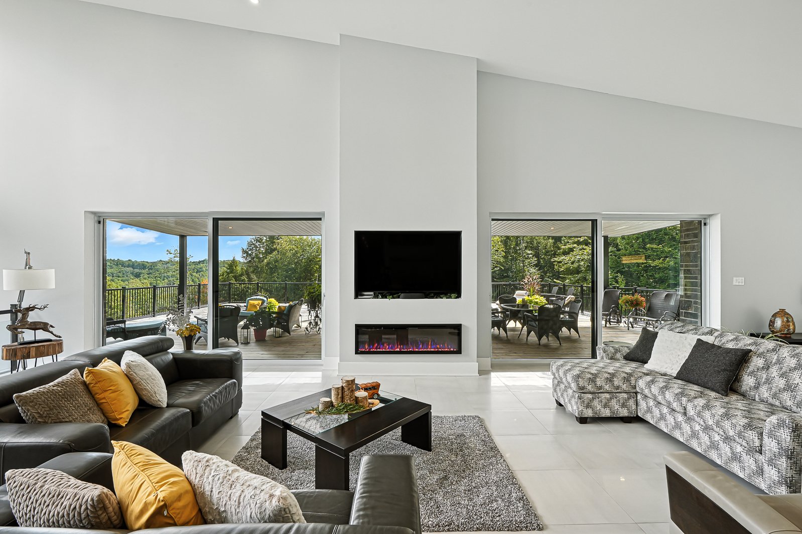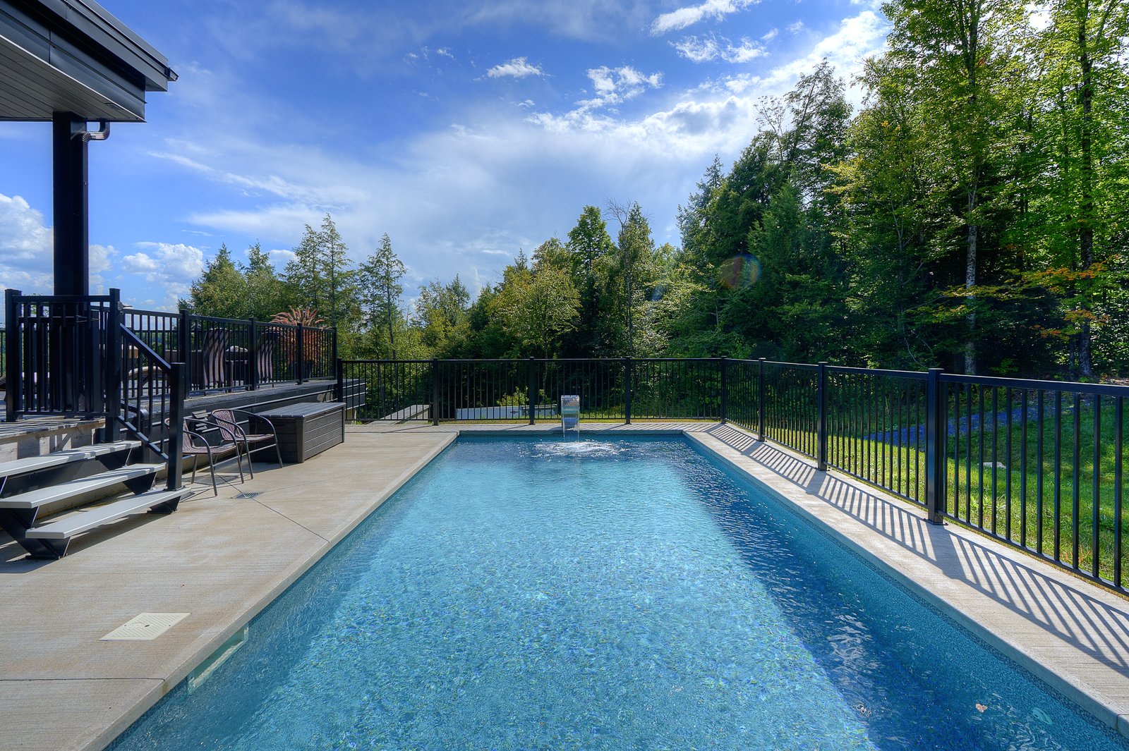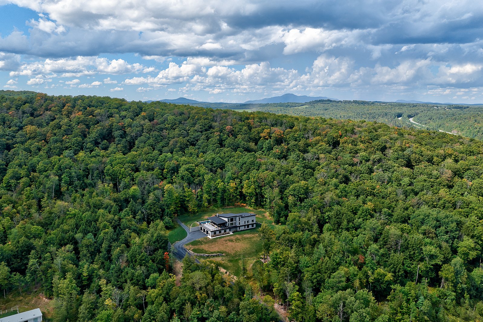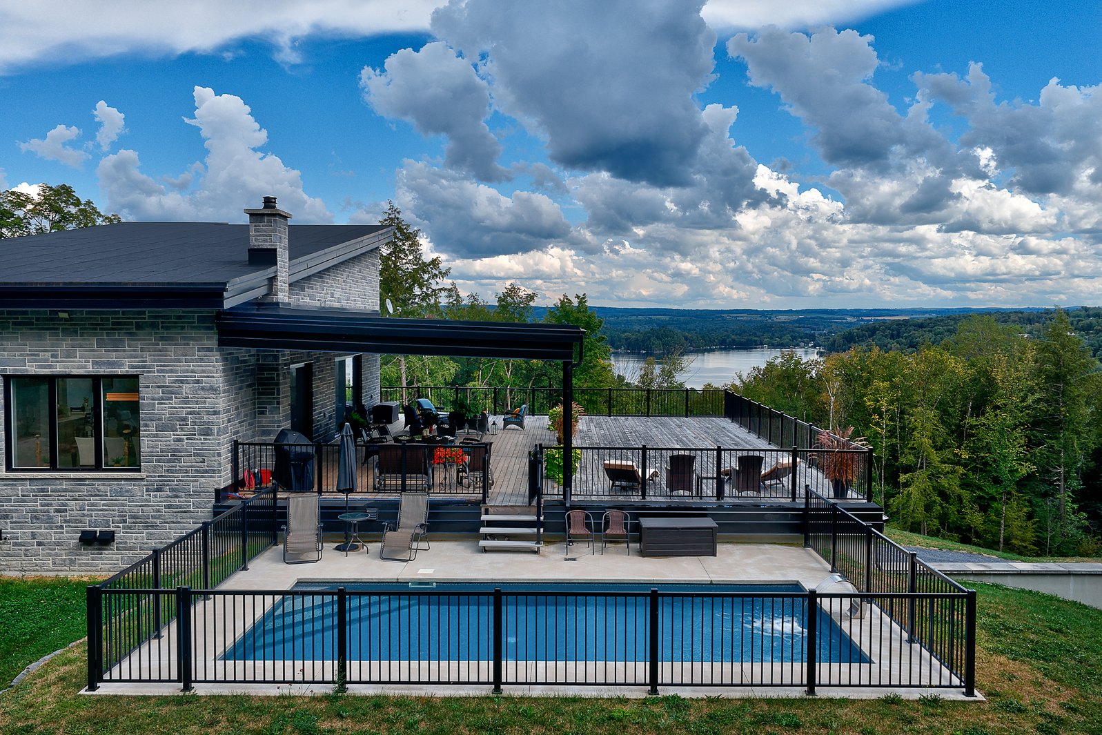 Residence built in 2021 with NUDURA insulated concrete forms and full stone cladding on all four façades, set on 5.8 private acres in Sainte-Catherine-de-Hatley, next to Ayer's Cliff and with easy highway access. Offering ±6,800 sq.ft. of living space, it features oversized garages, radiant heated floors, and a living room with 20-ft ceilings and abundant windows. The expansive terrace and covered balcony extend the interiors toward panoramic views of Lake Massawippi. In-ground pool, three bedrooms, and a garden level ready to be customized. An exceptional property awaiting its next owners.