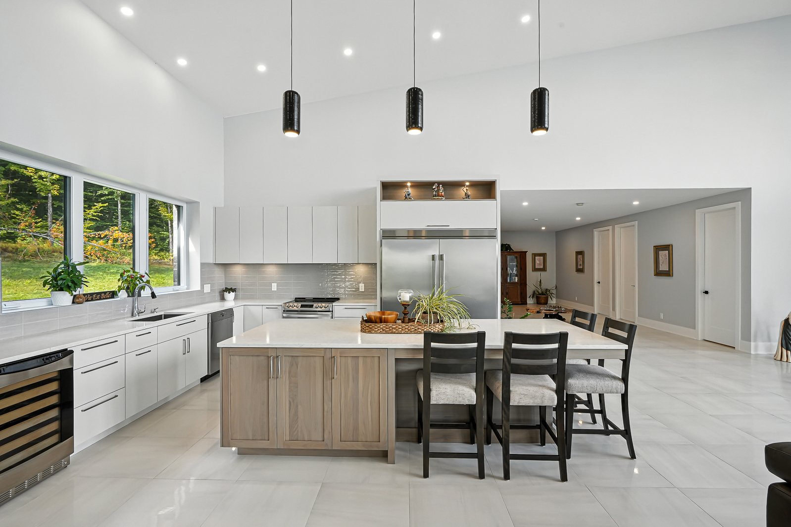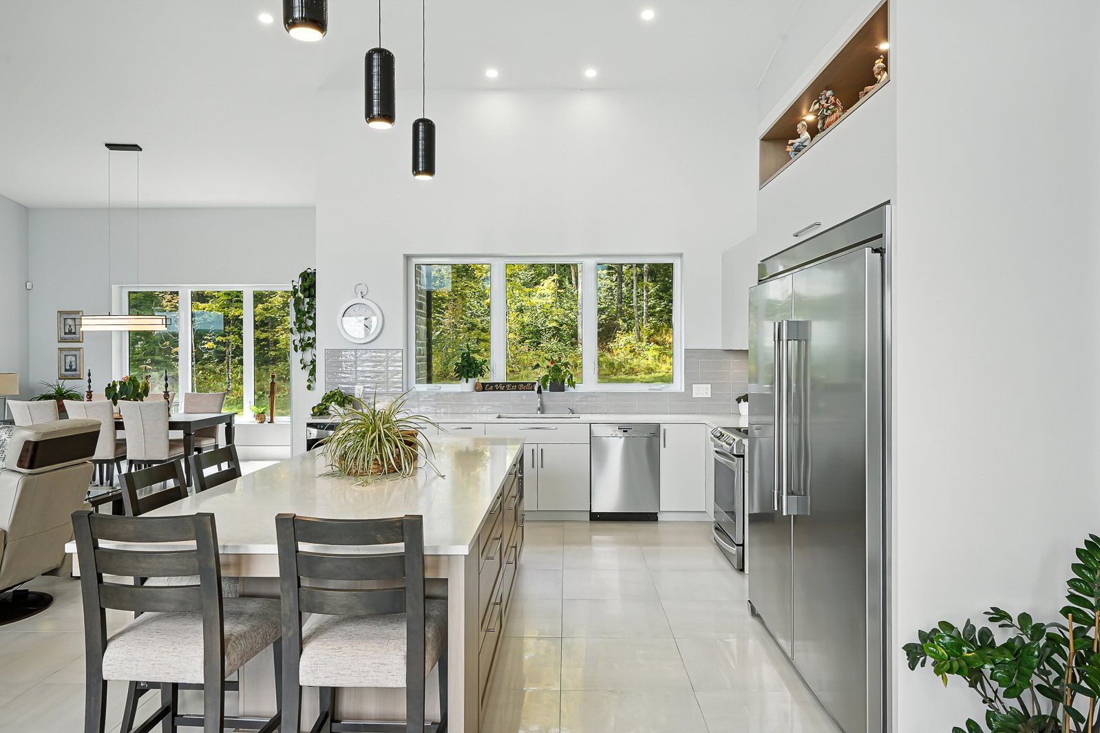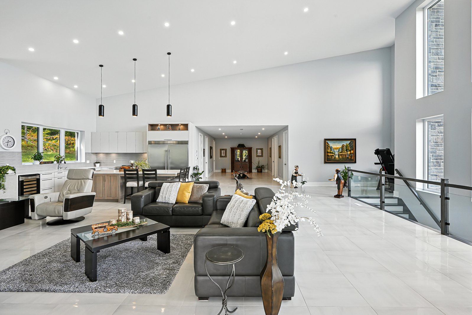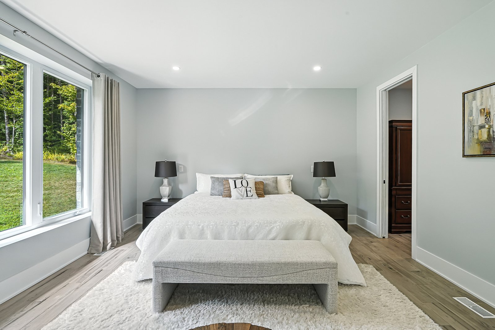 Residence built in 2021 with NUDURA insulated concrete forms and full stone cladding on all four façades, set on 5.8 private acres in Sainte-Catherine-de-Hatley, next to Ayer's Cliff and with easy highway access. Offering ±6,800 sq.ft. of living space, it features oversized garages, radiant heated floors, and a living room with 20-ft ceilings and abundant windows. The expansive terrace and covered balcony extend the interiors toward panoramic views of Lake Massawippi. In-ground pool, three bedrooms, and a garden level ready to be customized. An exceptional property awaiting its next owners.