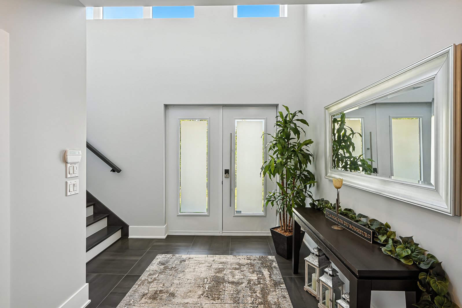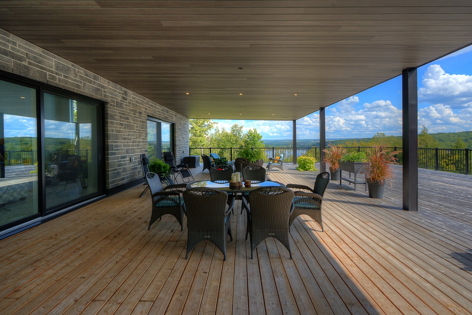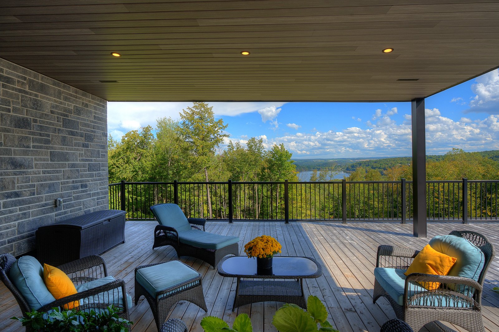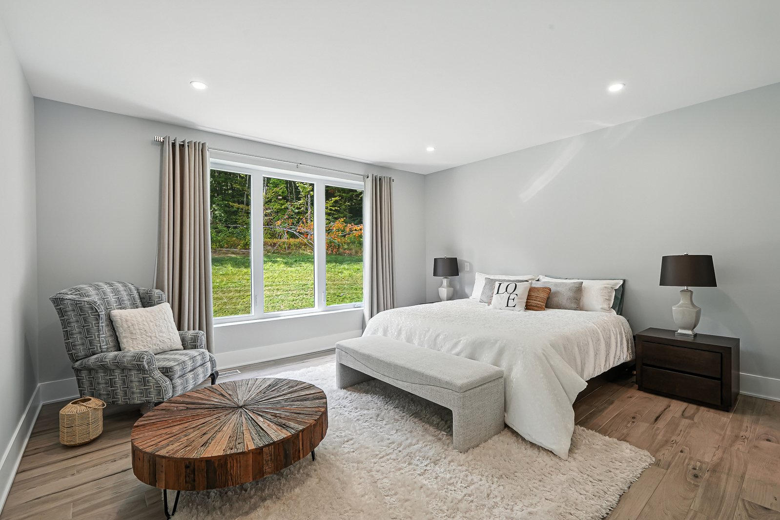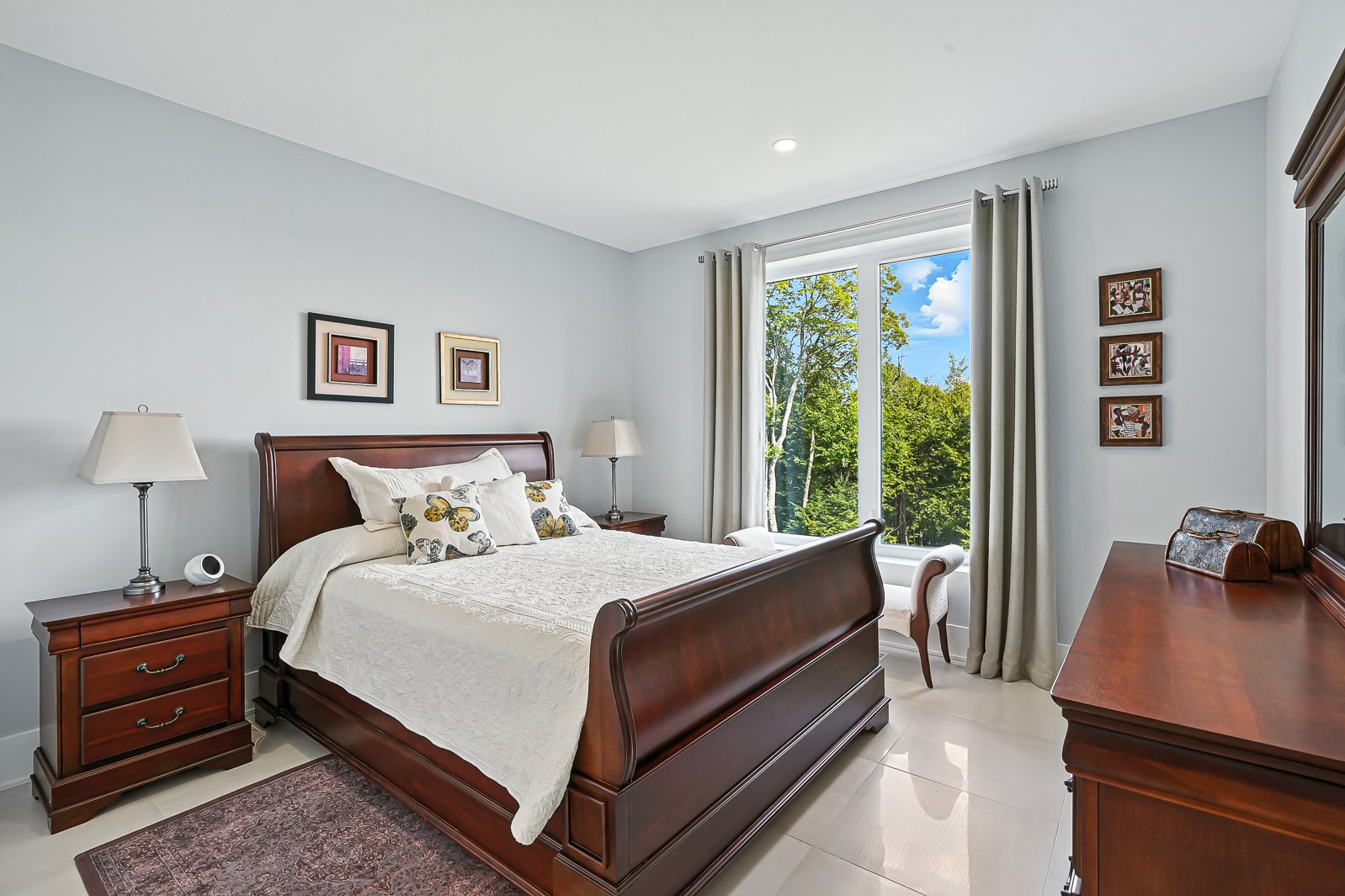 Residence built in 2021 with NUDURA insulated concrete forms and full stone cladding on all four façades, set on 5.8 private acres in Sainte-Catherine-de-Hatley, next to Ayer's Cliff and with easy highway access. Offering ±6,800 sq.ft. of living space, it features oversized garages, radiant heated floors, and a living room with 20-ft ceilings and abundant windows. The expansive terrace and covered balcony extend the interiors toward panoramic views of Lake Massawippi. In-ground pool, three bedrooms, and a garden level ready to be customized. An exceptional property awaiting its next owners.