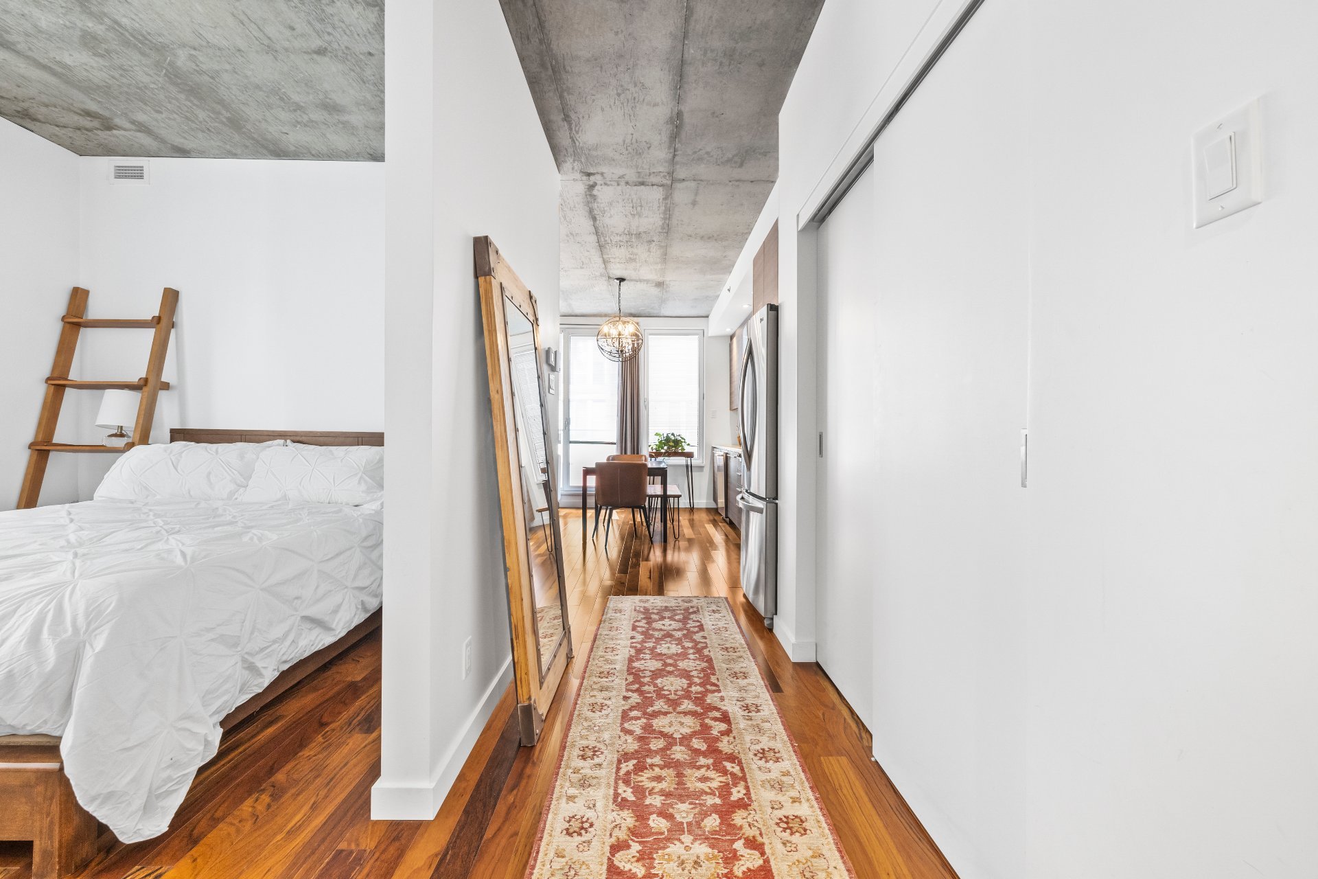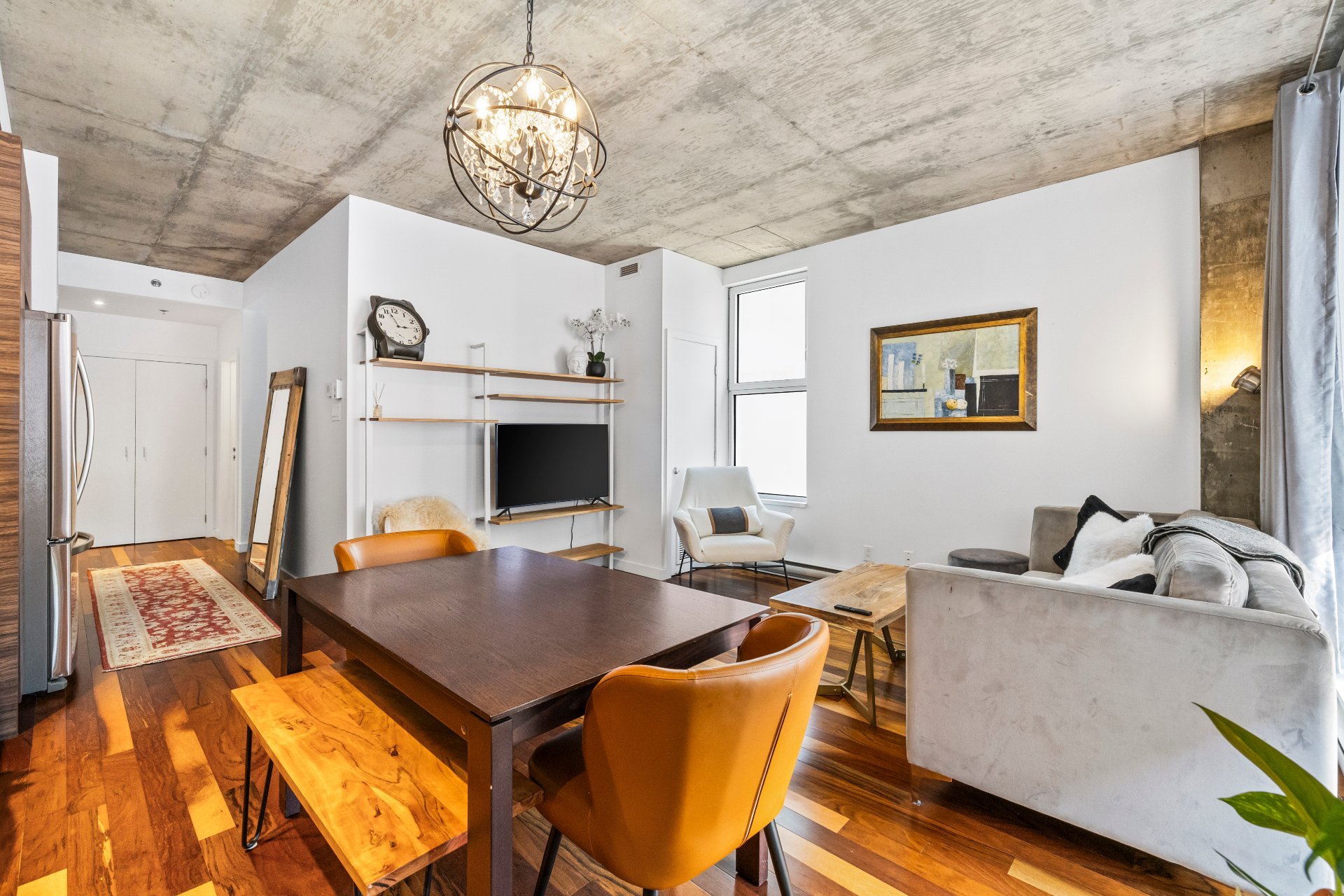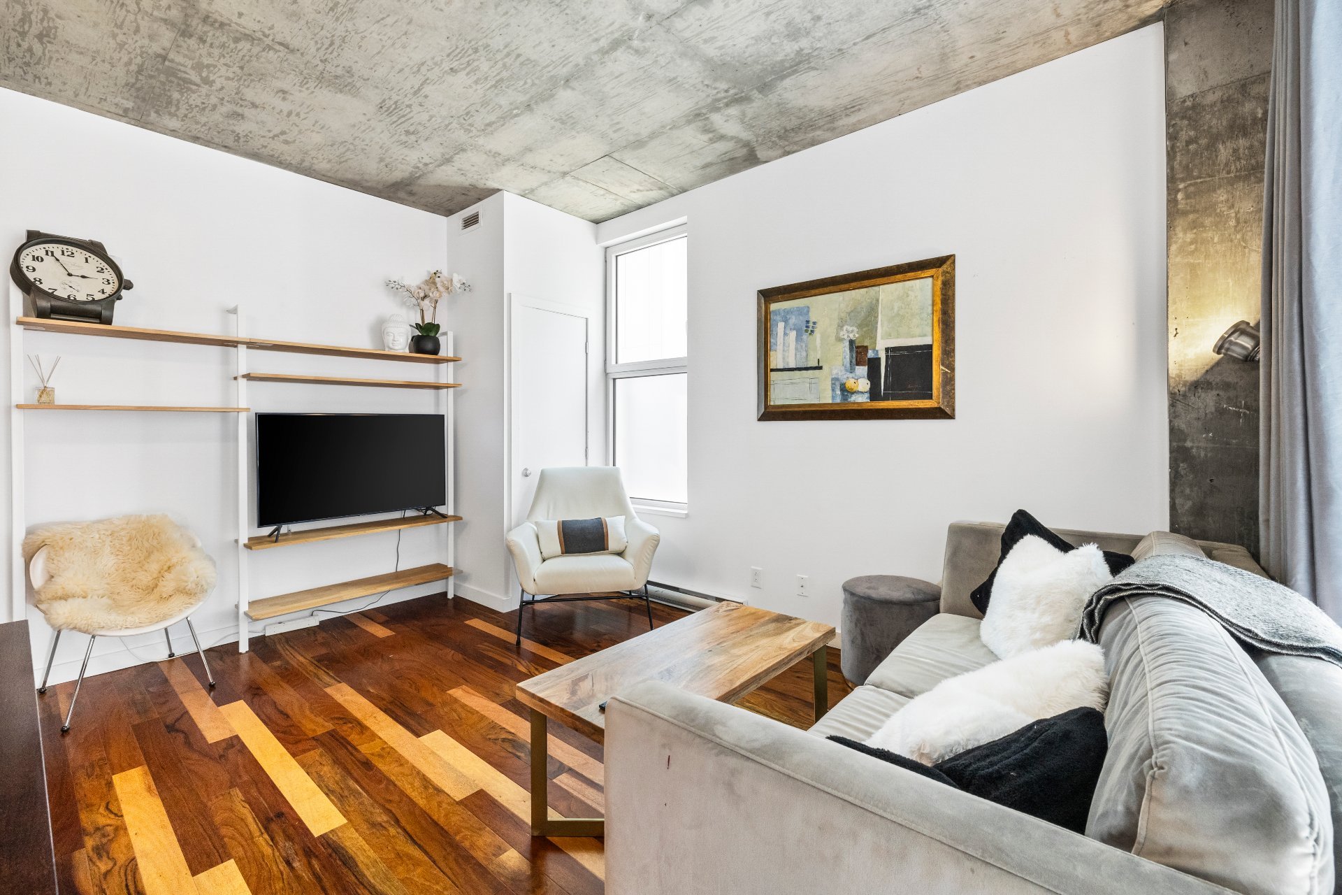 Bright & modern 1 bedroom condo at 71 Rue Duke. Fully furnished & move-in ready! Discover this beautifully maintained 1-bedroom condo in the sought-after M9-3 building, offering a prime location between Old Montreal and Griffintown. With floor-to-ceiling windows, this unit is bathed in natural light, creating a bright and inviting living space. Property Highlights: Spacious closed bedroom for privacy and comfort ; Impeccably maintained with numerous upgrades over the years ; Open-concept layout with modern finishes ; Sold fully furnished - move in hassle-free! One indoor parking space included.
