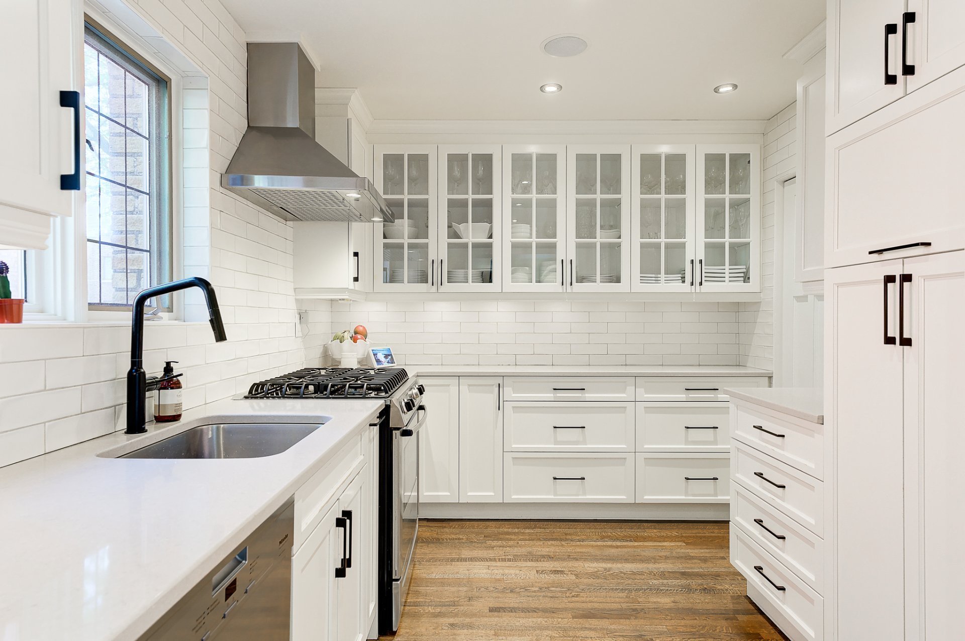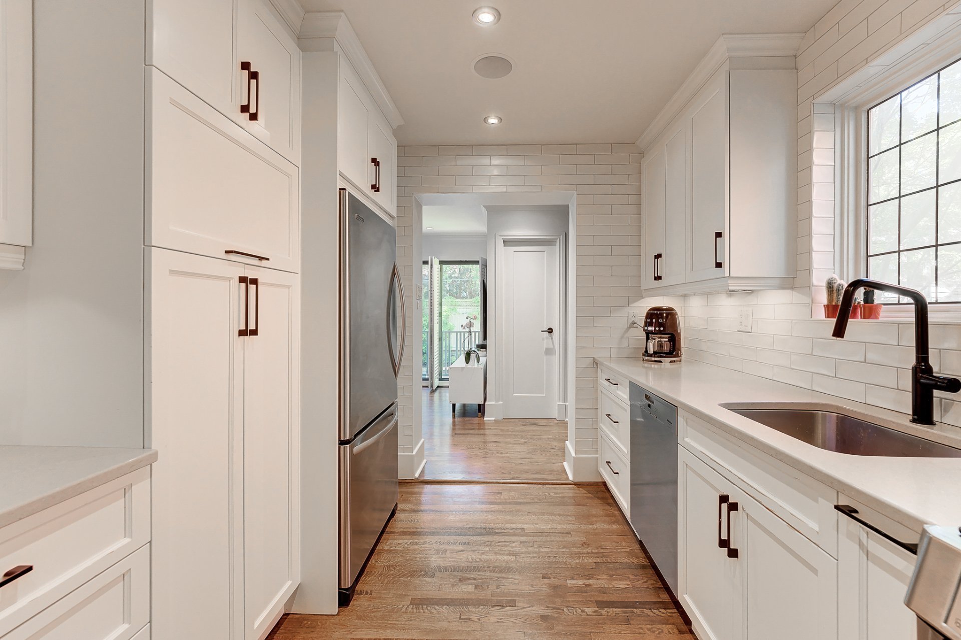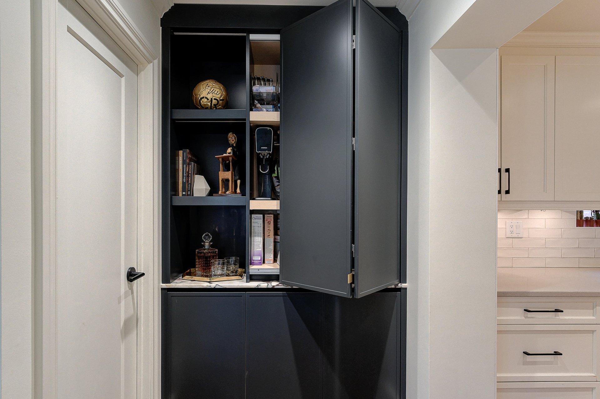 Installation of custom built-ins in the basement, living room, front entrance, and kitchen pantry