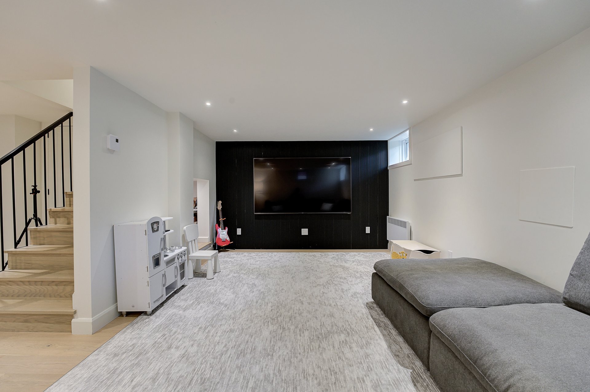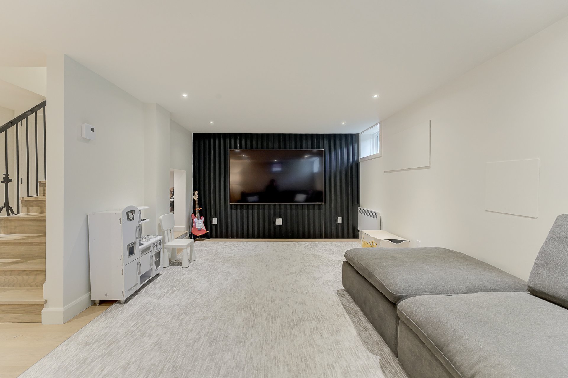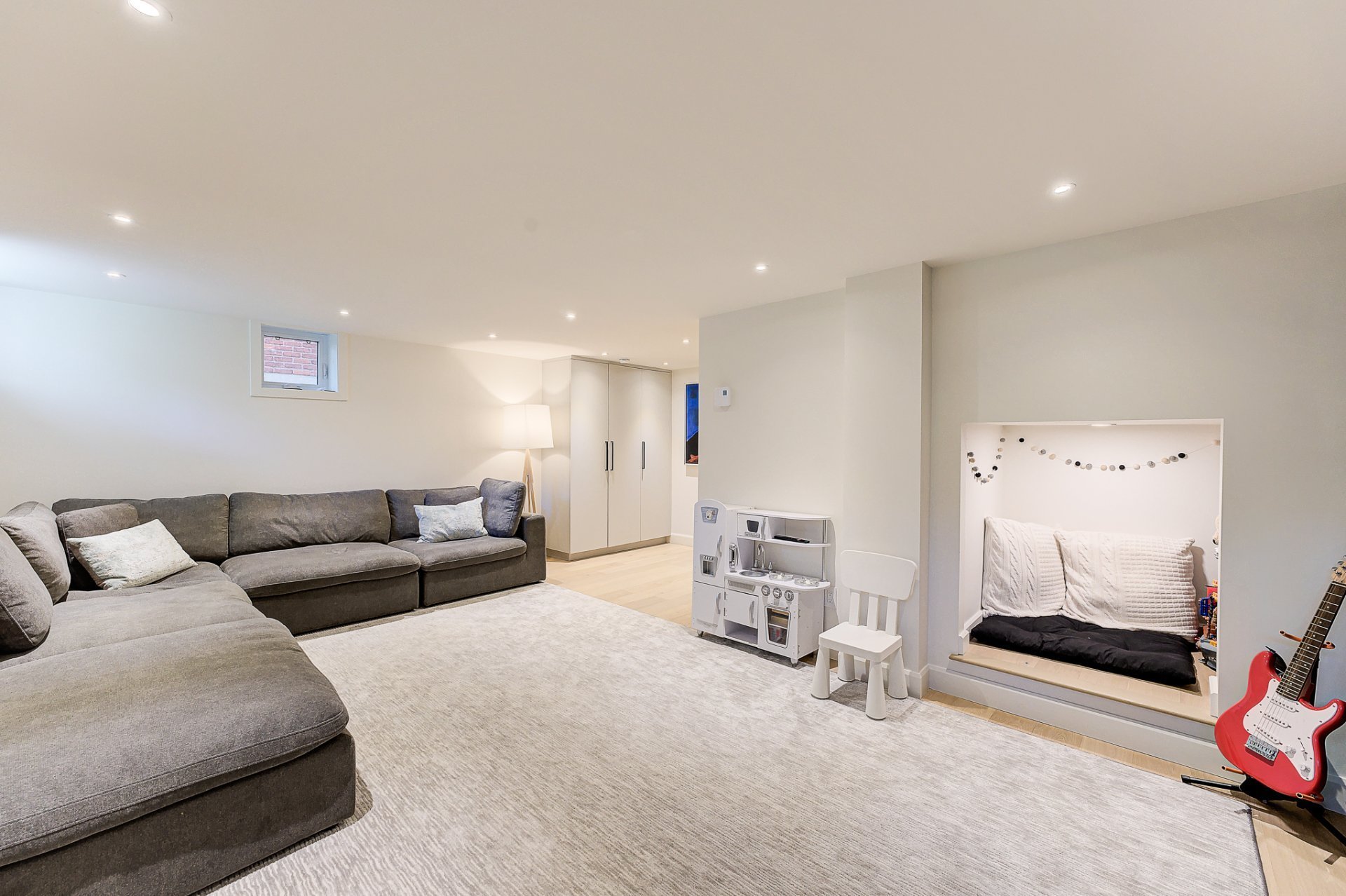 The fully excavated basement has been transformed into a beautifully finished space featuring a large play area, a spacious laundry room, an additional bathroom, ample storage, and a versatile bedroom ideal as a home office or for live-in help.