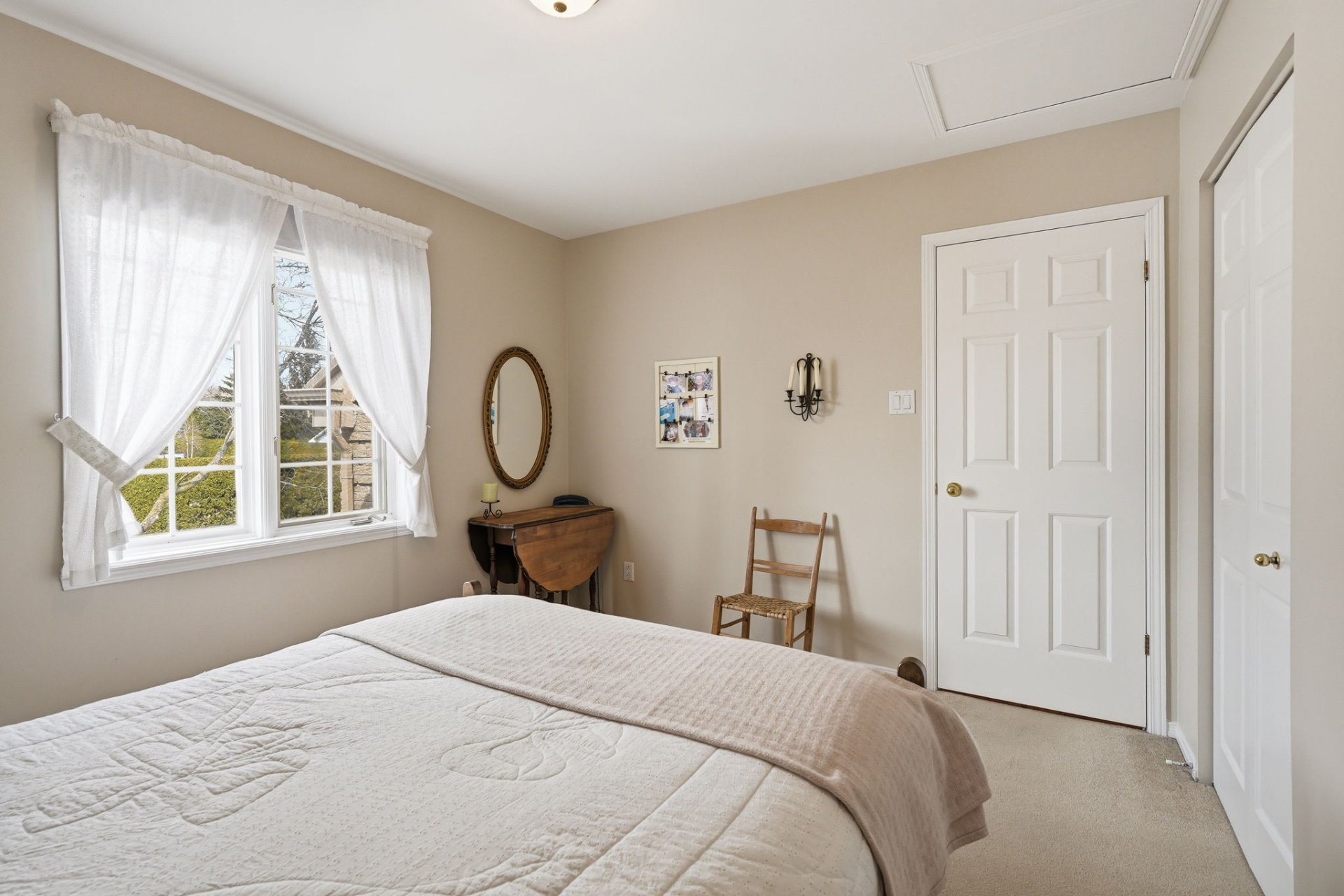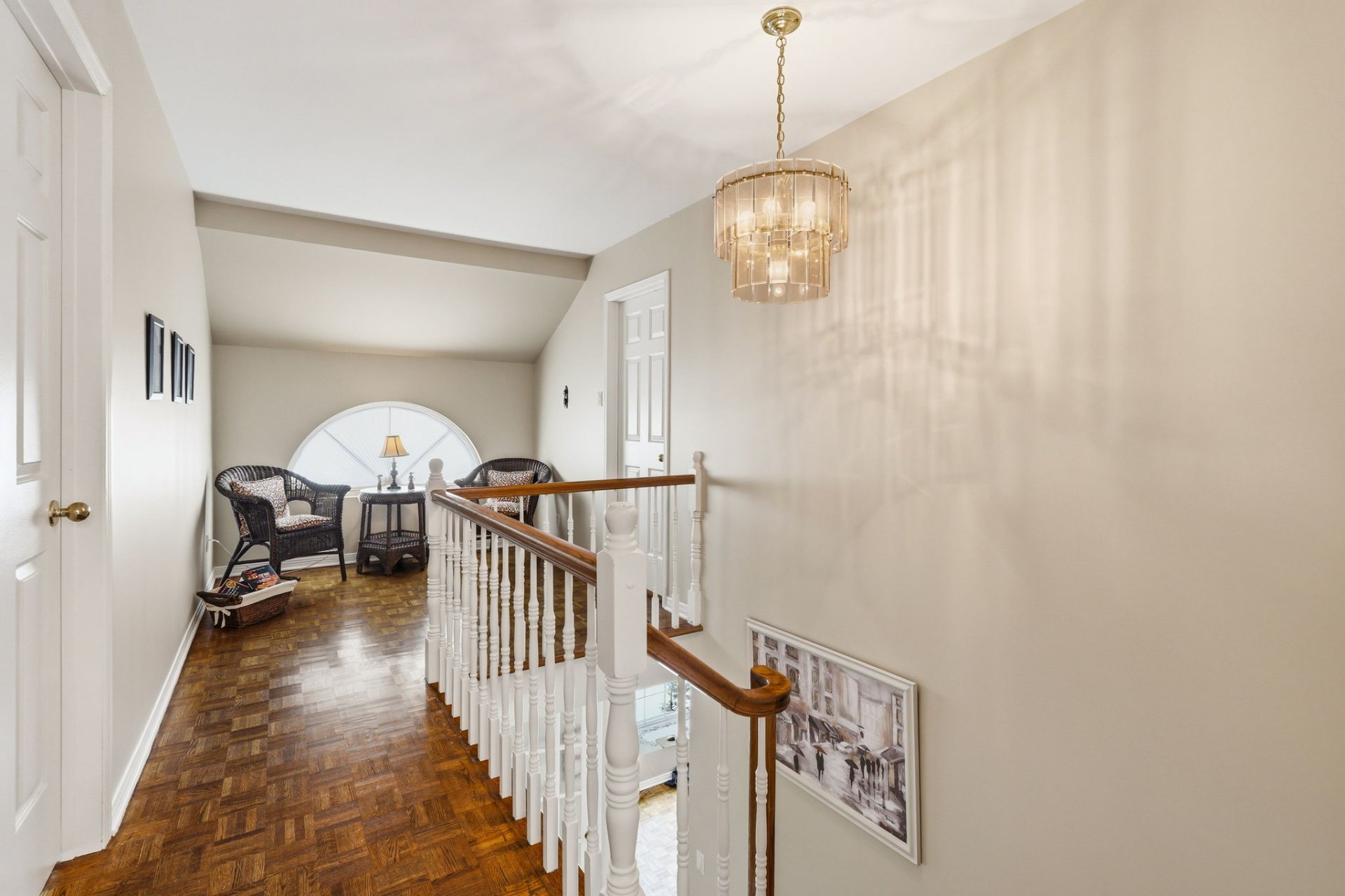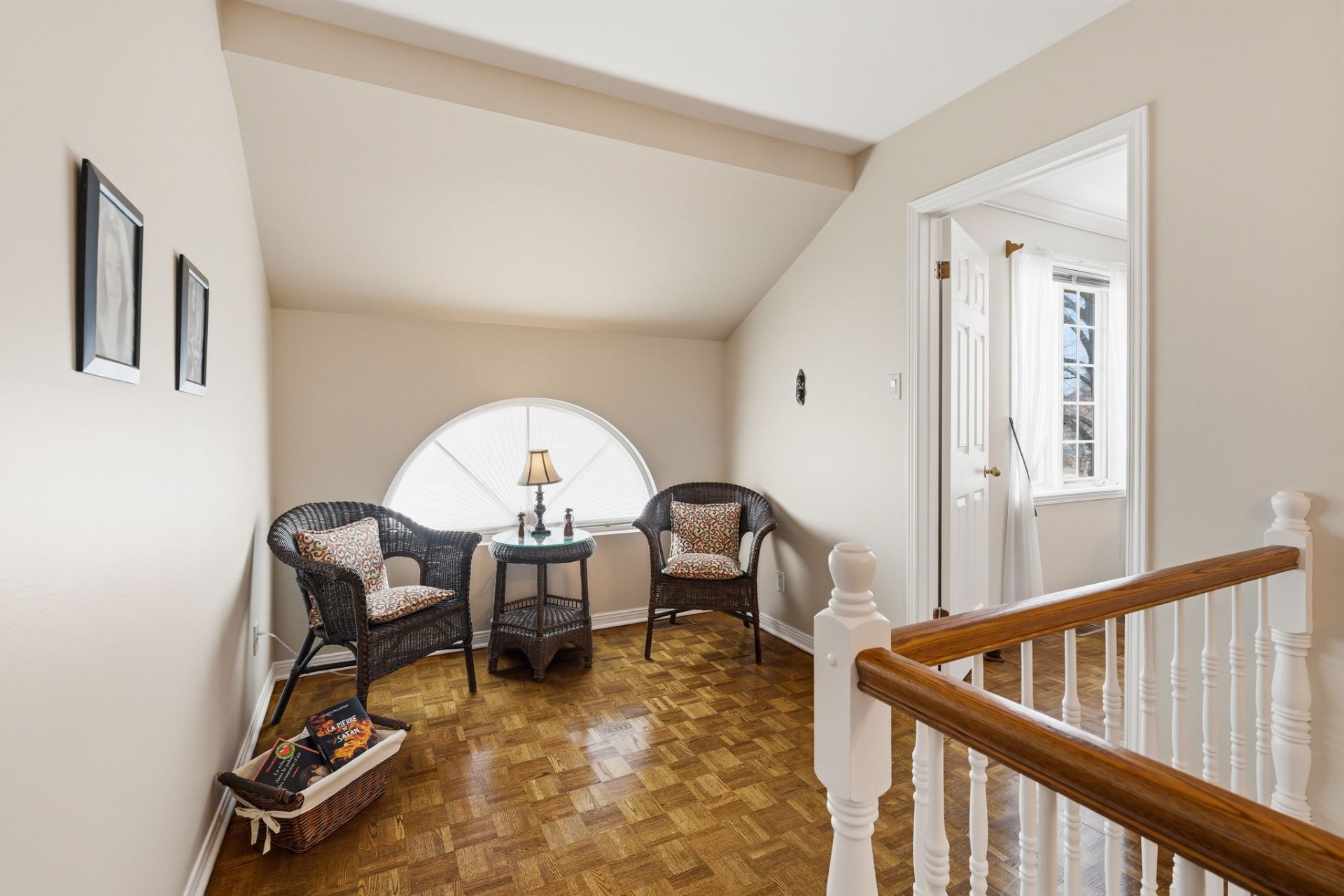 Upstairs, you will find three good-sized bedrooms, including one adjacent to the bathroom and featuring a walk-in closet. A charming boudoir with a half-moon window enhances the space.