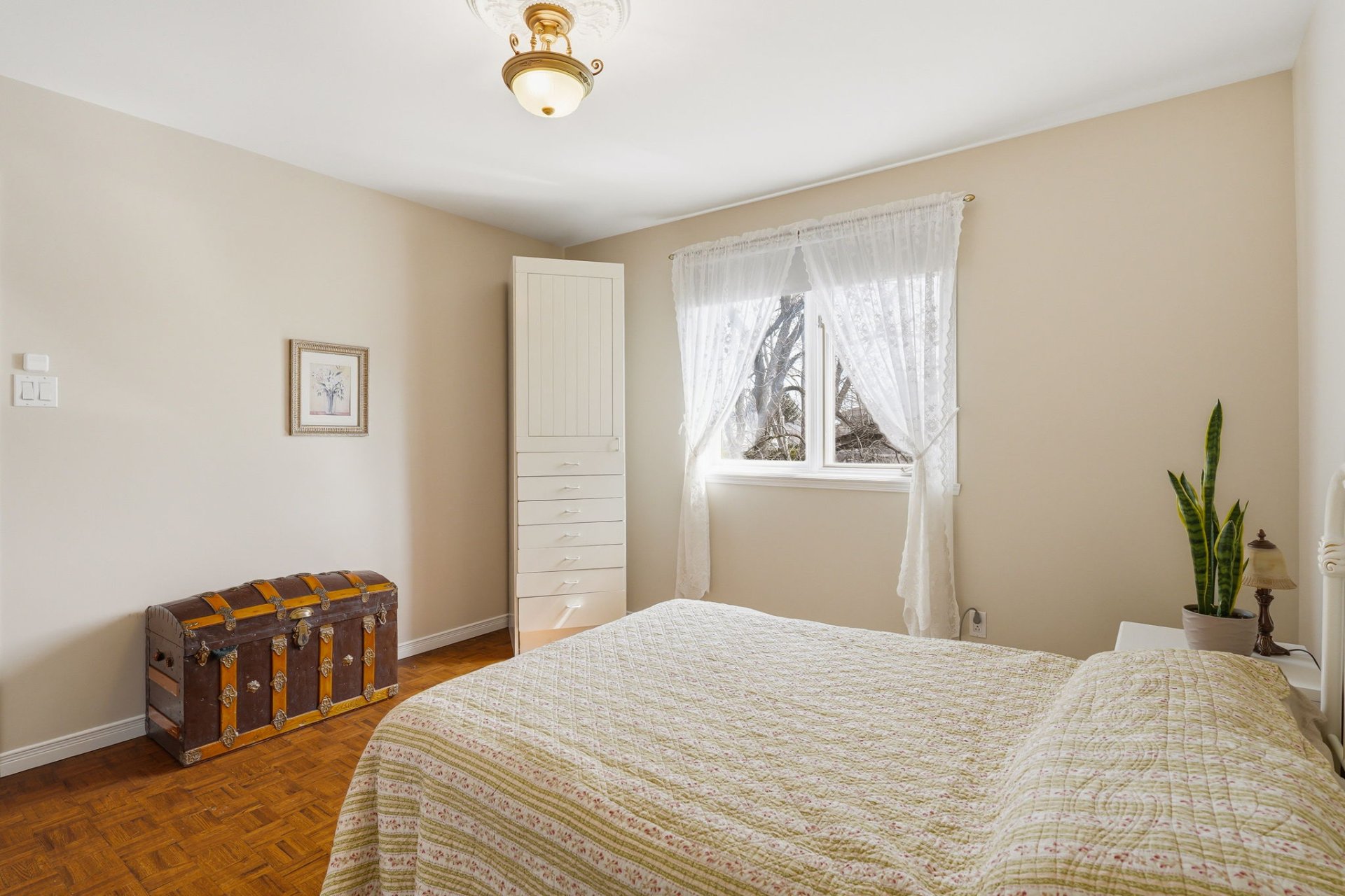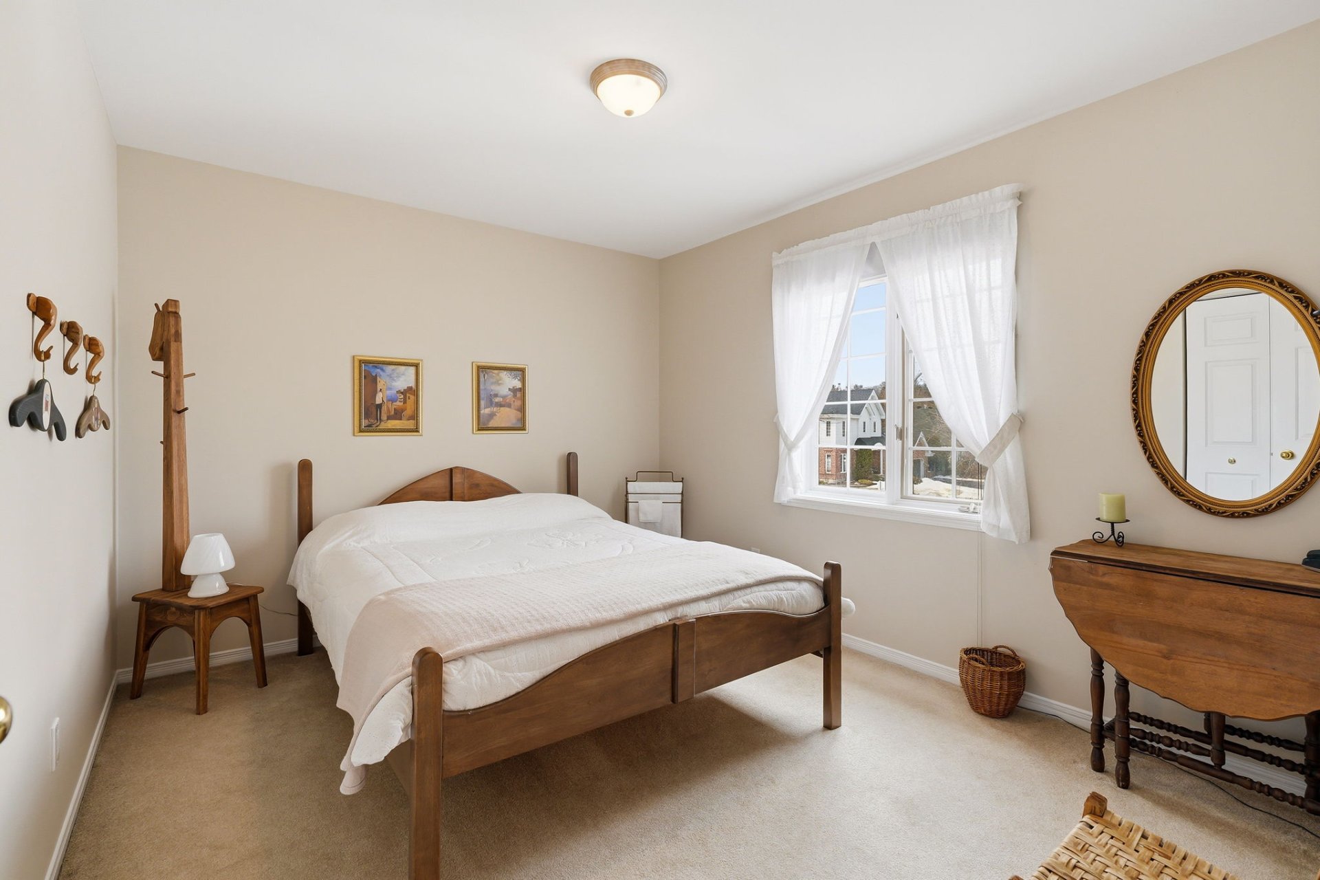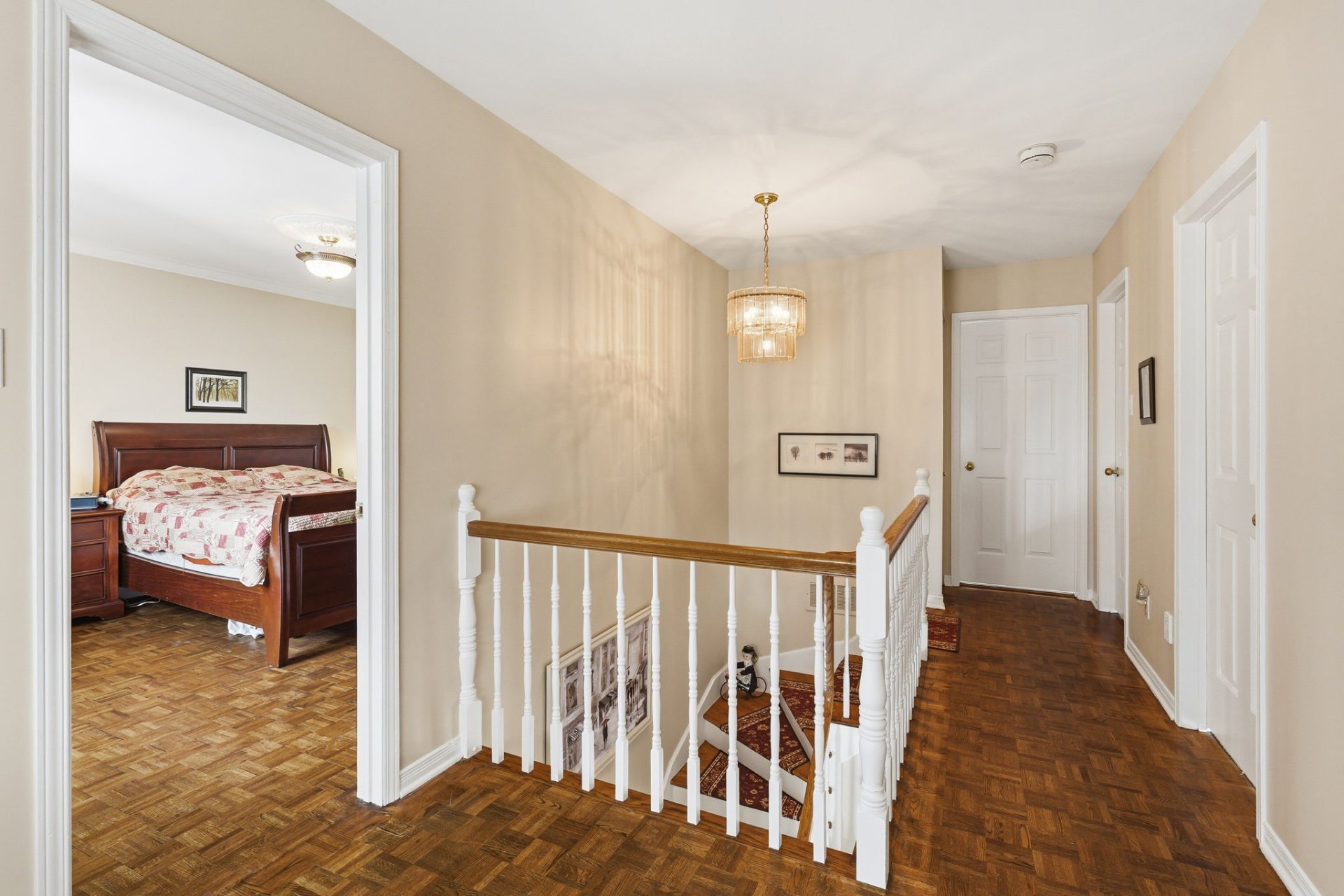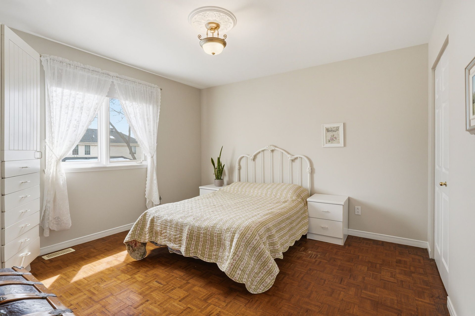 Upstairs, you will find three good-sized bedrooms, including one adjacent to the bathroom and featuring a walk-in closet. A charming boudoir with a half-moon window enhances the space.
