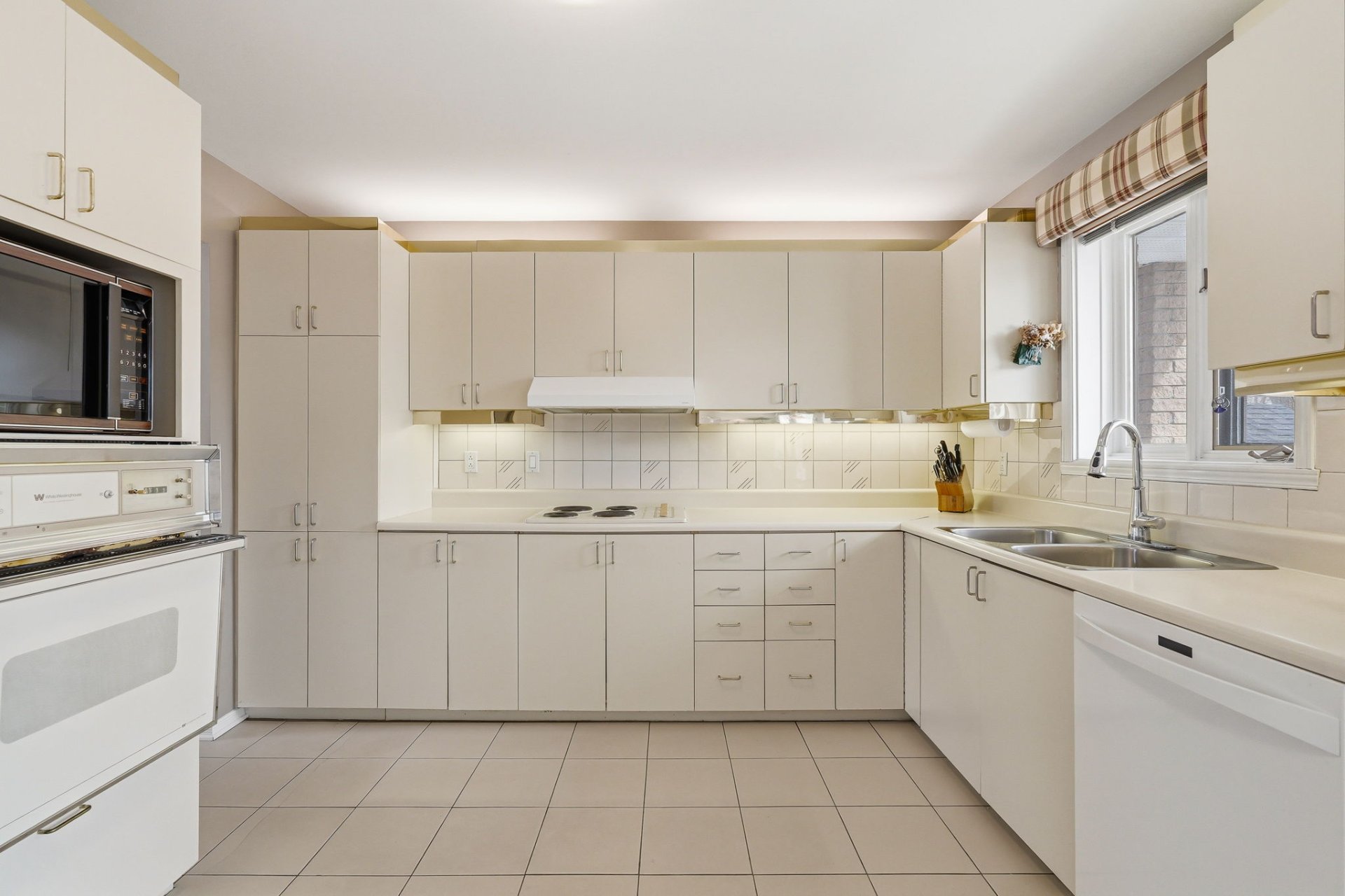 The bright kitchen, with a dinette area, overlooks the backyard. A large family room with expansive windows and a double-sided fireplace creates a warm and inviting space. A powder room and a laundry room complete this level.