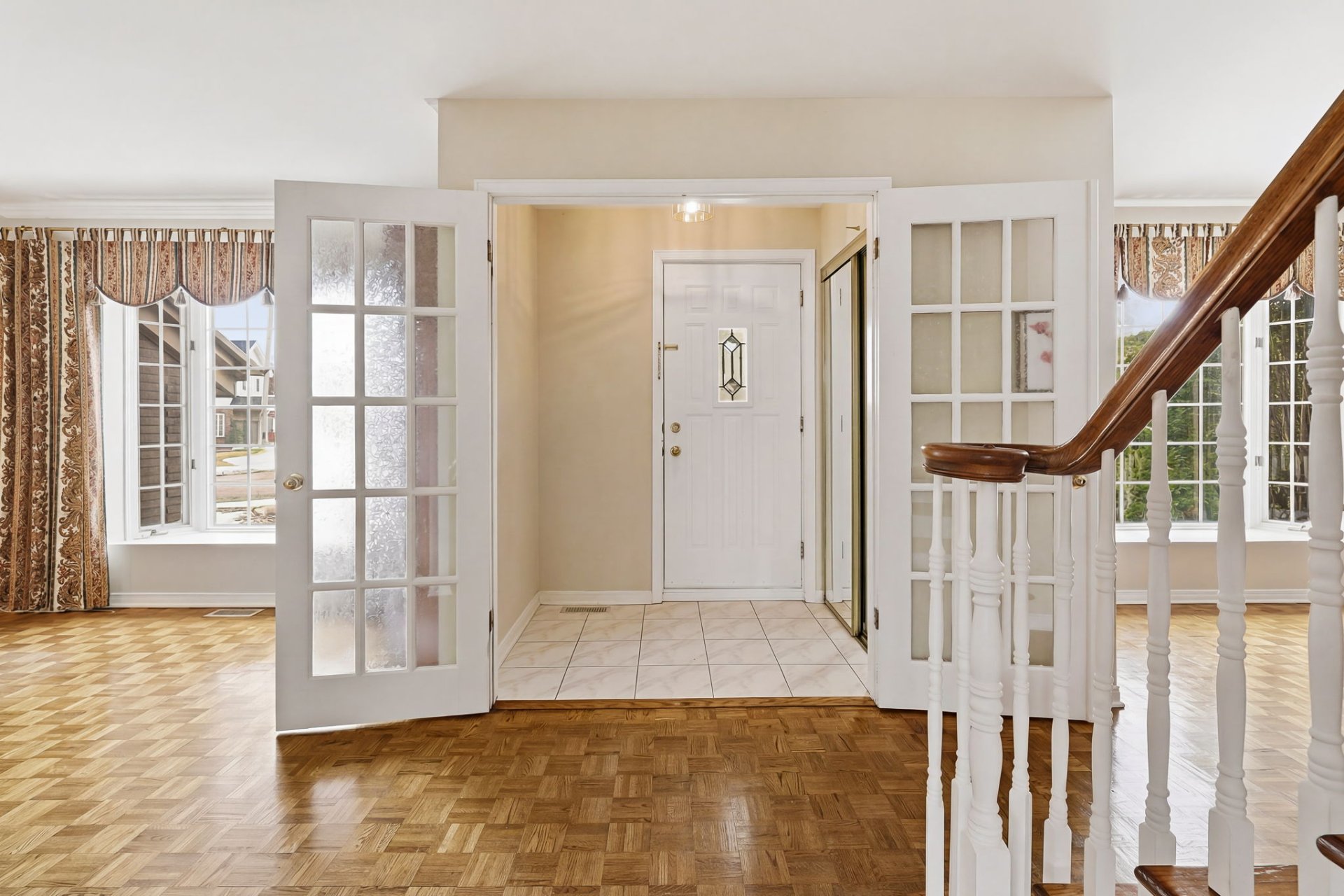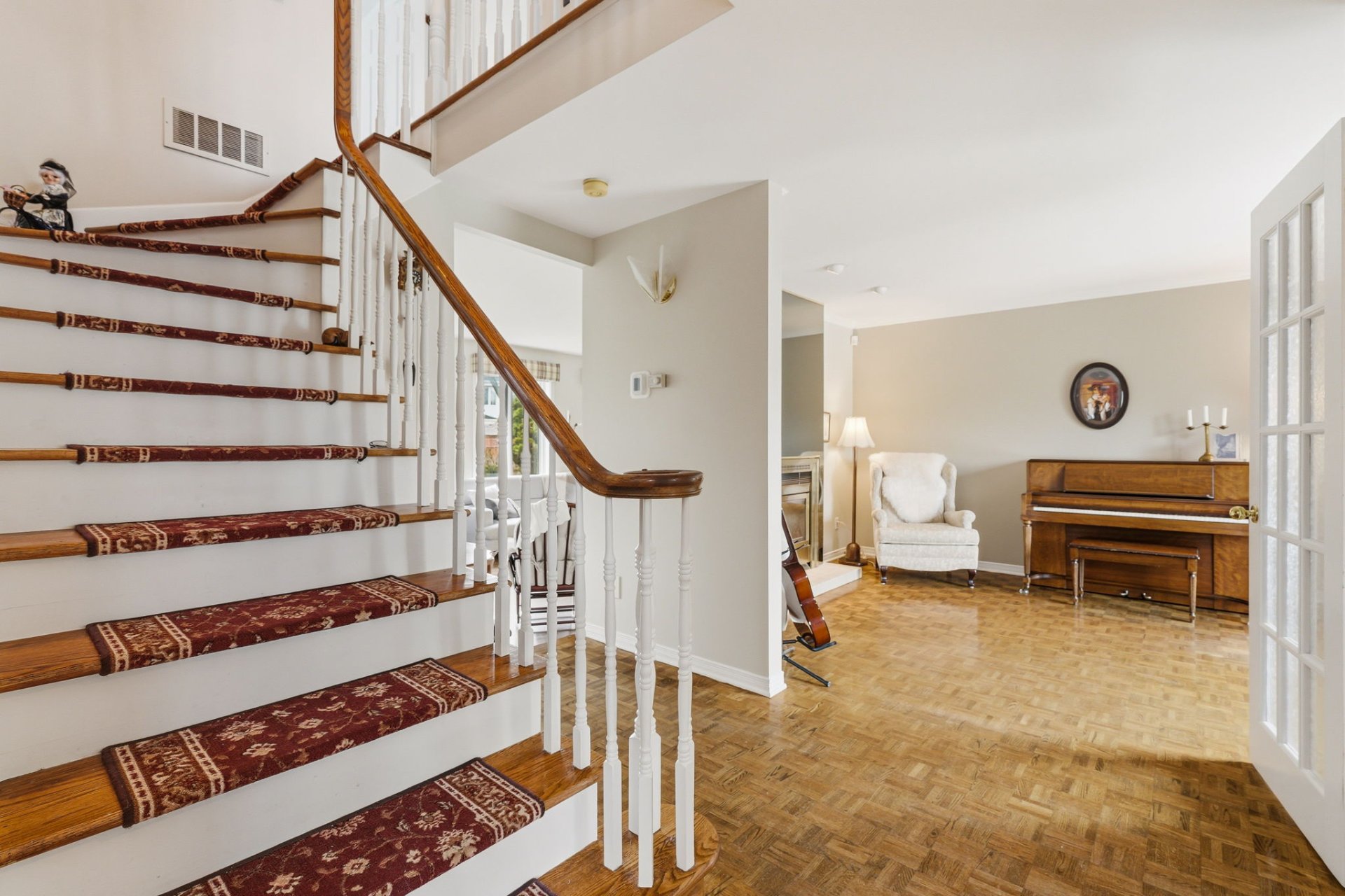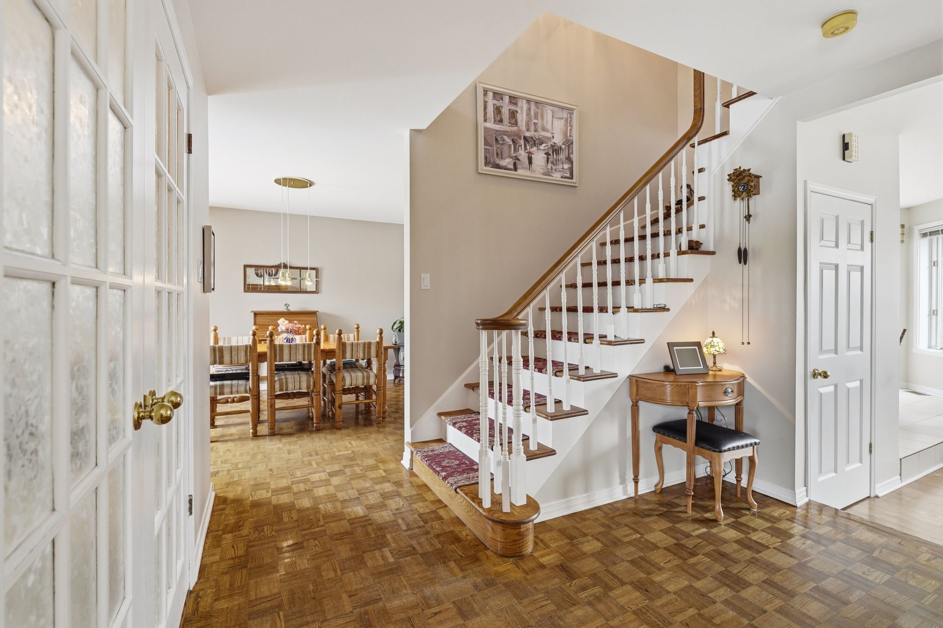This charming, well-laid-out property offers beautiful living spaces on the main floor. A closed entrance hall with two doors and ample storage welcomes you in. Both the living room and dining room feature bay windows, providing plenty of natural light. An elegant central staircase with a country-style design adds great character.