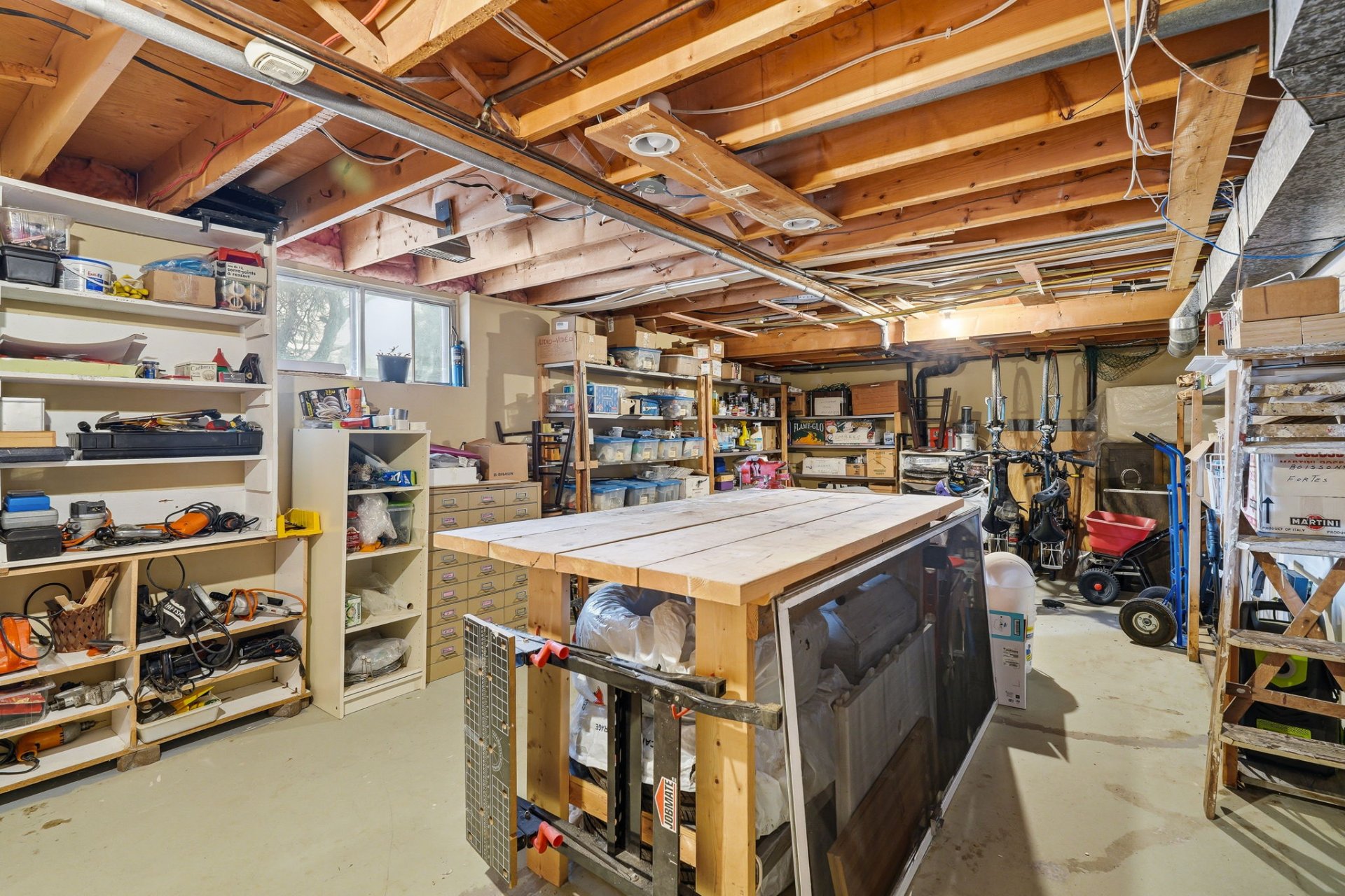 The basement is finished and includes a family room, a large finished room without a window, a storage area, and a workshop.