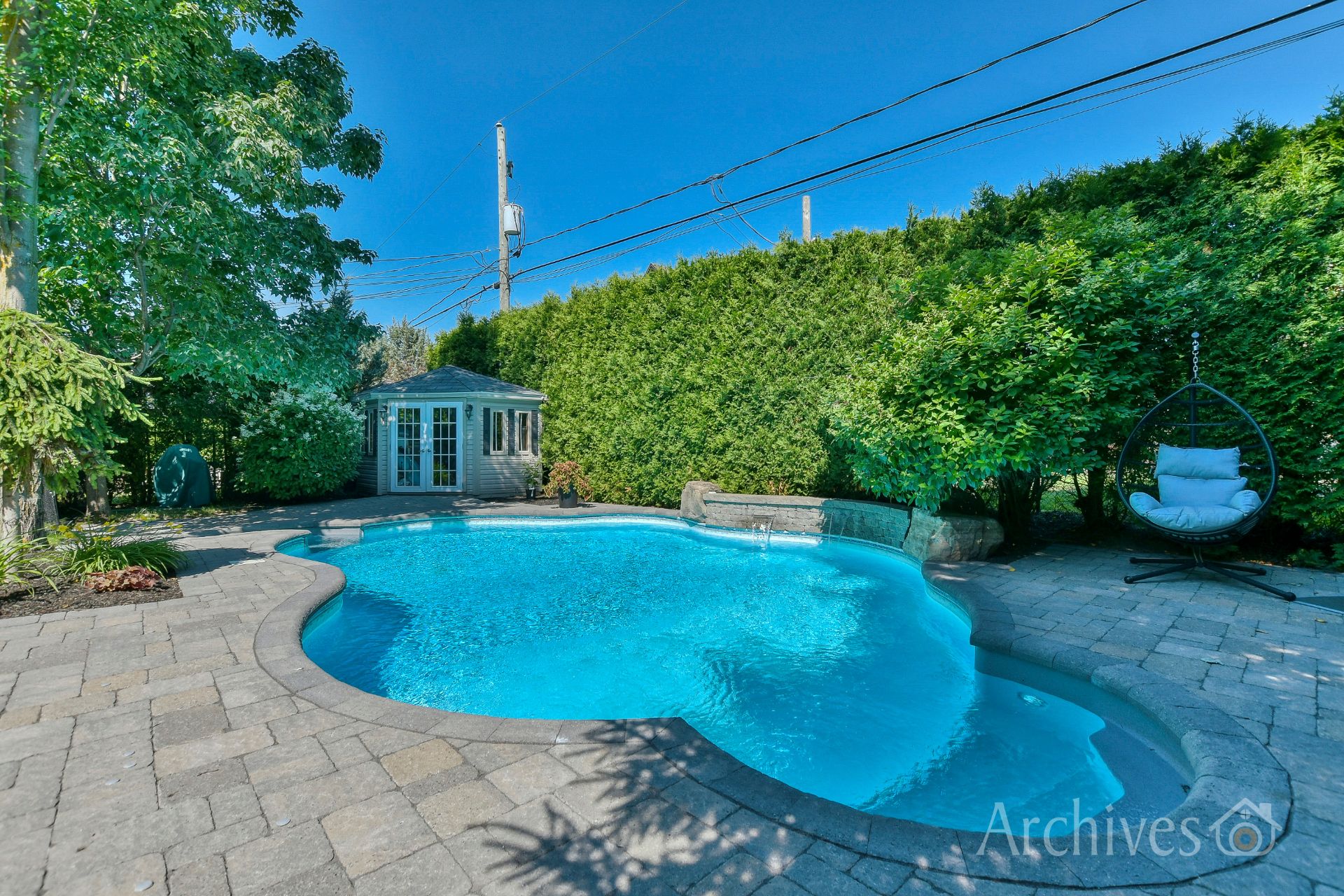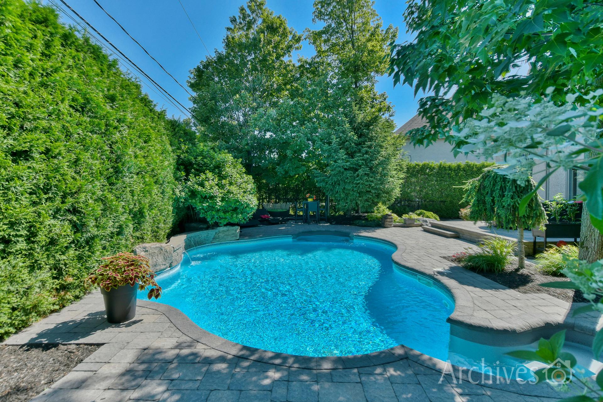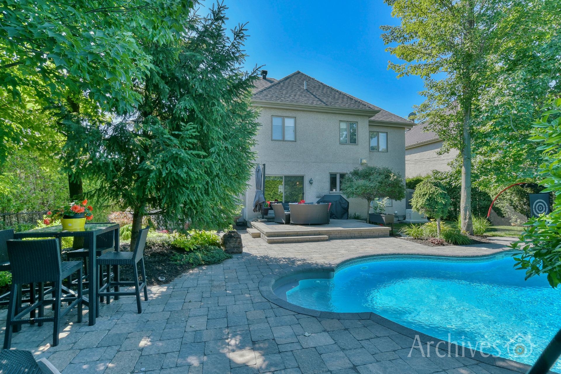 Private, professionally landscaped yard with heated in-ground pool and relaxation areas -- perfect for enjoying outdoor living and entertaining.