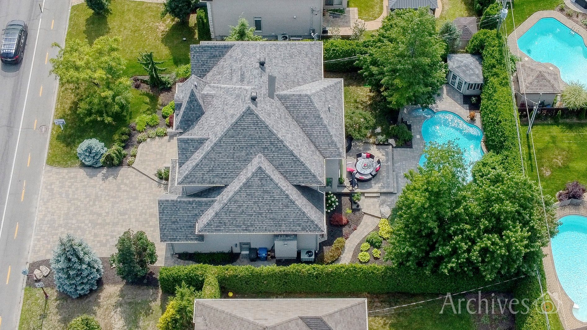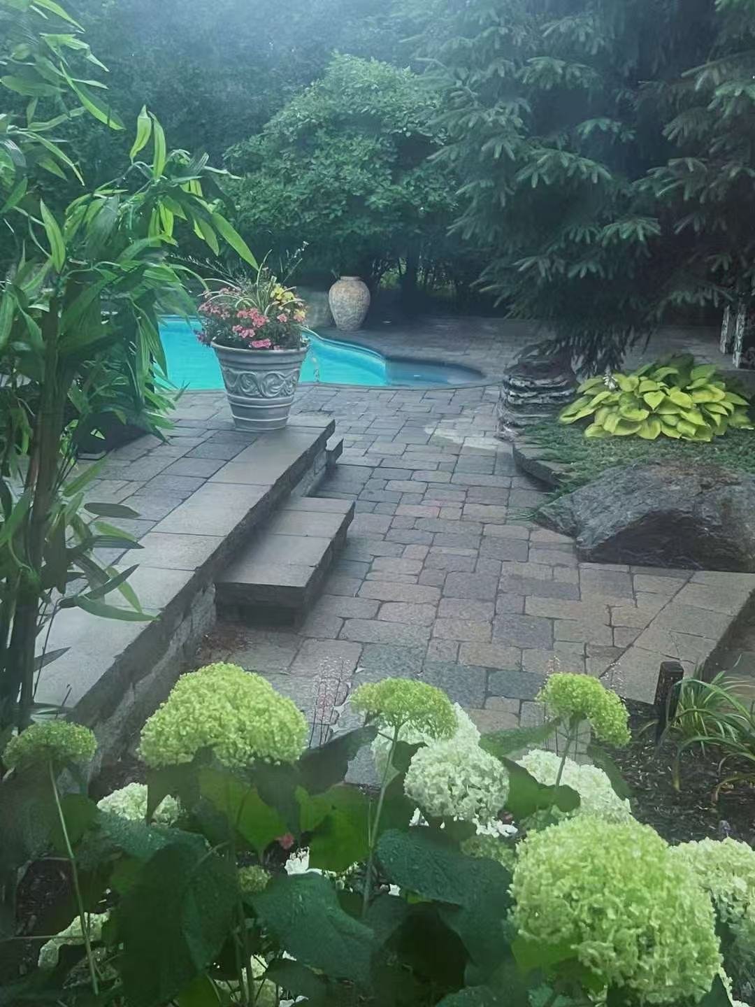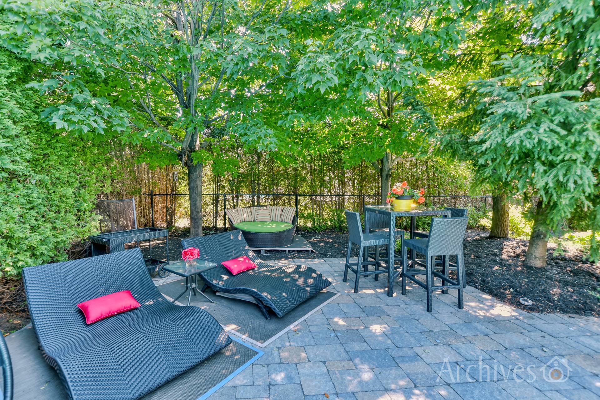 Private, professionally landscaped yard with heated in-ground pool and relaxation areas -- perfect for enjoying outdoor living and entertaining.