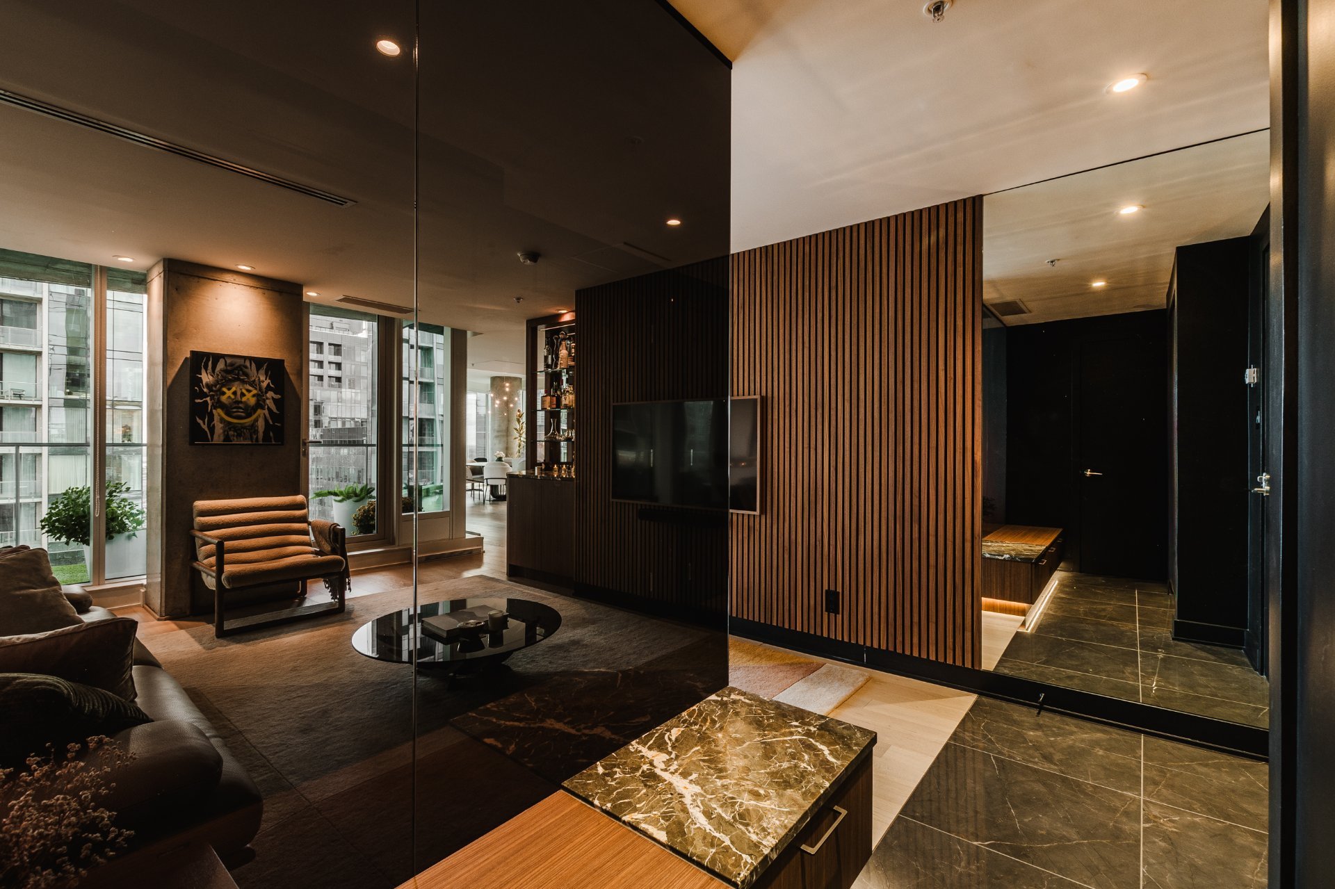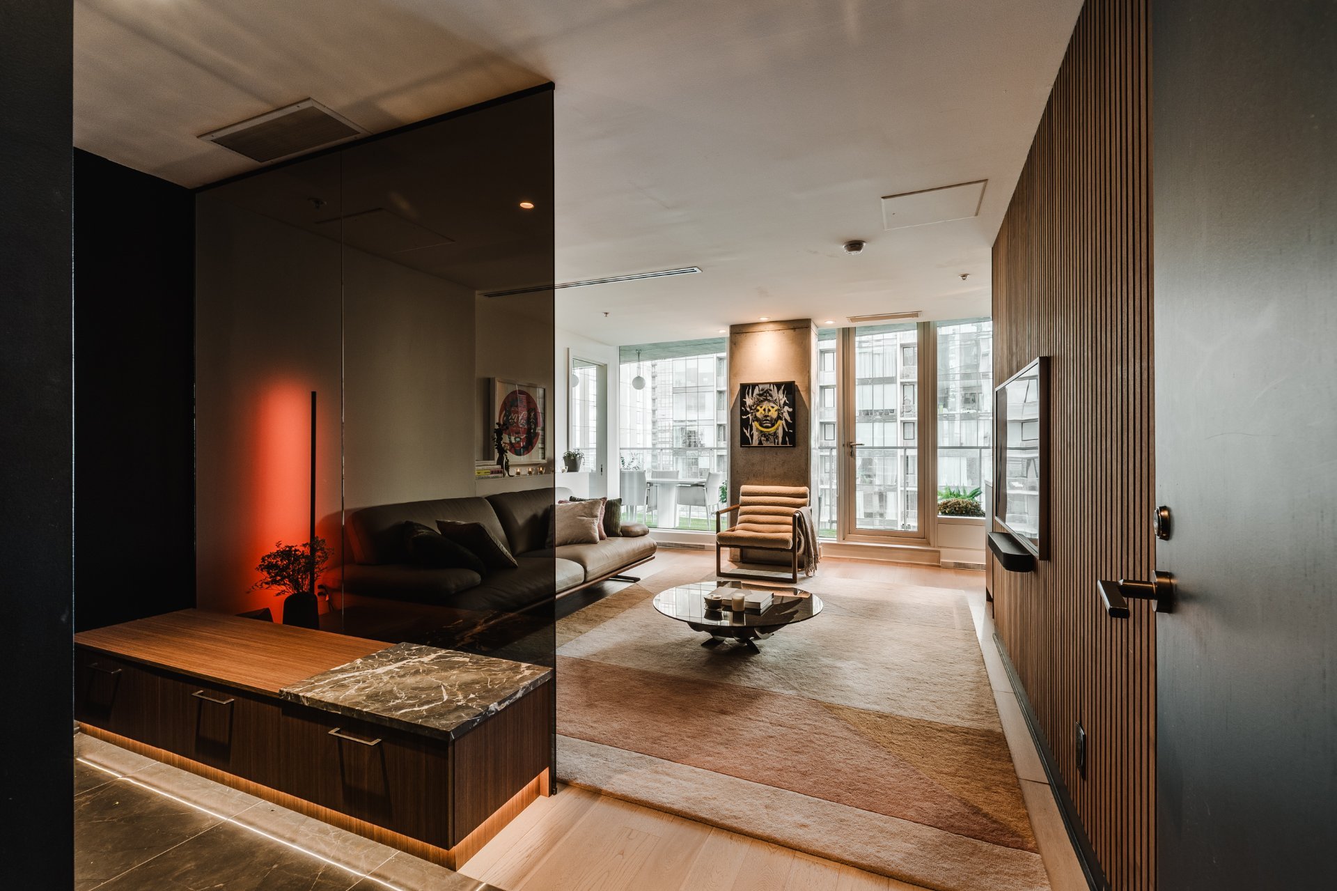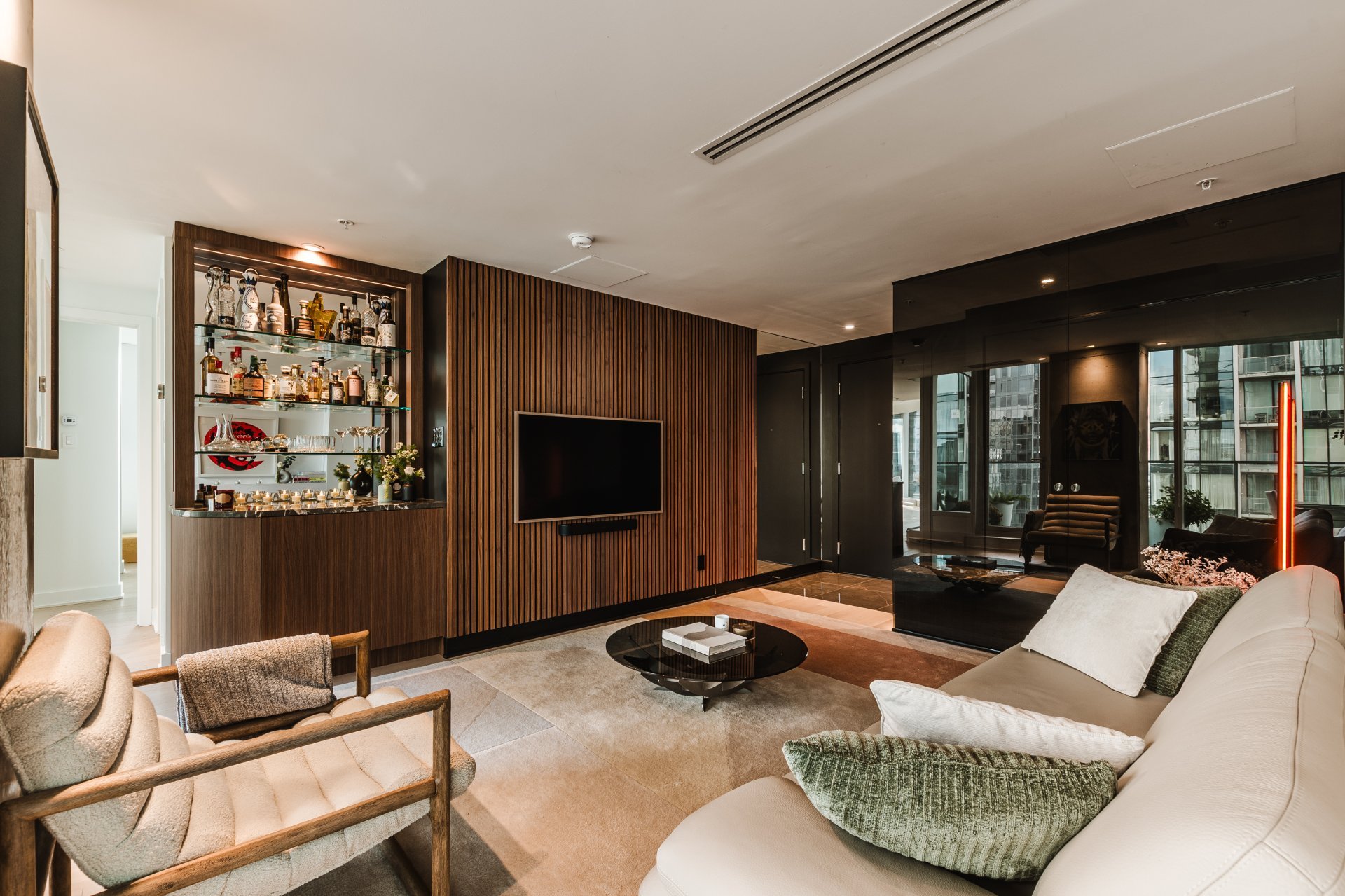 The living room features wood paneling on the walls and a custom-built bar area that blends in perfectly. There are large windows, remarkable brightness, and spectacular views, all located on the 31st floor.