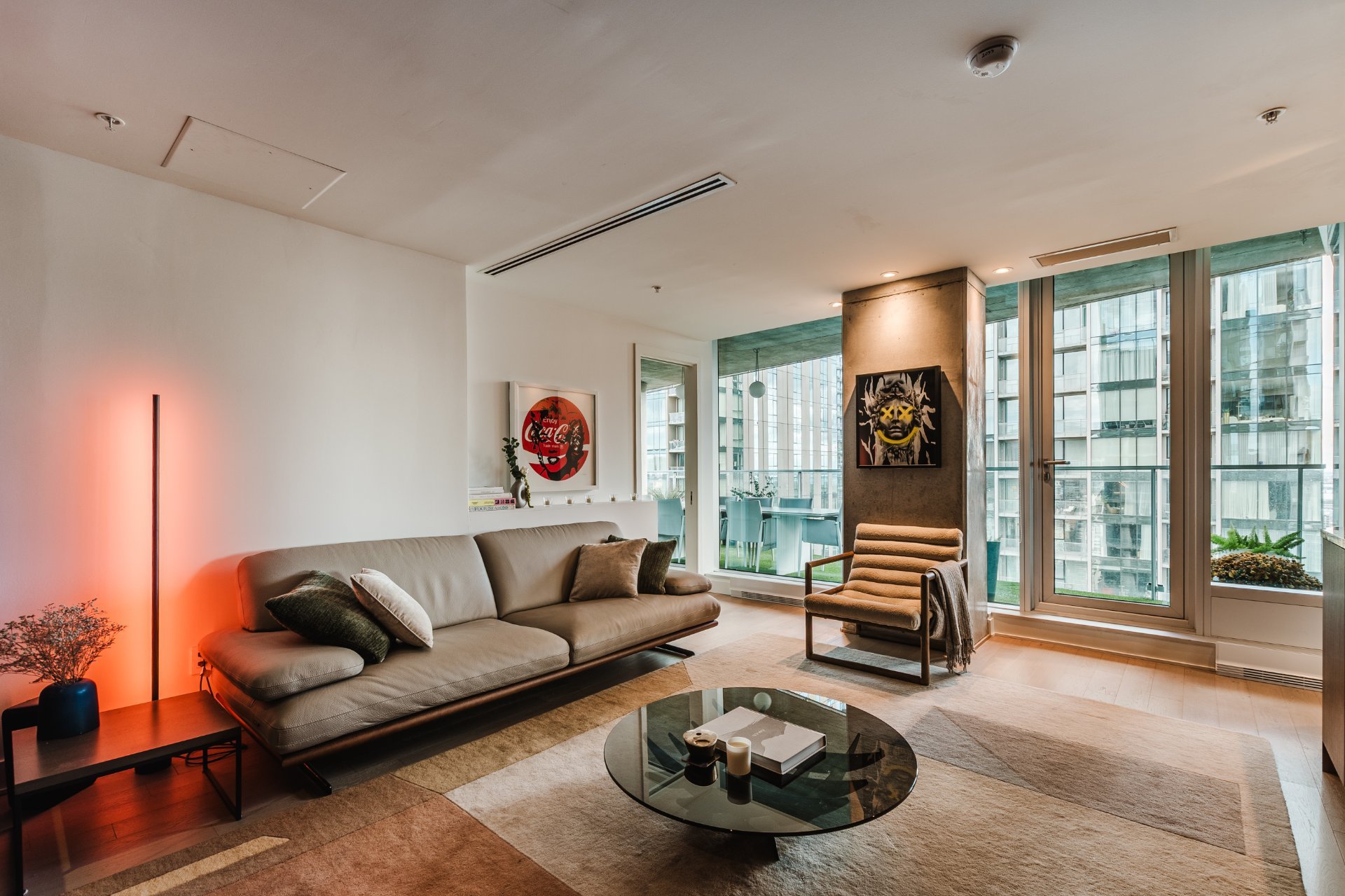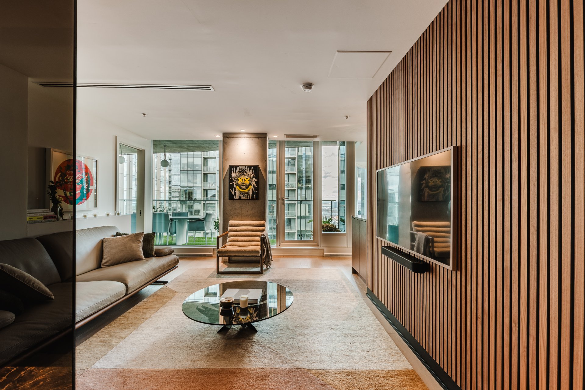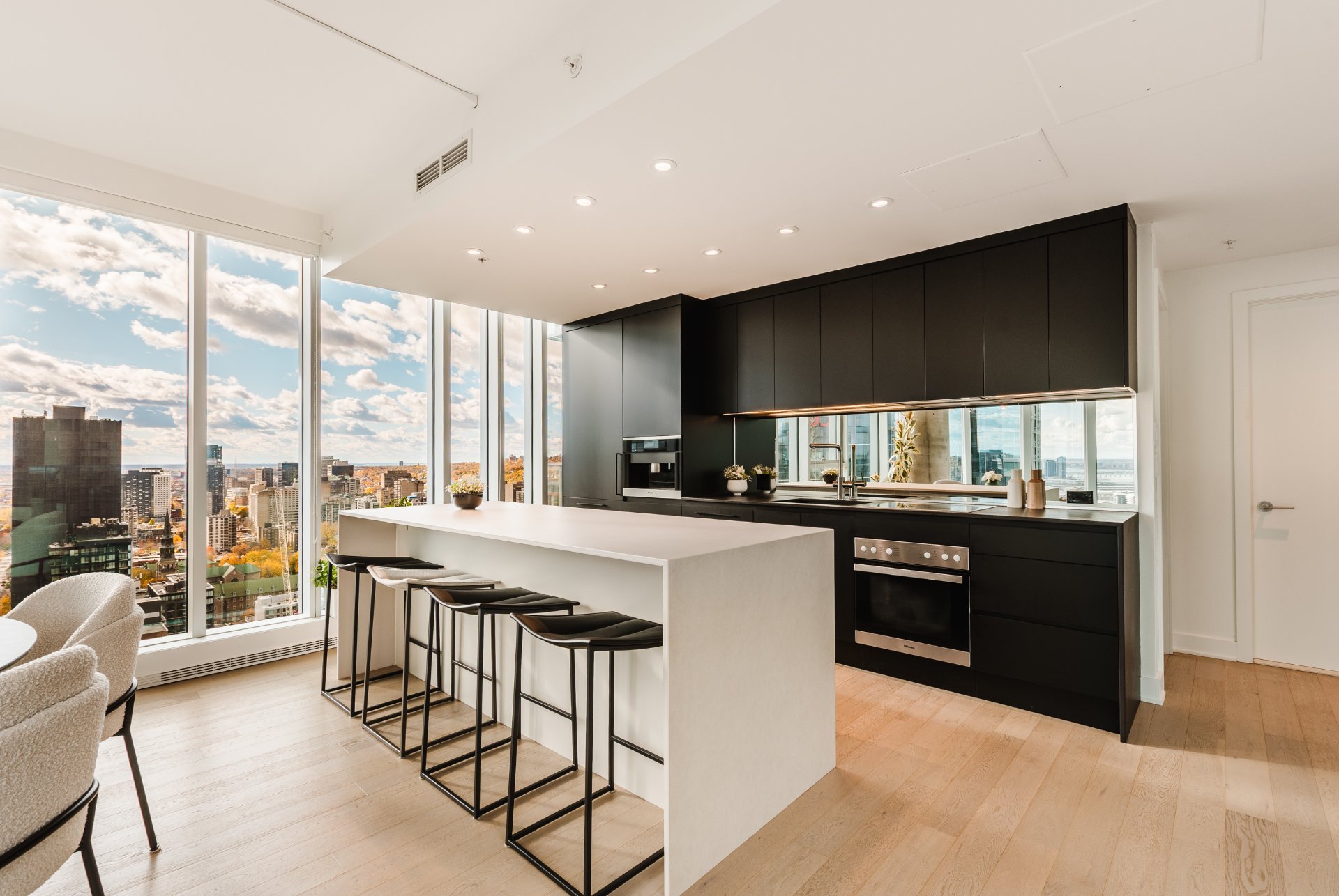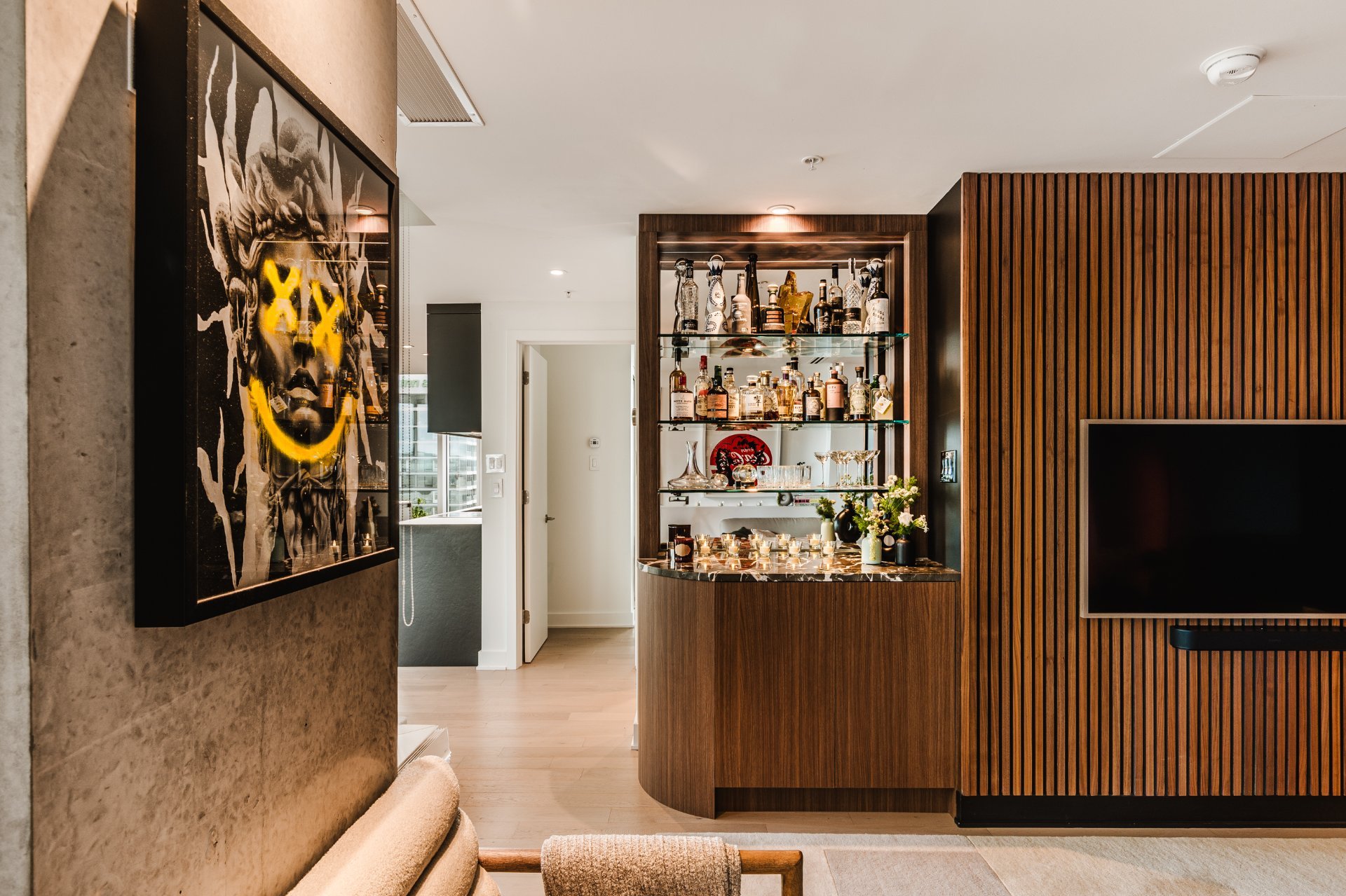 The living room features wood paneling on the walls and a custom-built bar area that blends in perfectly. There are large windows, remarkable brightness, and spectacular views, all located on the 31st floor.
