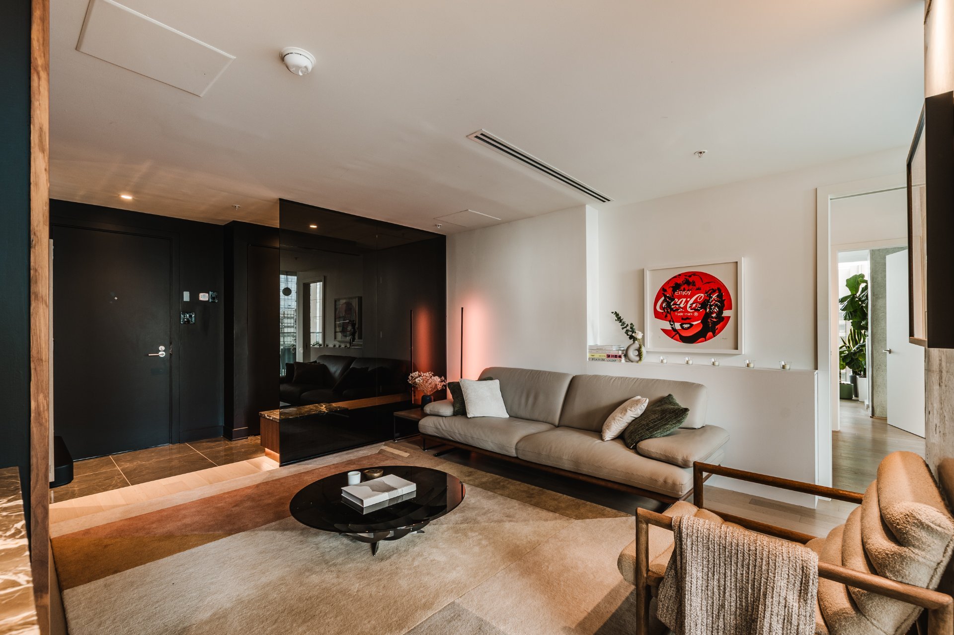 The entrance is spacious and functional, with built-in storage, delicately separated by a glass partition that allows light to flow through while clearly defining the spaces.