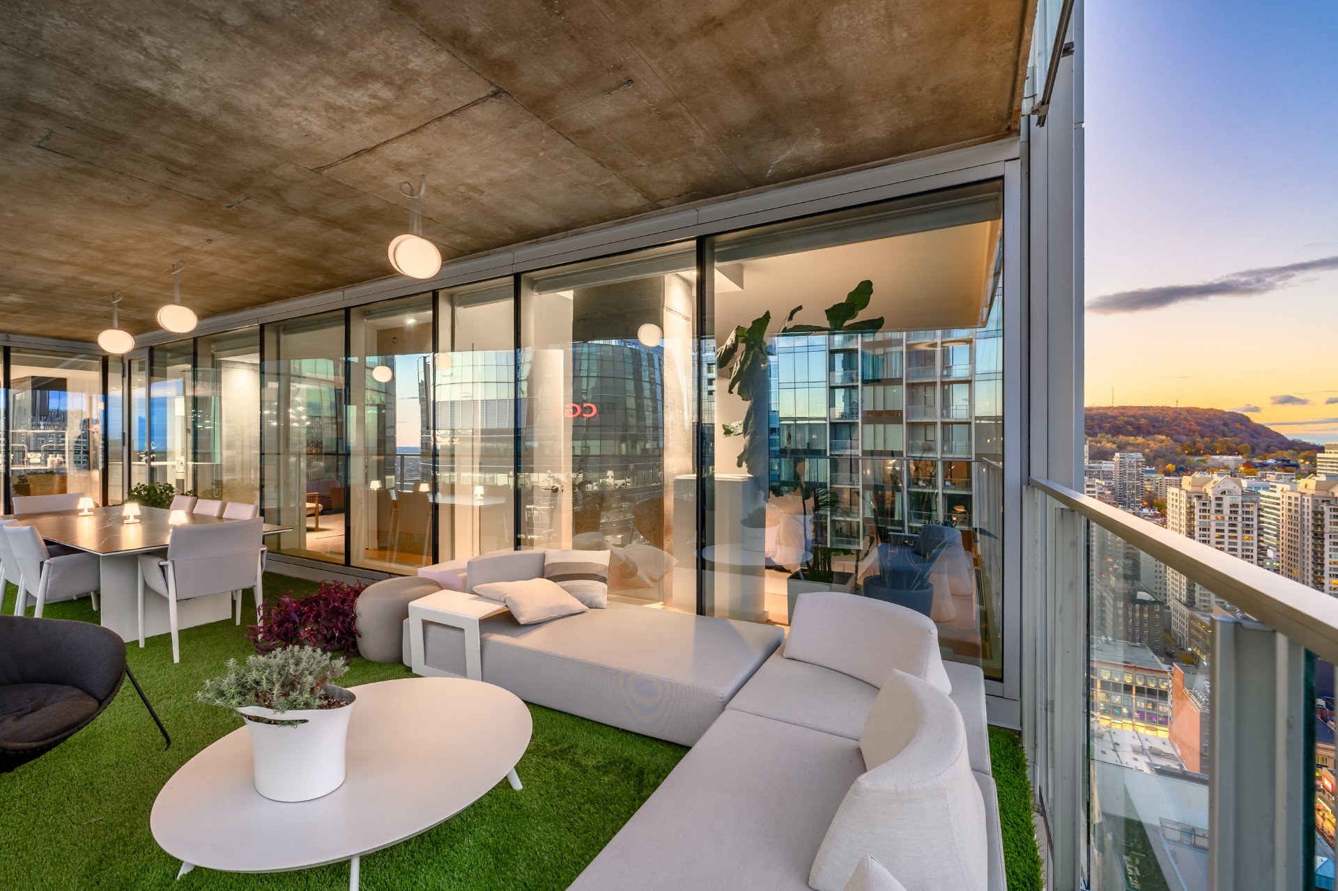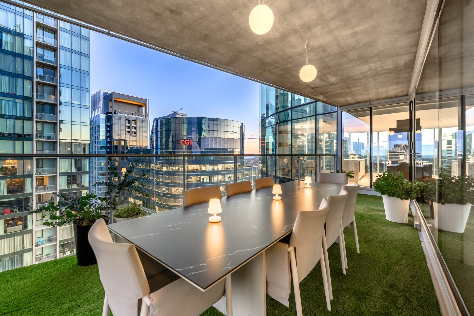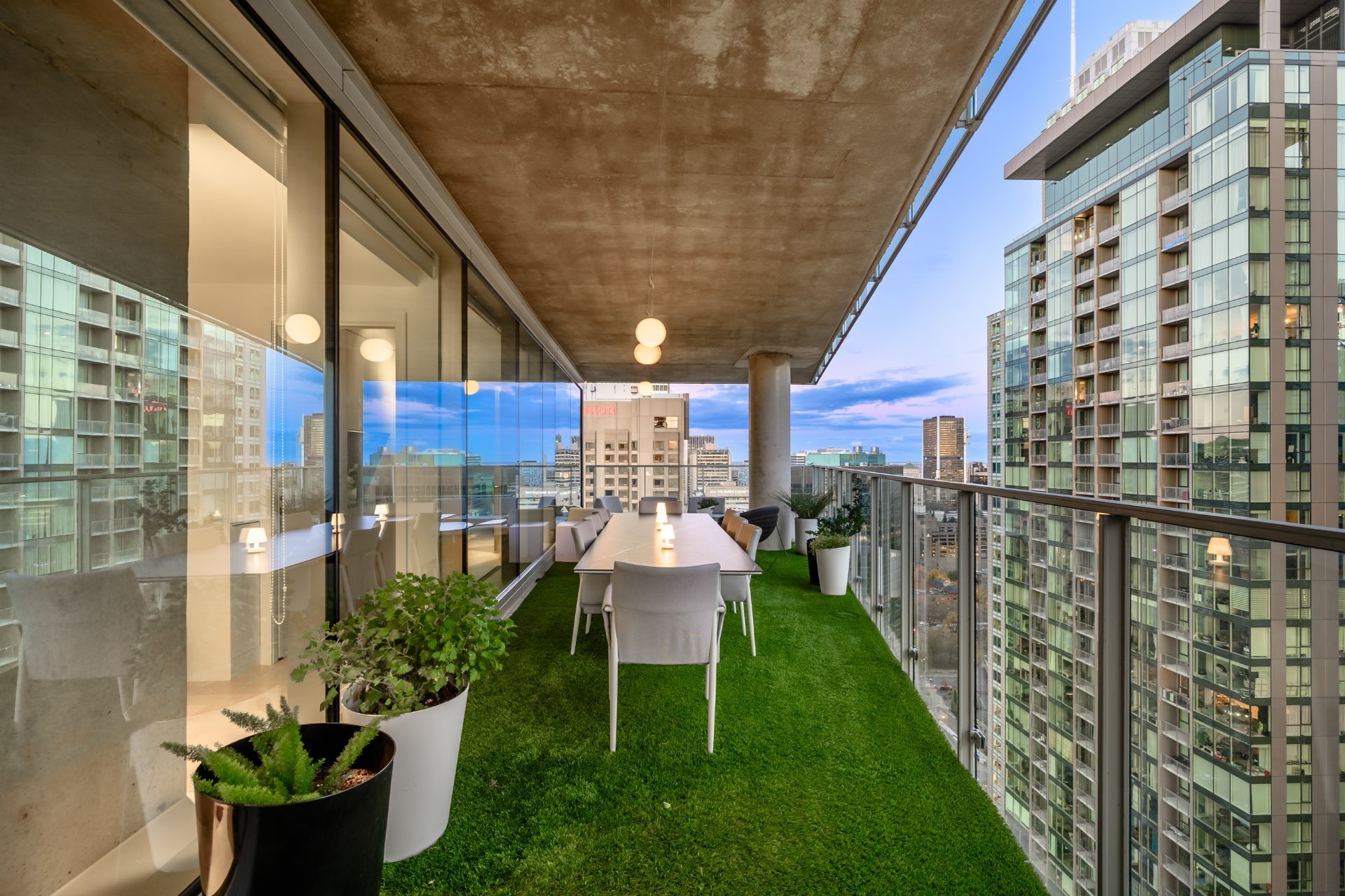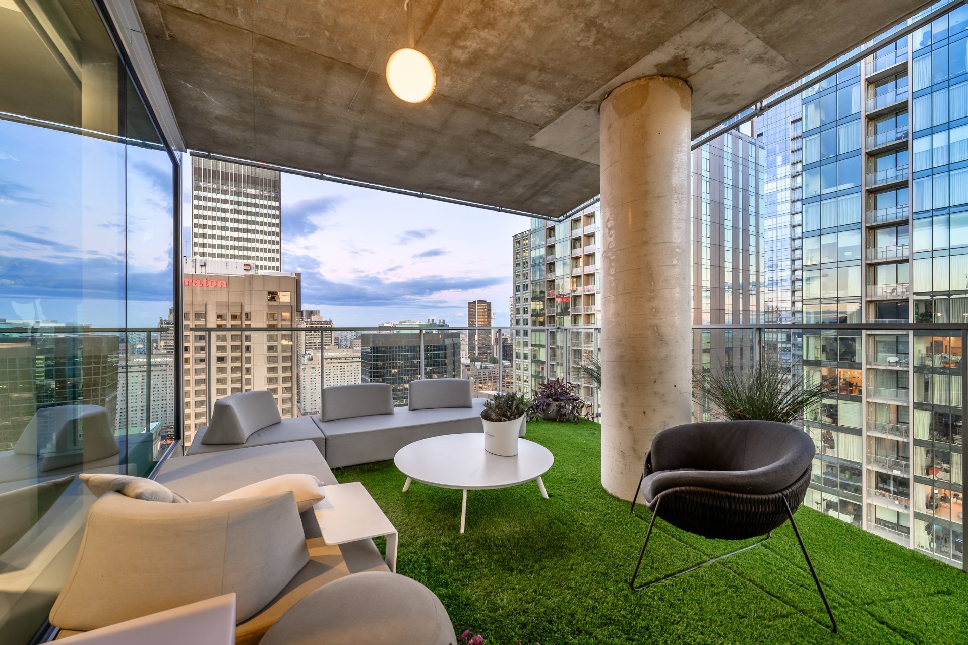 The private terrace is spectacular, offering approximately 400 square feet of synthetic turf, a true extension of the living space.