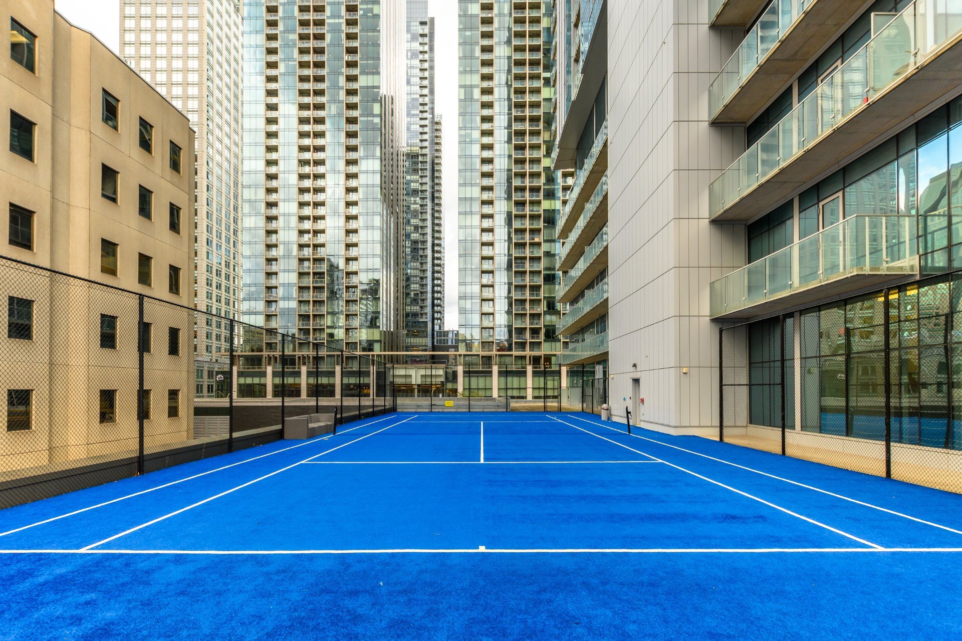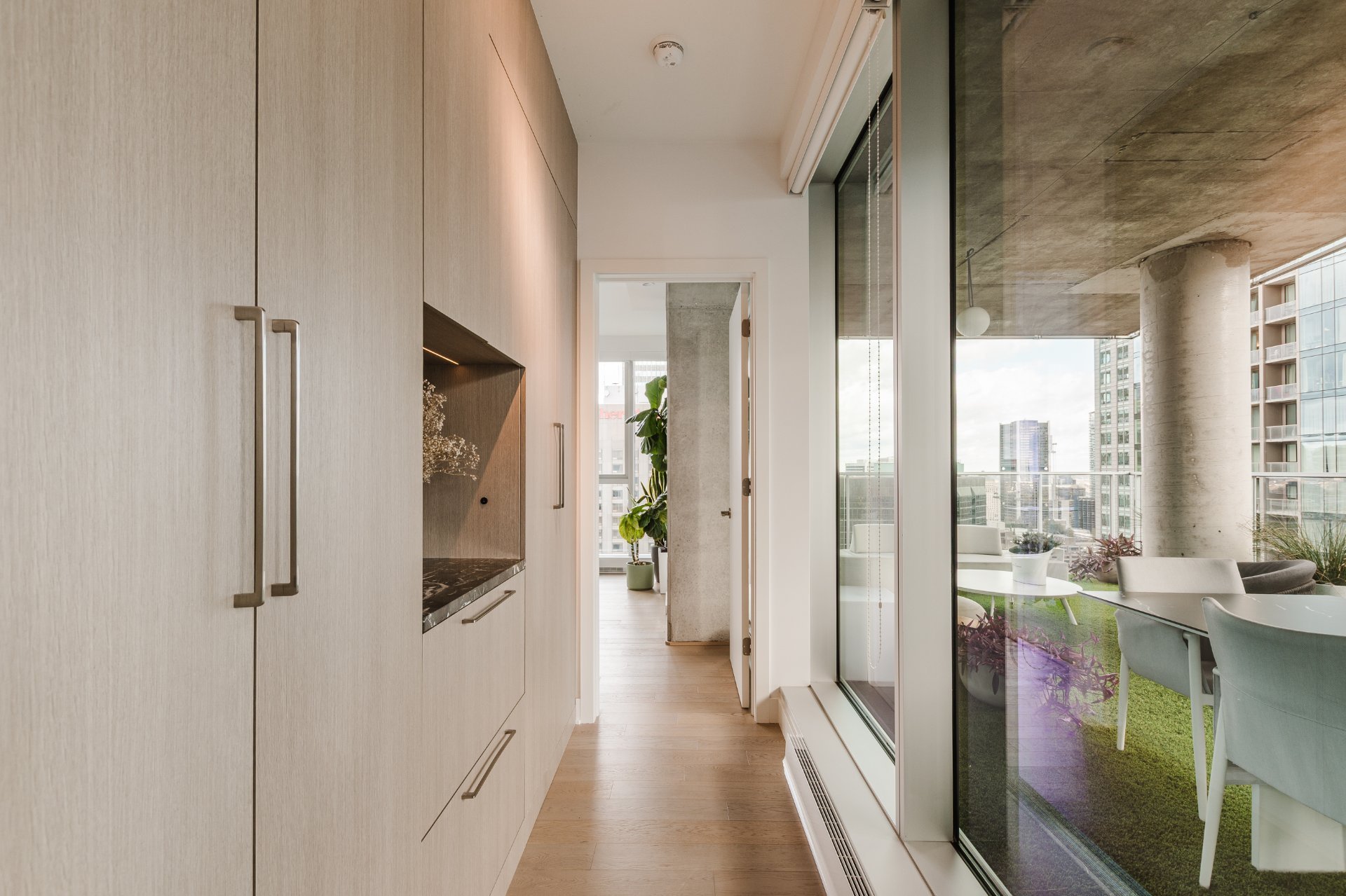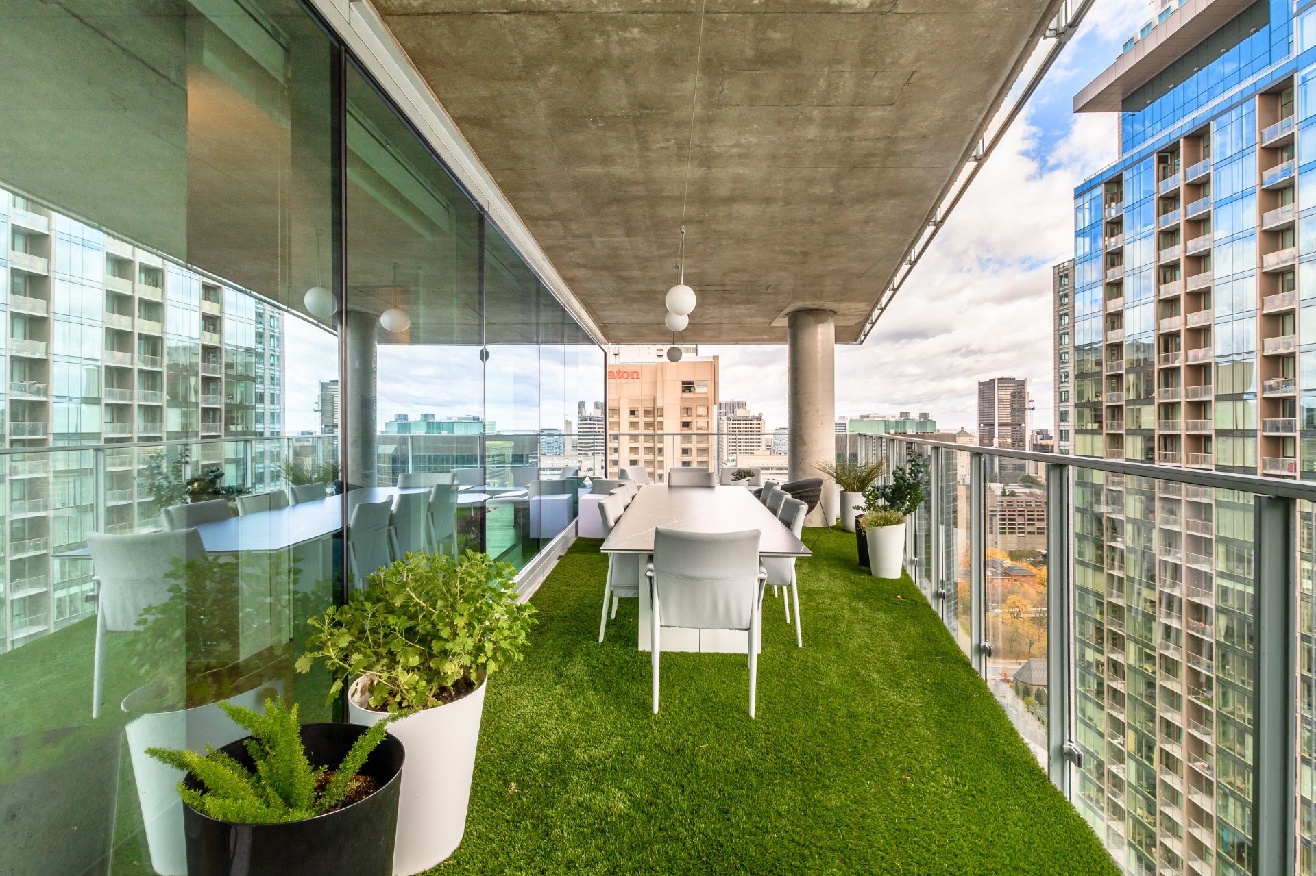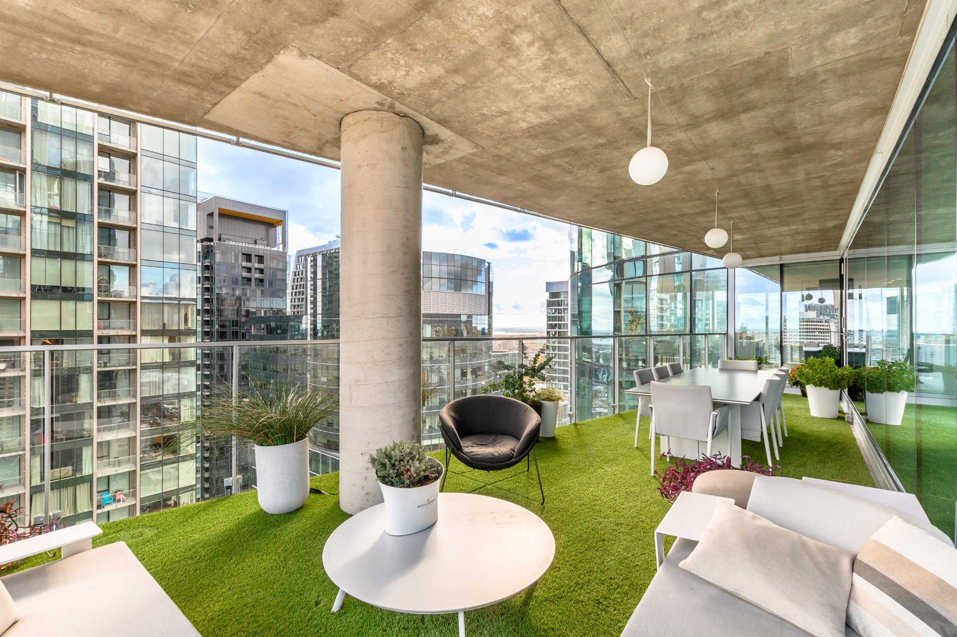 The private terrace is spectacular, offering approximately 400 square feet of synthetic turf, a true extension of the living space.
