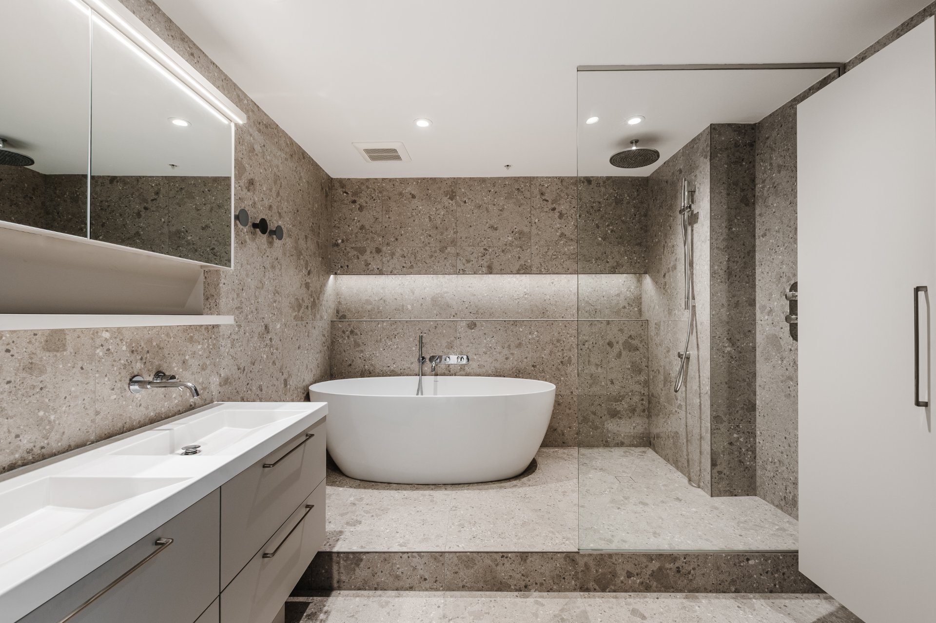 The master suite is inspired by the experience of a luxury hotel. The adjoining bathroom is spacious and includes a freestanding bathtub, heated floors, double sinks, an automatic toilet, and full-height ceramic tile on all walls. The bedroom benefits from custom storage, as does the hallway leading to the suite, offering discreet and efficient organization.