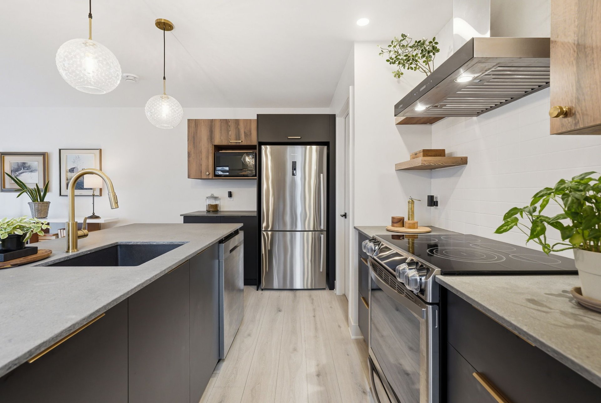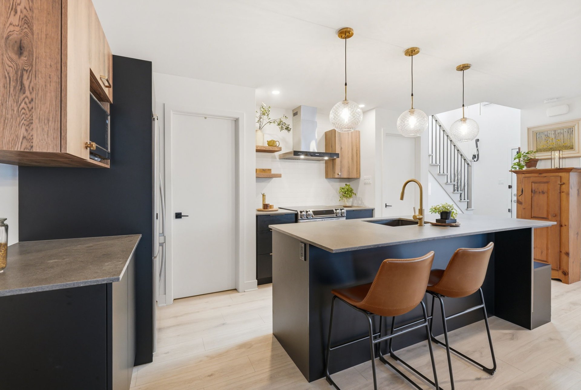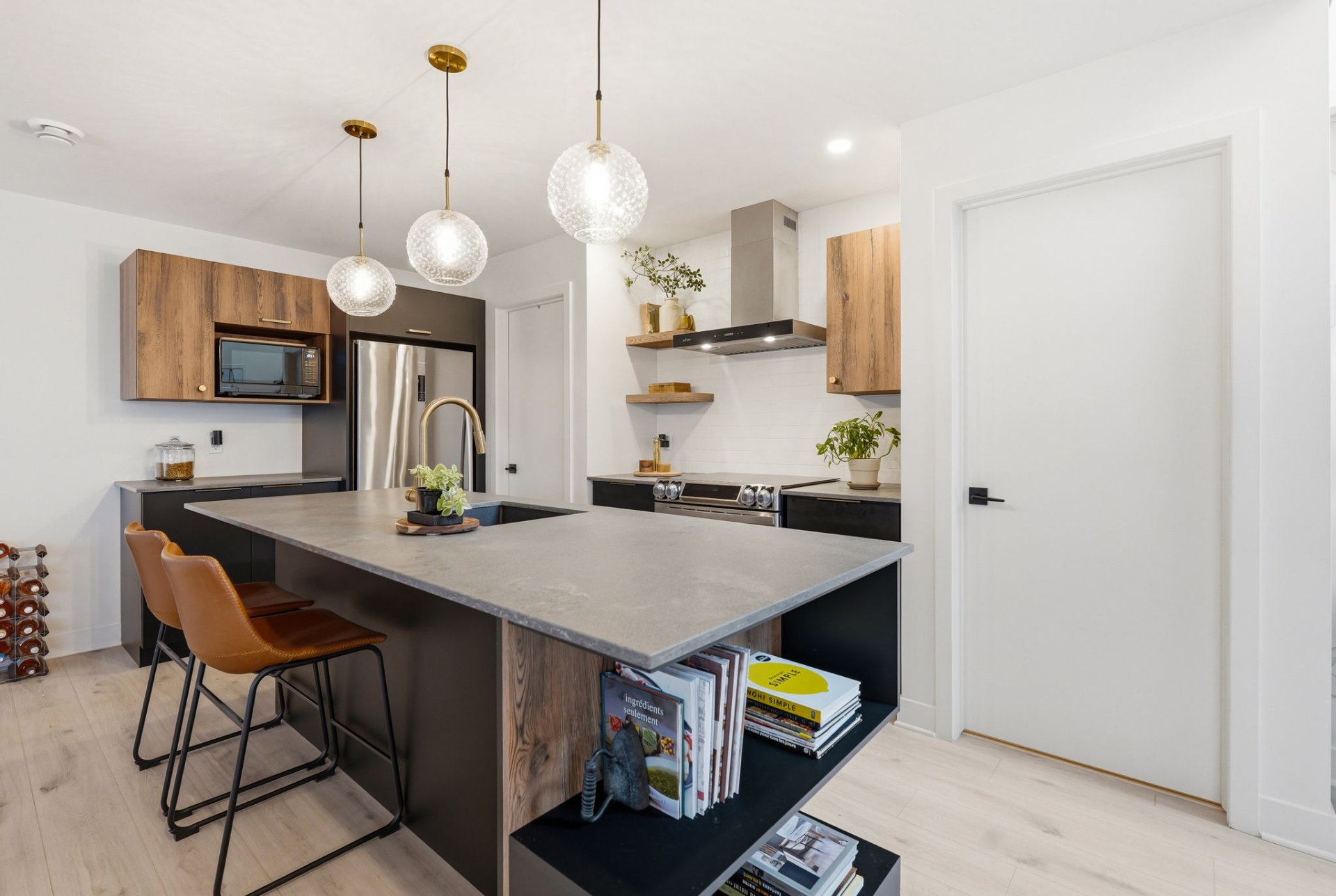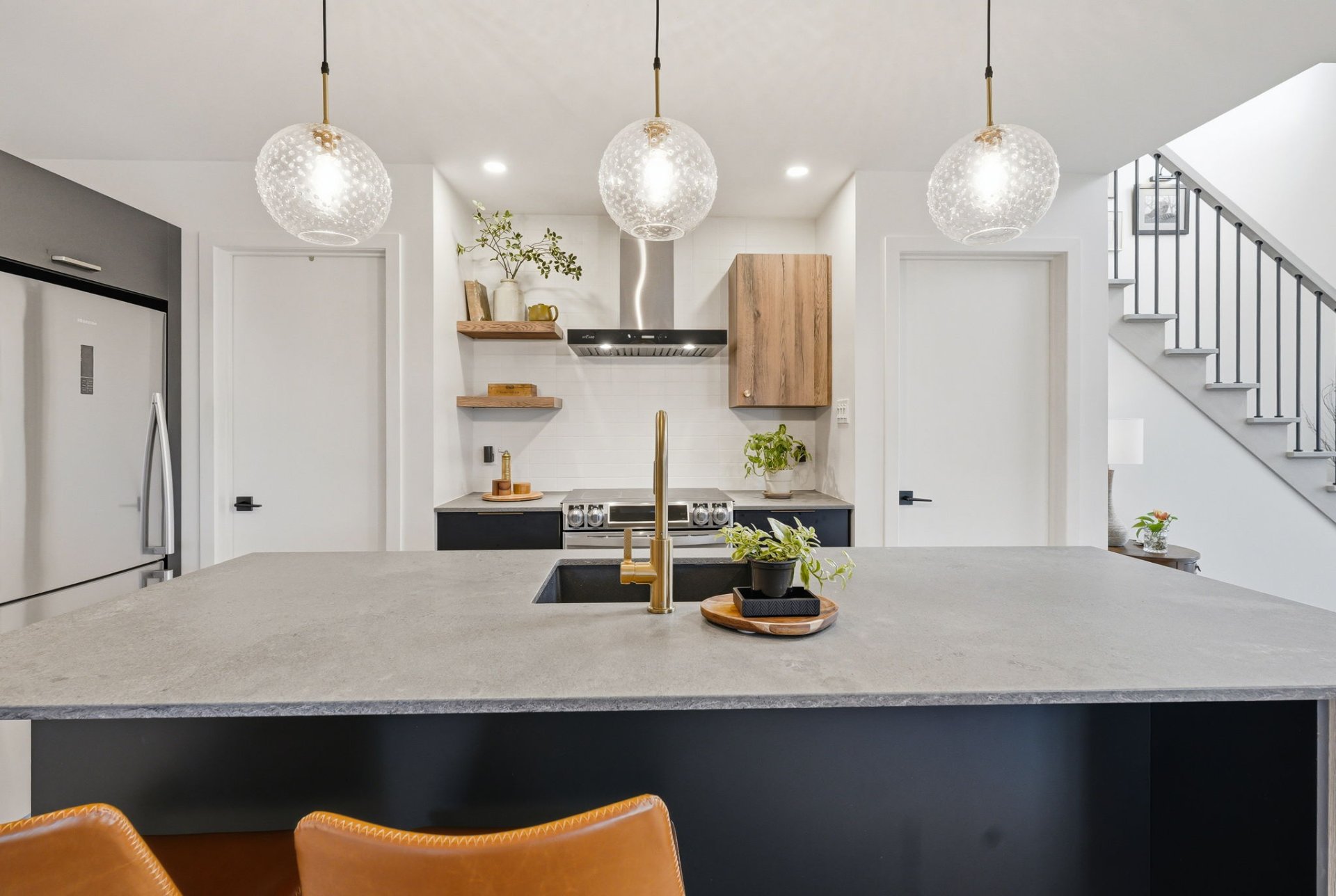 - Contemporary kitchen with large quartz island, ideal for entertaining.