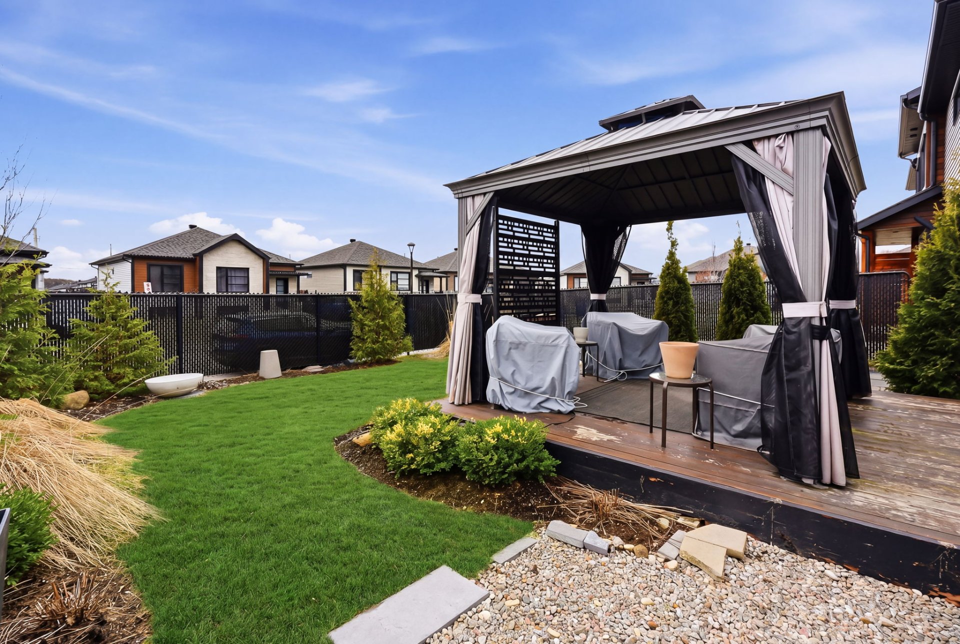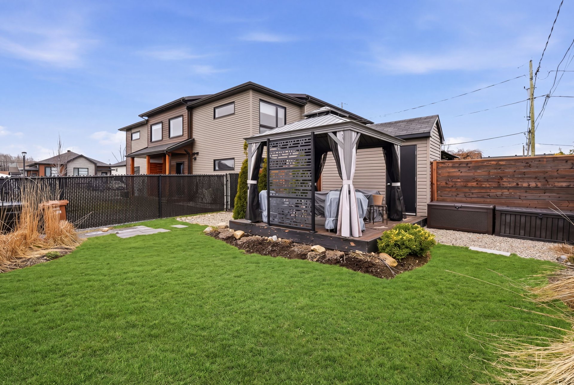 - Large fenced private yard with wonderful gazebo and shed.