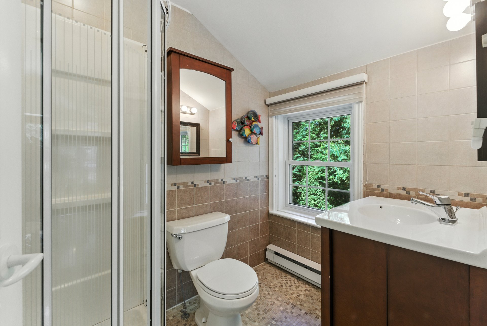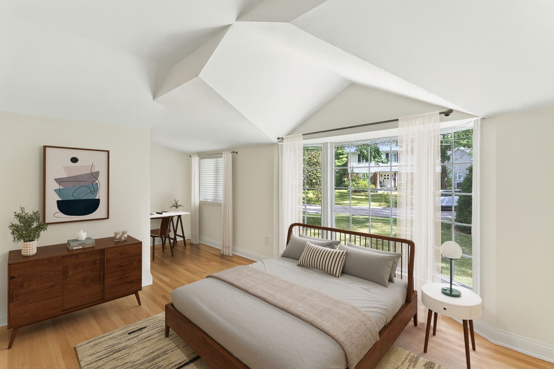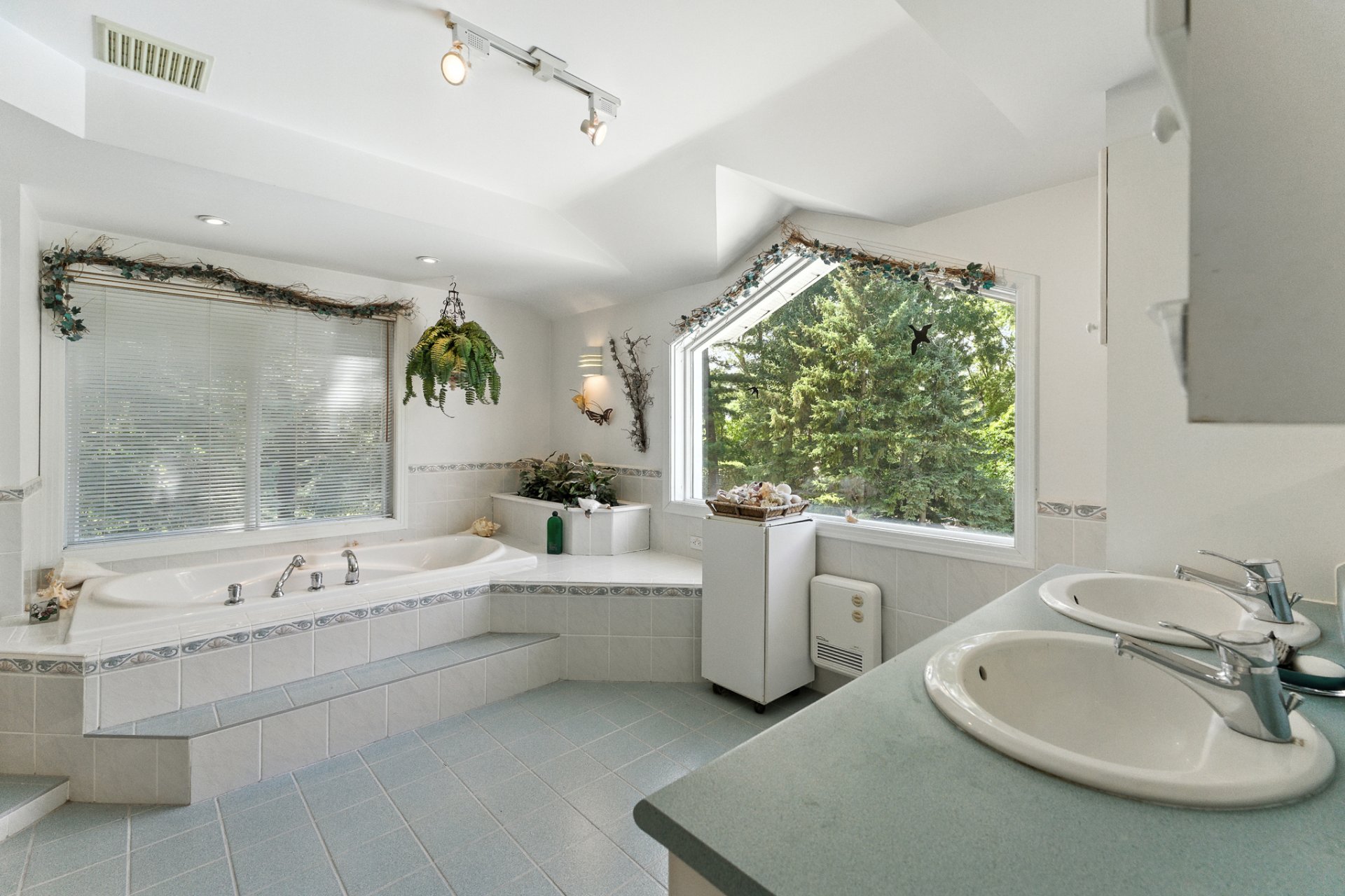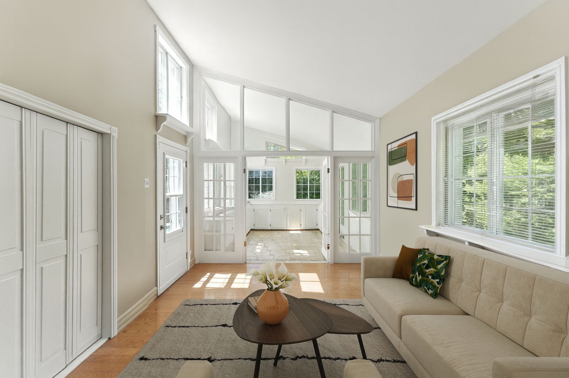 The main floor features a bright living room with a natural stone fireplace, creating a cozy ambiance for family gatherings. The functional kitchen, adjacent to the dining area, overlooks the backyard and pool. A bright sunroom extends the living space, ideal as a reading nook, hobby room, or serene retreat. A versatile den with magnificent views of the manicured landscape adds a perfect touch of tranquility, while a bedroom with its own ensuite bathroom offers a comfortable guest suite or an ideal space for a home office.