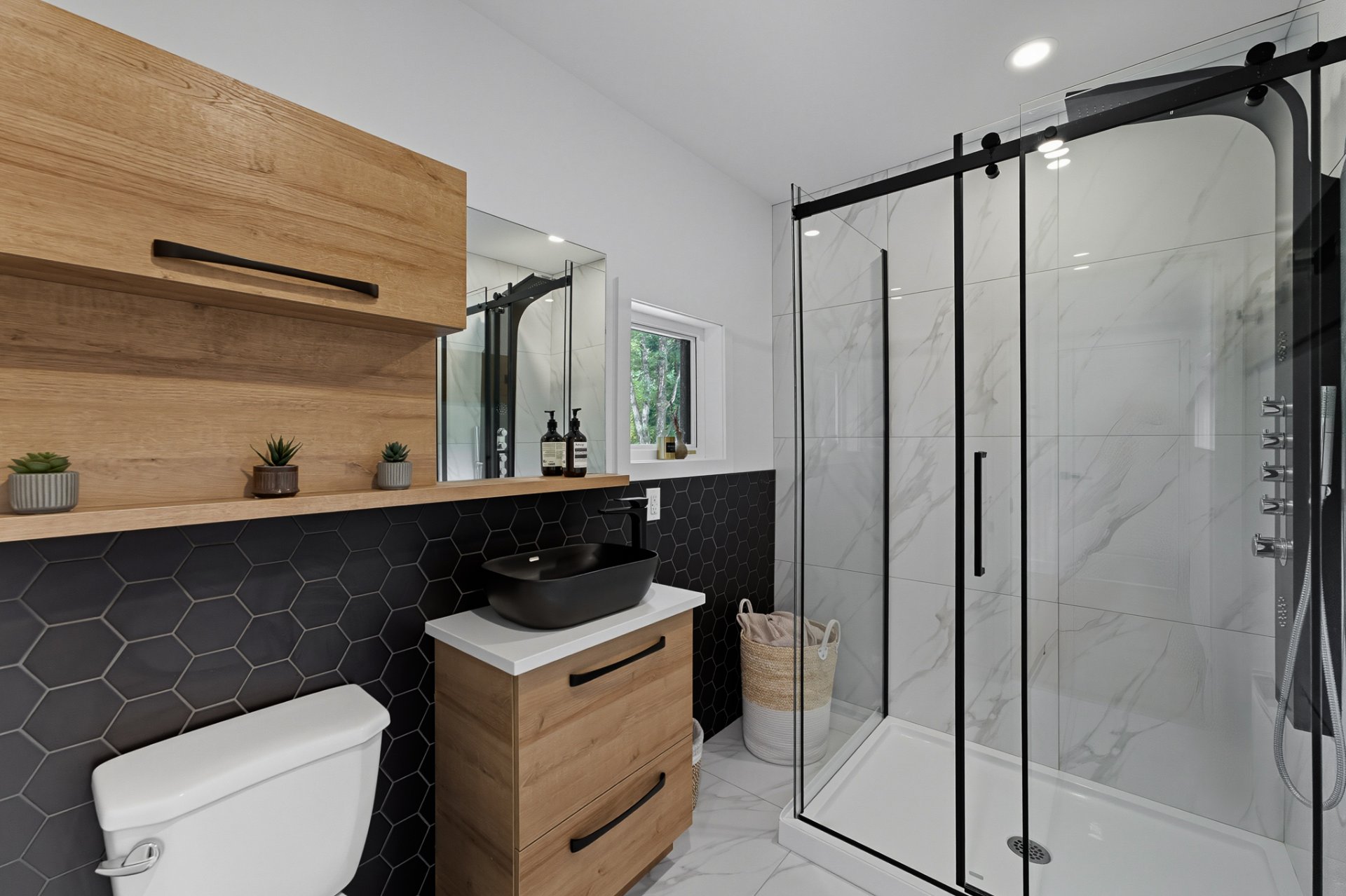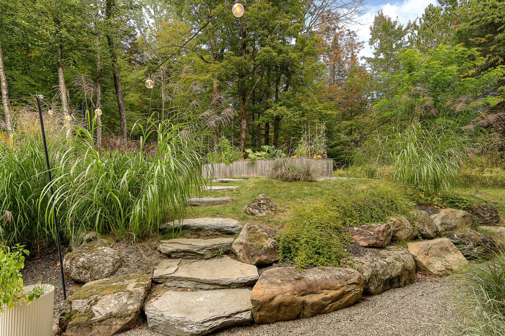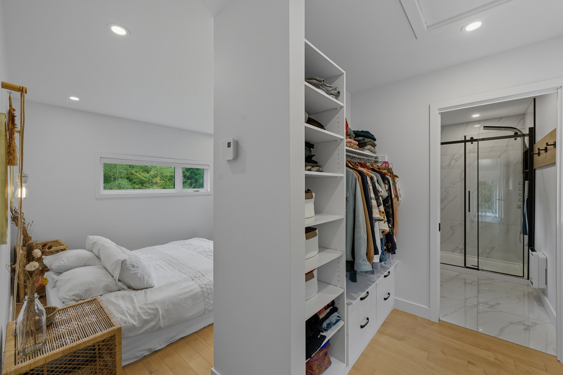 The exterior is equally appealing: a large ground-level patio, meticulously landscaped gardens, raised vegetable beds, and a wooded setting provide privacy and tranquility, with no rear neighbors. The second-floor terrace includes a staircase for direct access to the backyard. A spacious heated storage area is integrated into the home, ideal for sports equipment and gardening tools. Every space has been designed to enhance well-being and outdoor living.