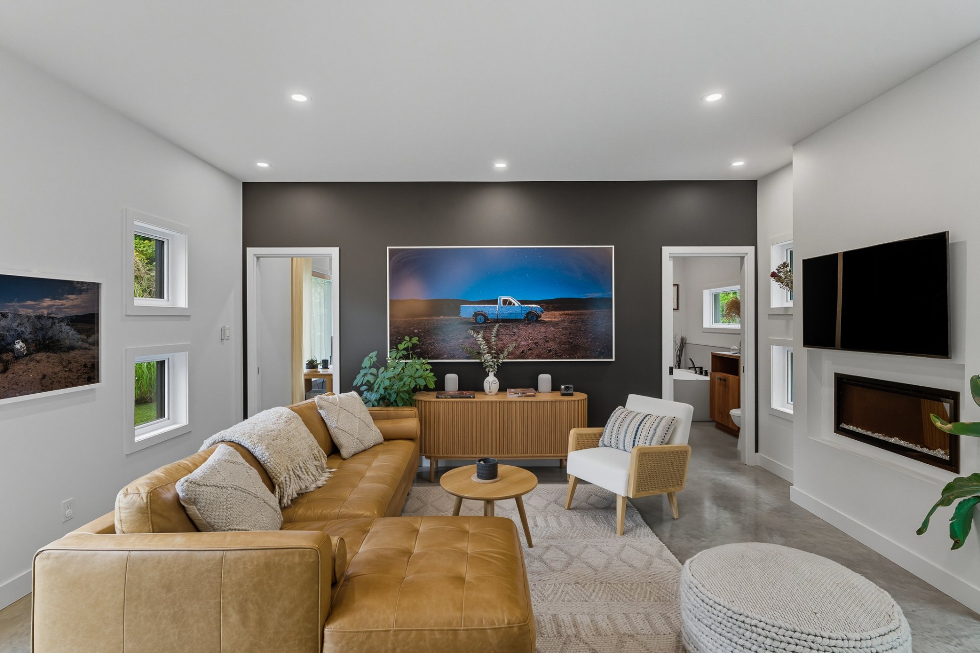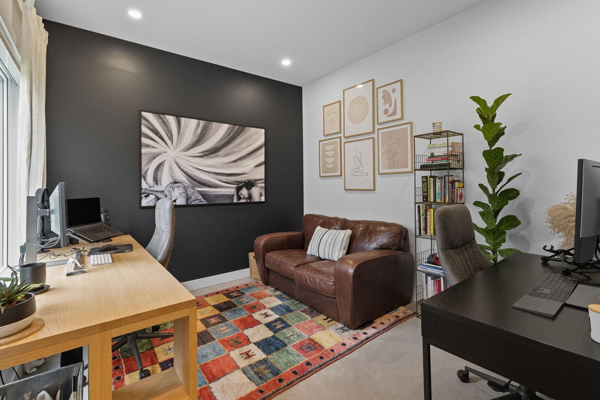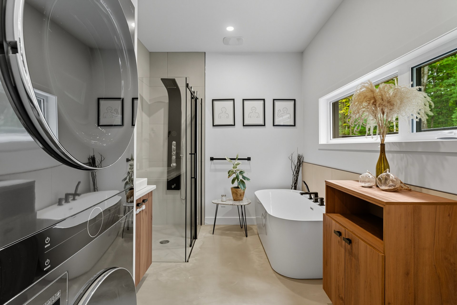Also on the main level, a modern bathroom features a laundry area, a glass-enclosed shower, and a freestanding bathtub. A bright office, which could also serve as a bedroom, adds flexibility and comfort to the layout.