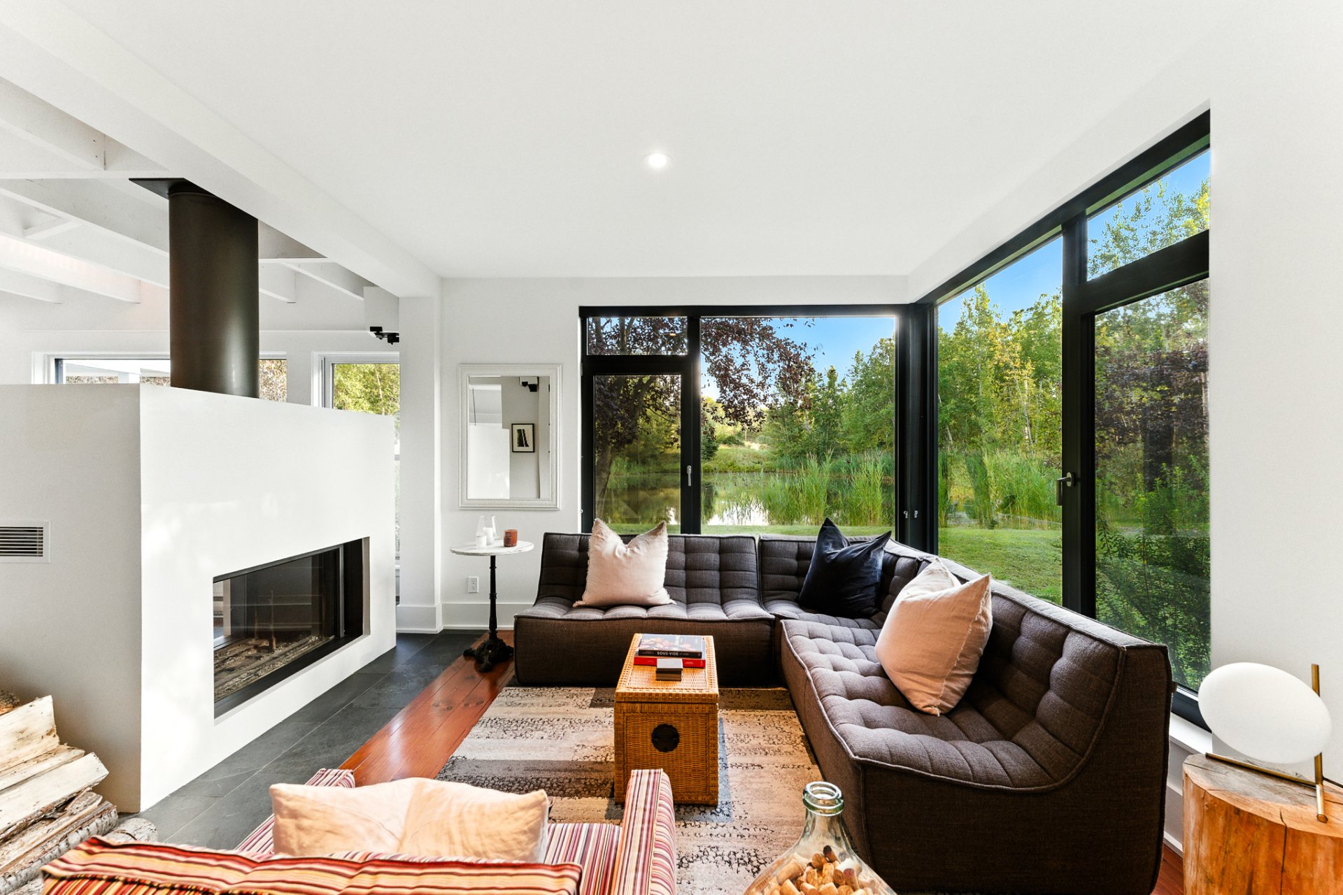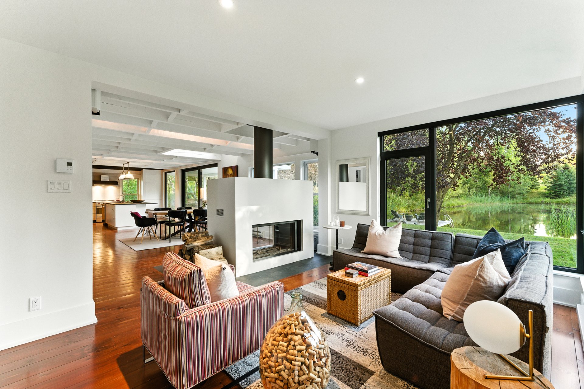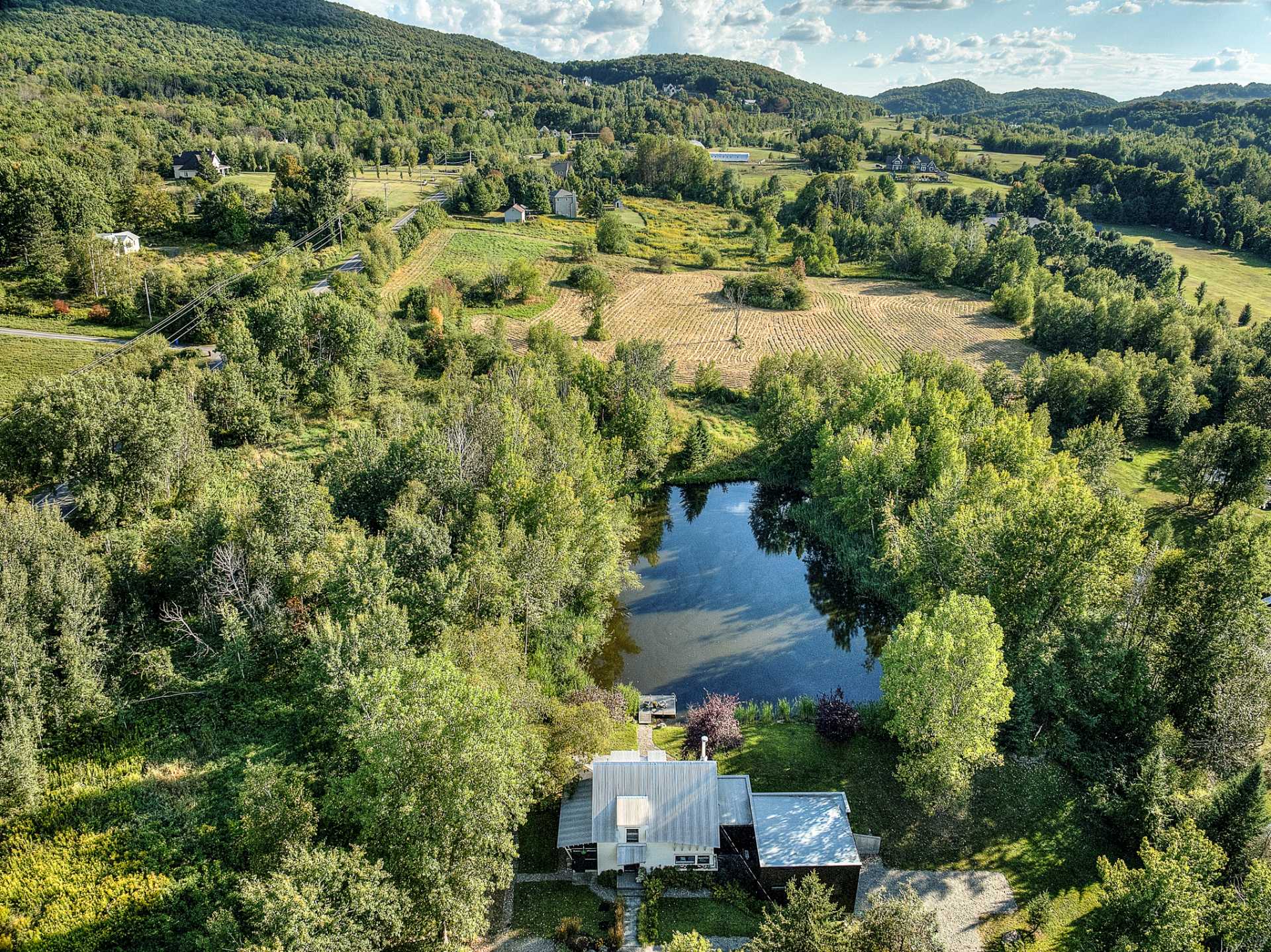 Set in a bucolic landscape, just minutes from the vibrant village of Bromont, its ski mountain and trail network, this exceptional property captures the true essence of an architect-designed home in perfect harmony with nature. Nestled on a 4.8 acre wooded and landscaped property, the residence charms with its seamless balance of rustic authenticity and contemporary design. South-facing, it is filled with natural light and offers stunning views of a private swimmable pond and the surrounding mountains. The home features an entertainer's kitchen, a warm and inviting living area, and a luxurious primary suite. A unique setting!