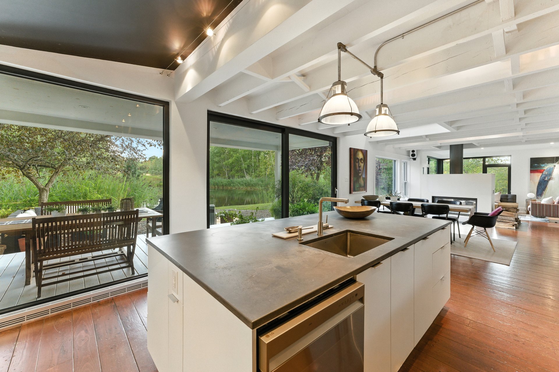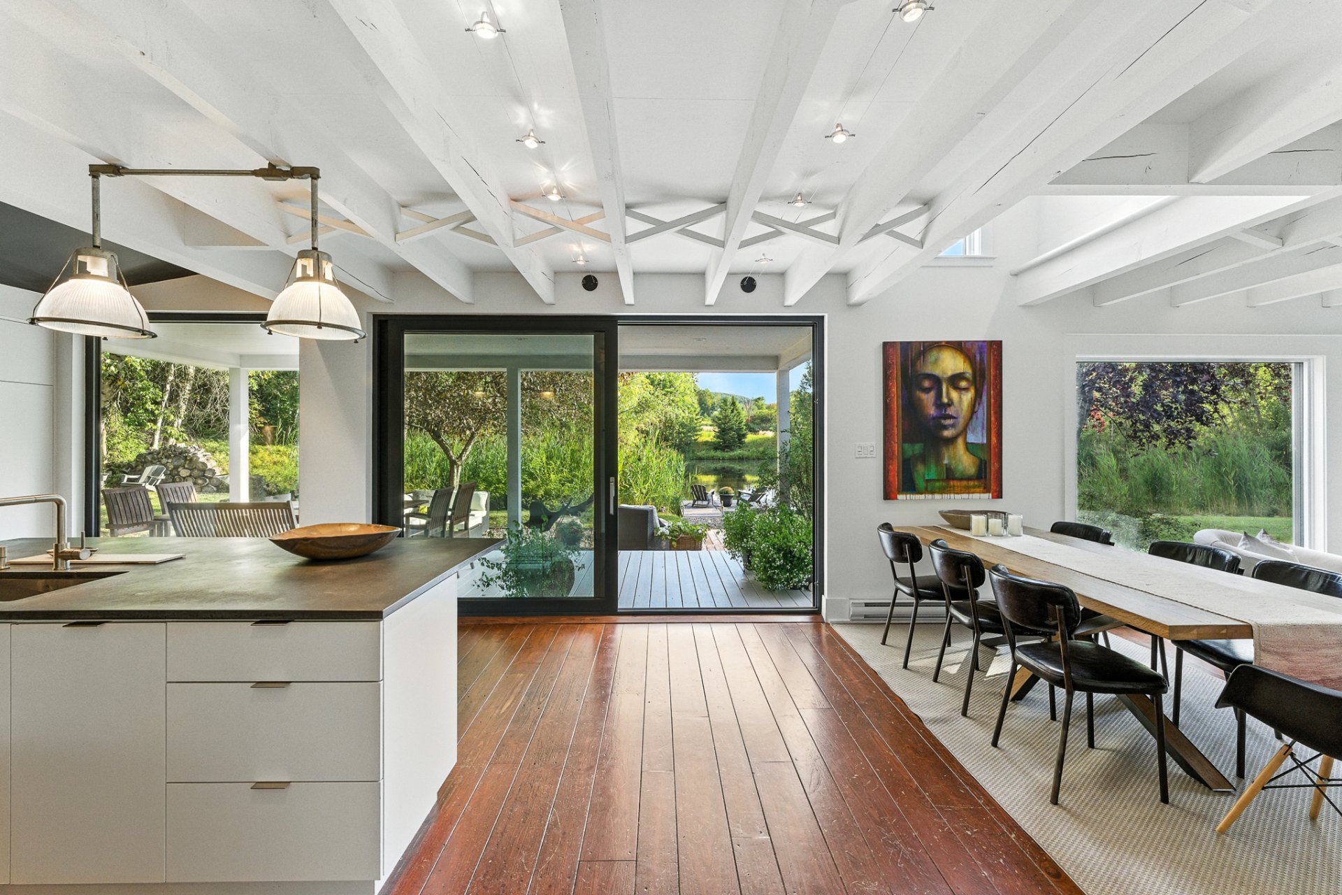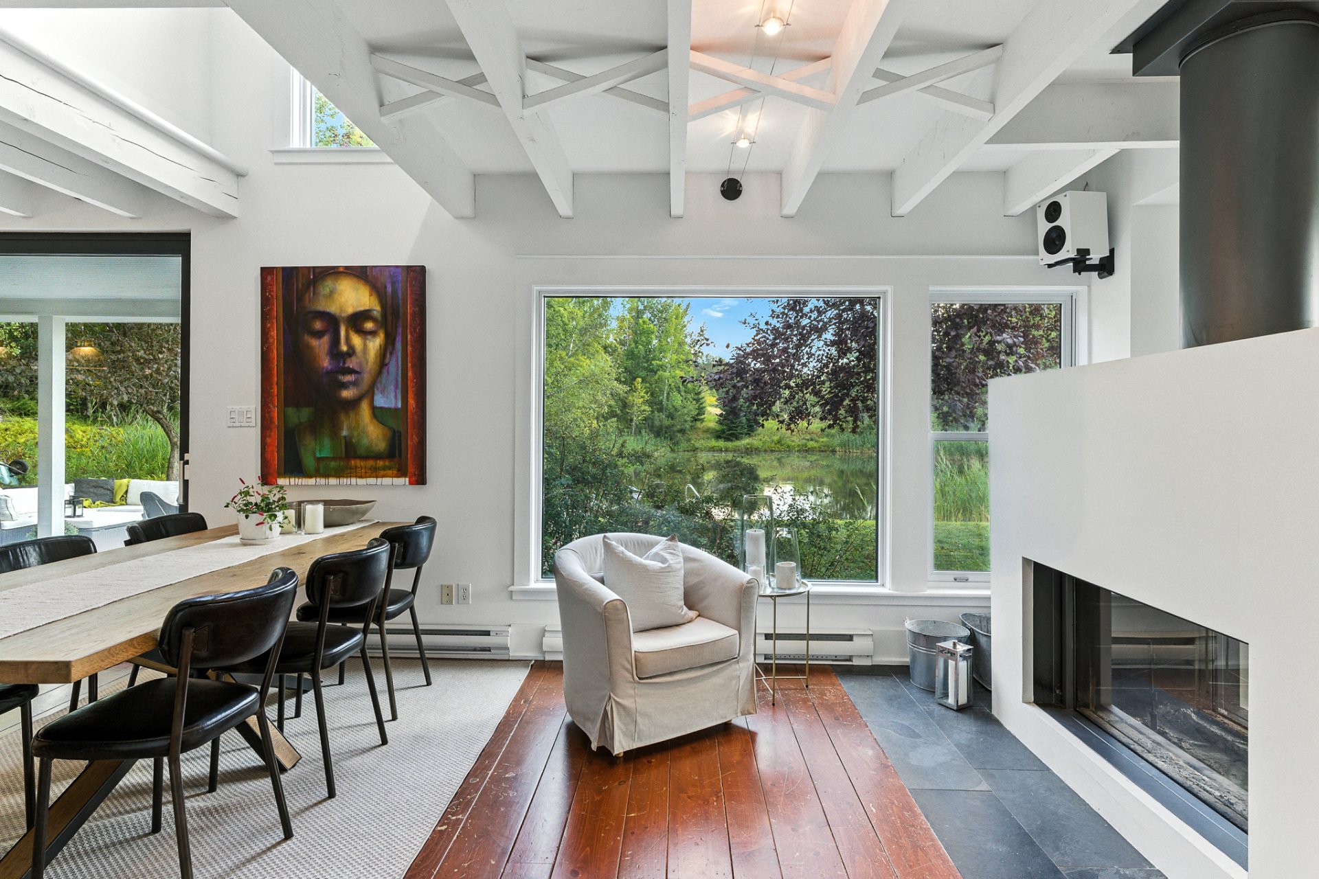 Set in a bucolic landscape, just minutes from the vibrant village of Bromont, its ski mountain and trail network, this exceptional property captures the true essence of an architect-designed home in perfect harmony with nature. Nestled on a 4.8 acre wooded and landscaped property, the residence charms with its seamless balance of rustic authenticity and contemporary design. South-facing, it is filled with natural light and offers stunning views of a private swimmable pond and the surrounding mountains. The home features an entertainer's kitchen, a warm and inviting living area, and a luxurious primary suite. A unique setting!