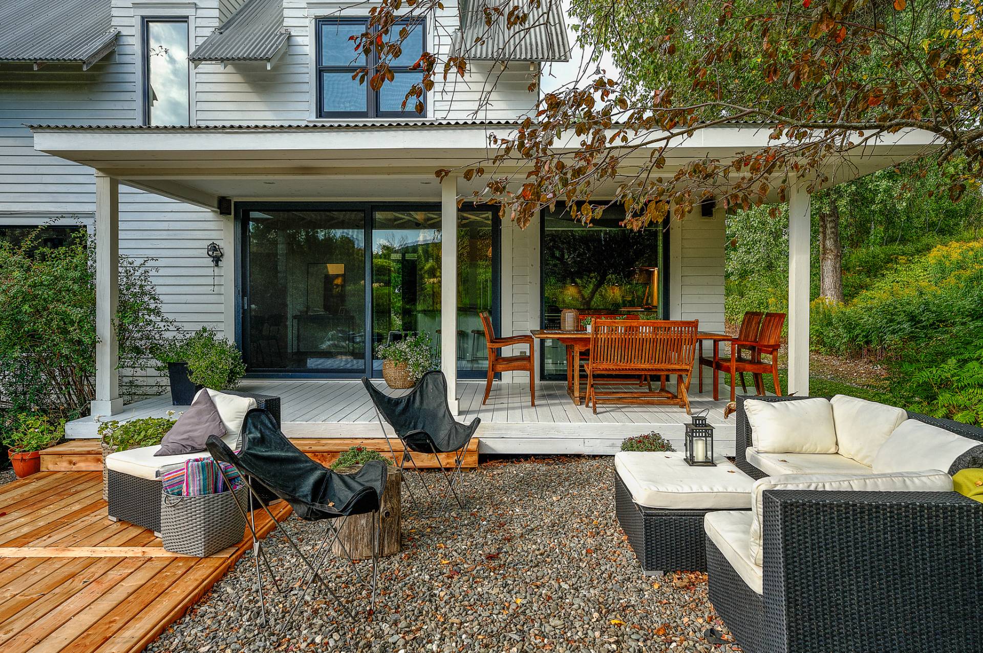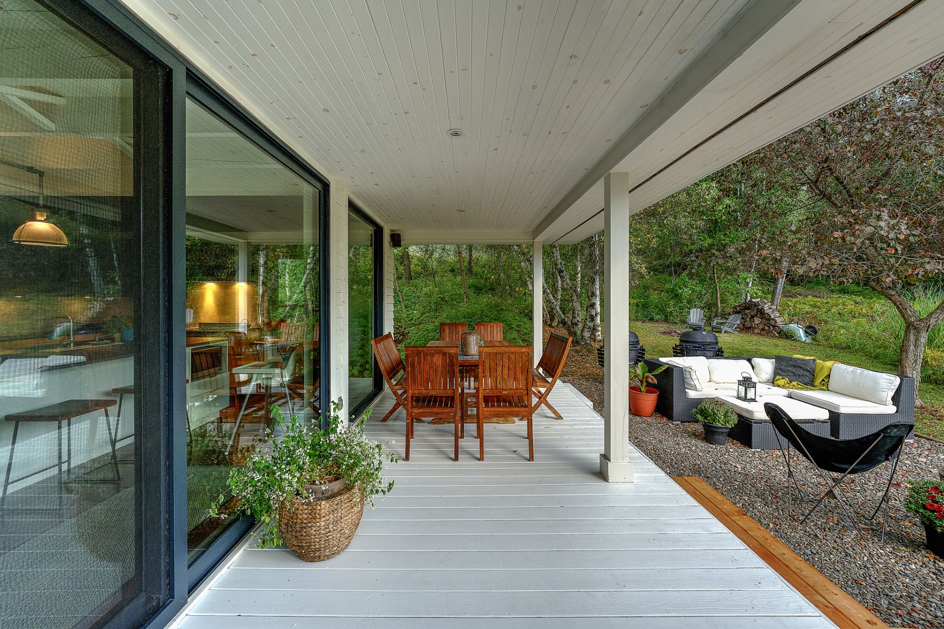 The interior design, marked by refined simplicity, invites relaxation. Materials such as wood paneling, light or white maple, anthracite window frames, and whitewashed pine flooring offer a palette of textures whose neutral tones highlight the natural landscapes framed by the large windows.