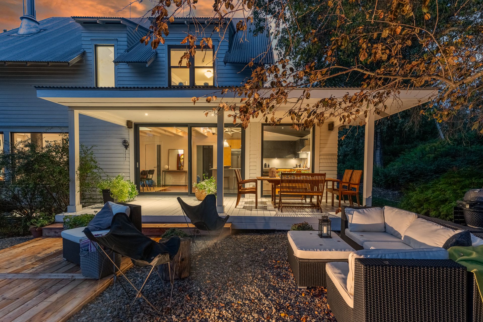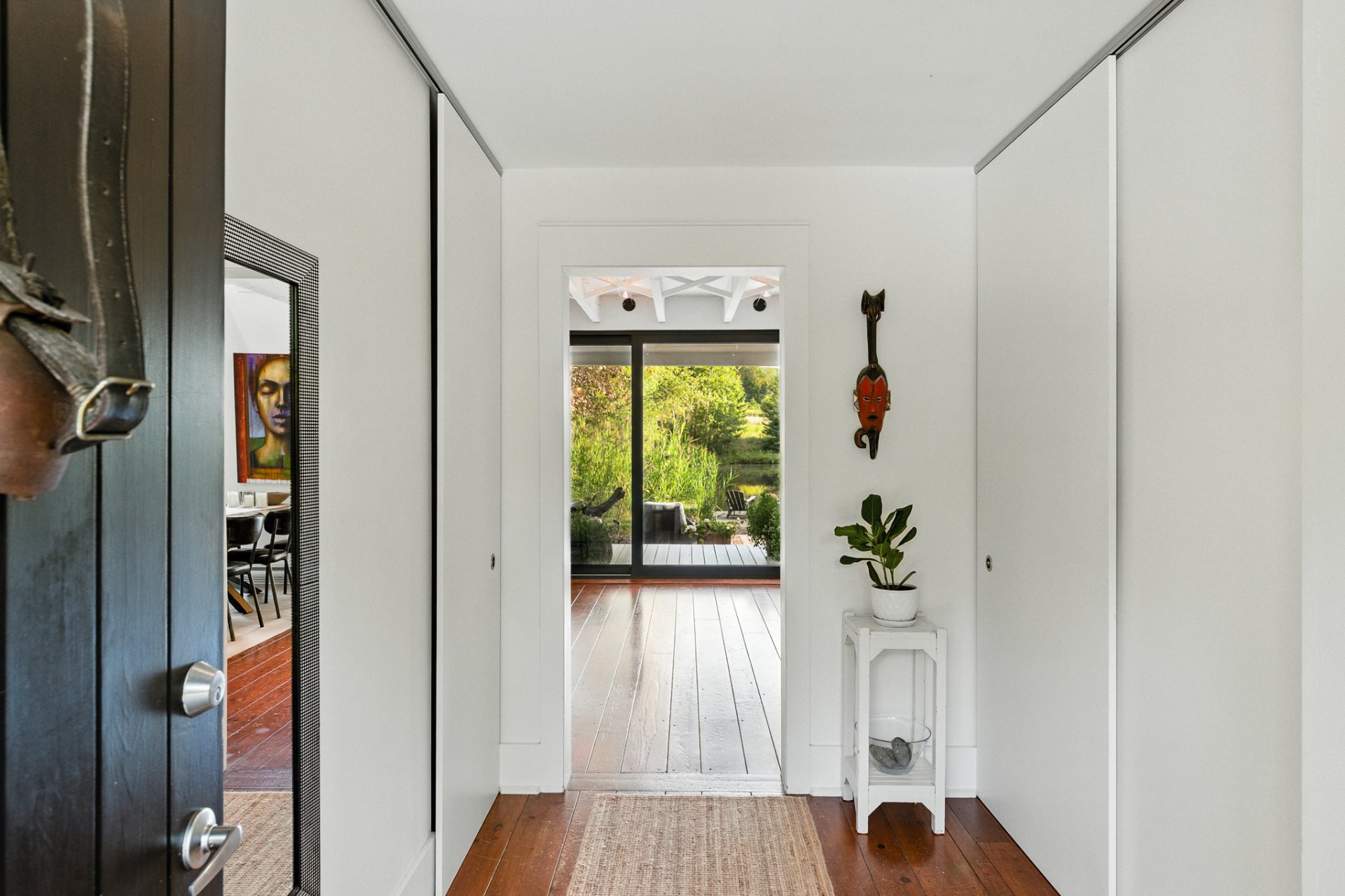 Outdoors, the property unfolds into a private, lush setting with a pond, soothing mountain views, and landscaped areas perfect for relaxation.