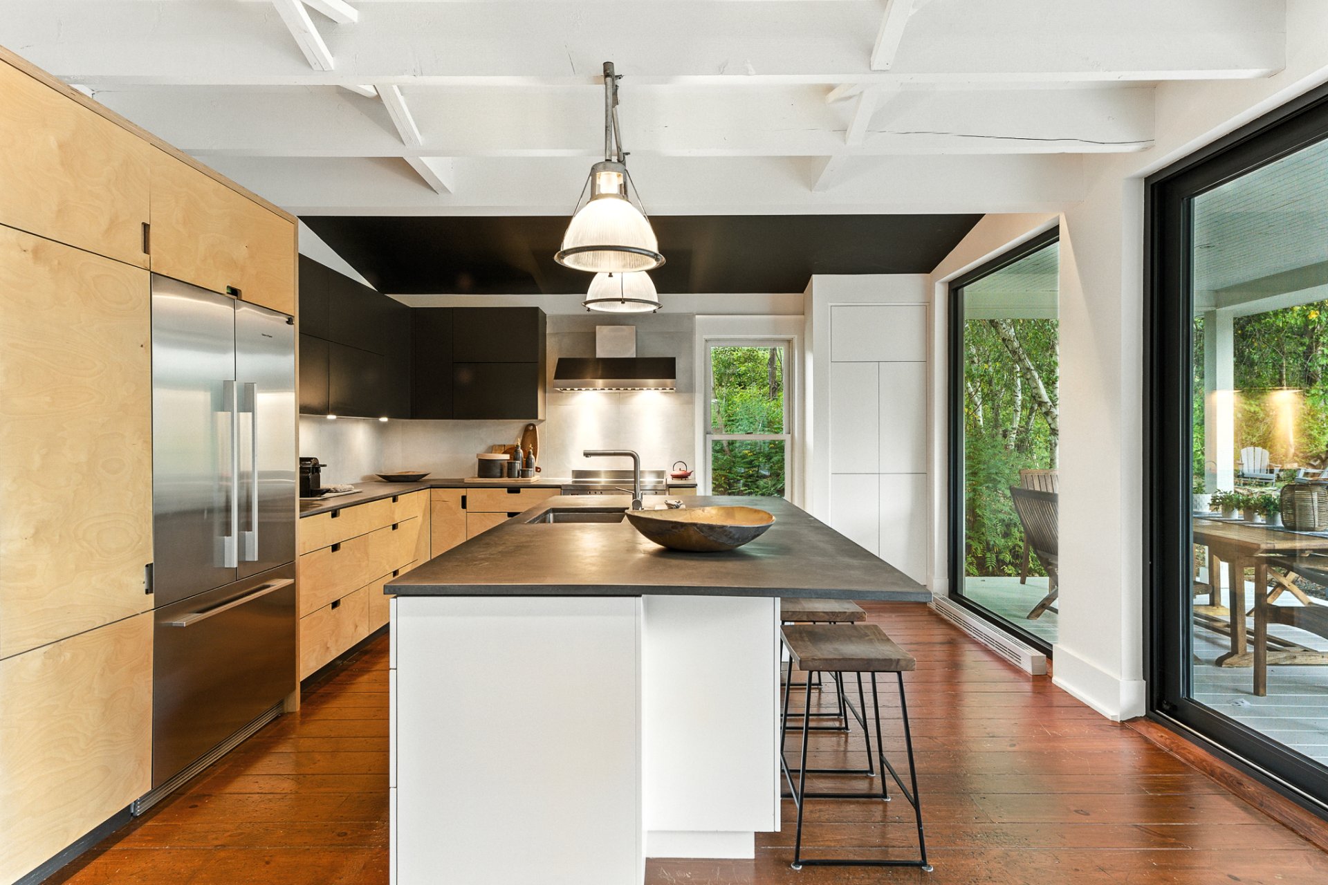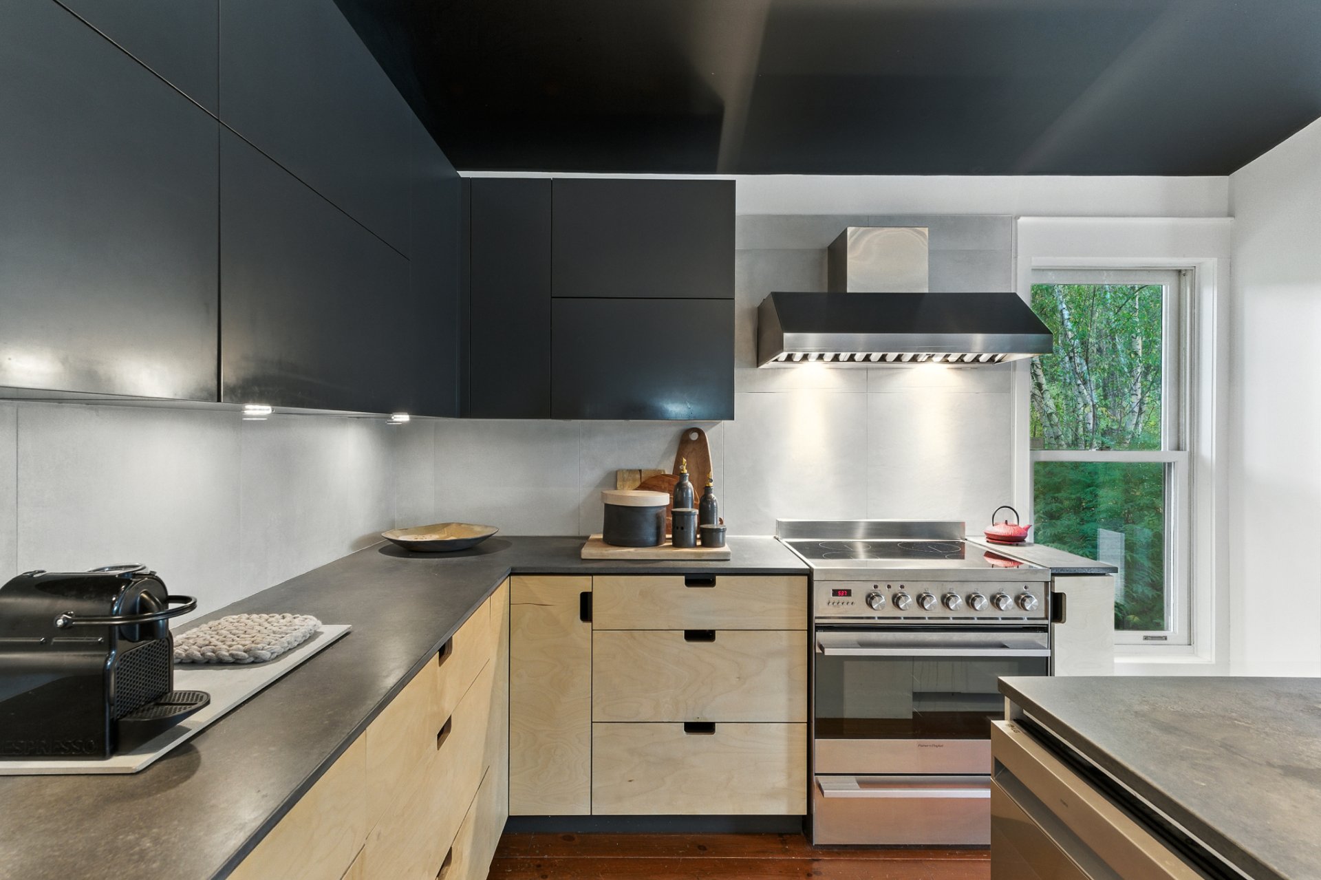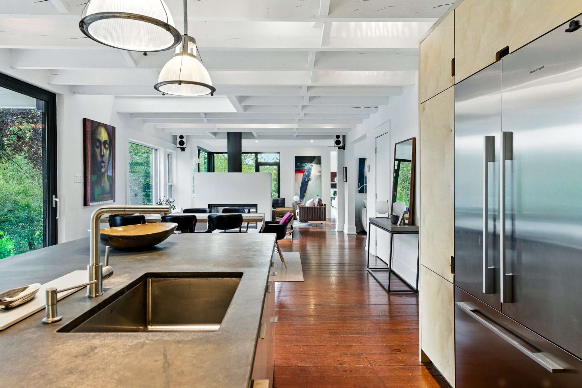 The kitchen, envisioned as a true space for culinary creation, combines the strength of concrete with the elegance of Russian plywood. The double-sided Stûv fireplace sets a cozy atmosphere from the living room to the dining area.