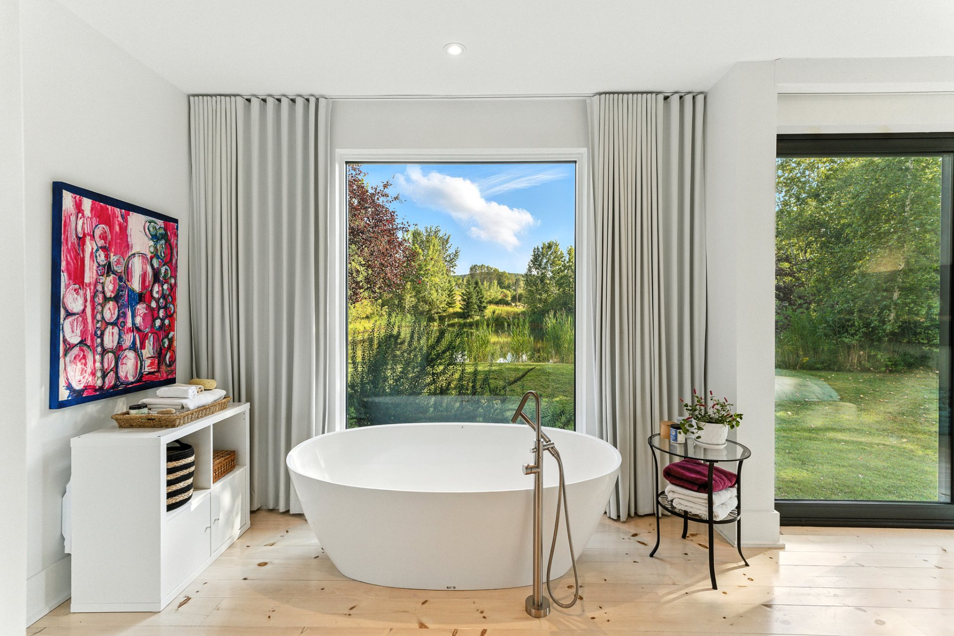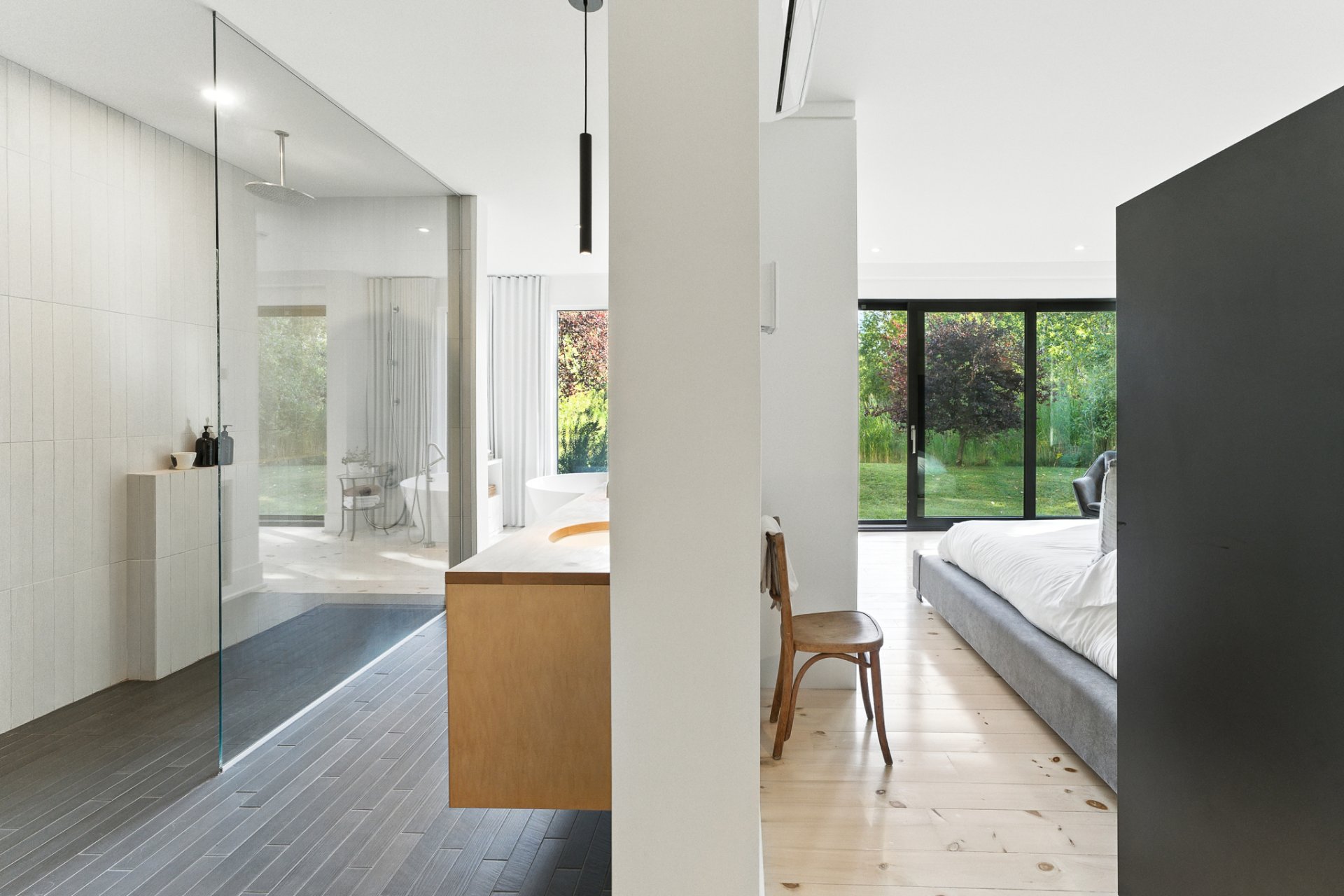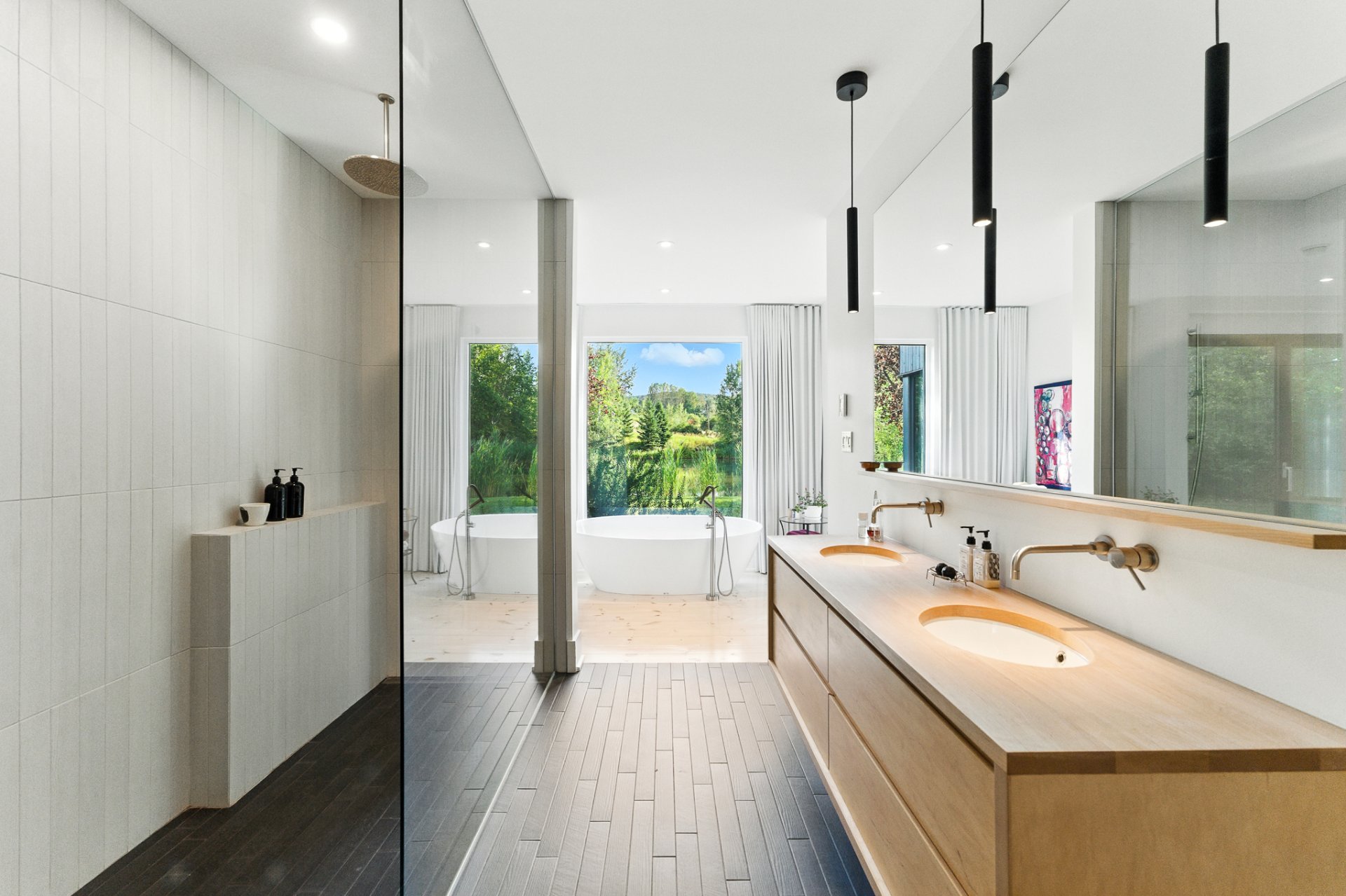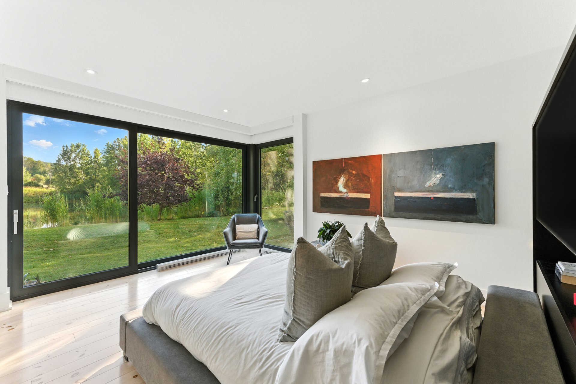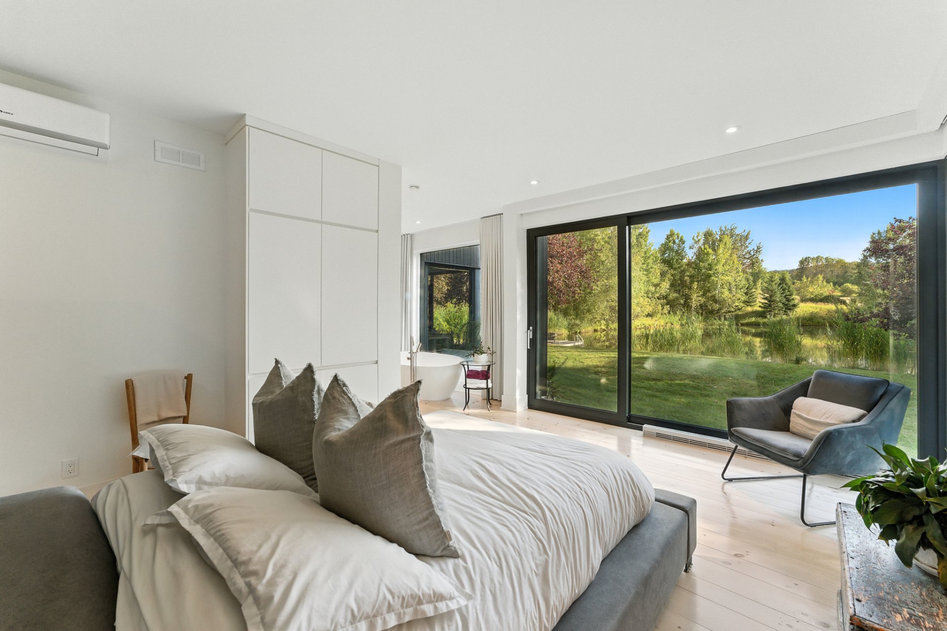 The primary suite, set apart for greater privacy, stands out for its serenity and views of the private pond. The adjoining luxurious bathroom, with its sleek lines, features a freestanding tub overlooking the water, a walk-in shower, all staged with refined elegance.