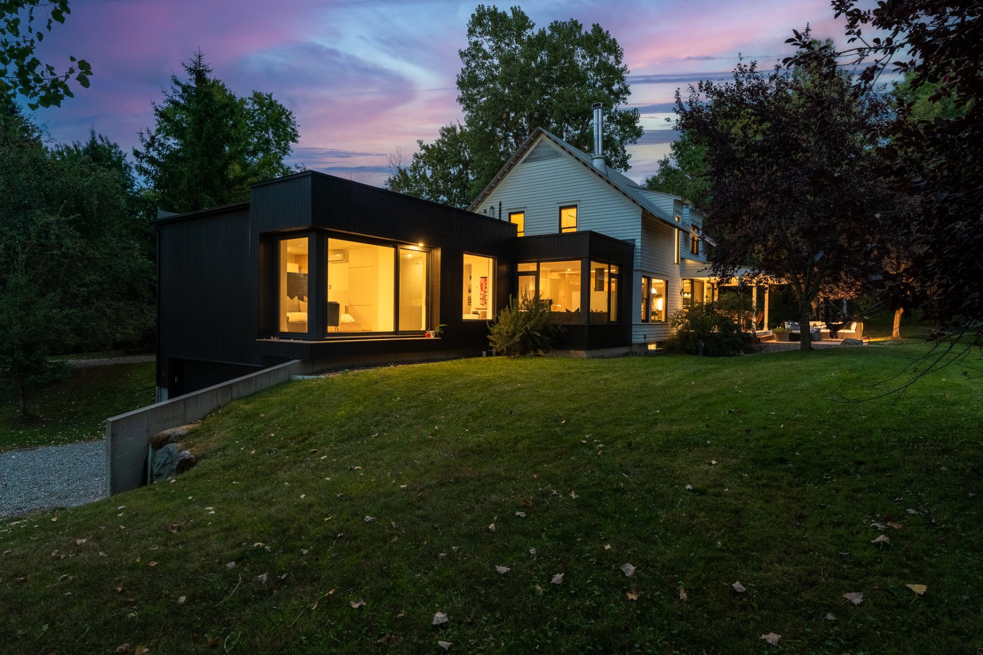 This exceptional residence unfolds all its charm on a carefully landscaped 4.8-acre lot, just steps from the renowned Bromont Equestrian Center. From the very first approach, the eye is captivated by the harmonious contrast between the original home, meticulously renovated, and the modern wing conceived as a boutique hotel inspired owner's suite. Together, they create a singular architectural universe--both bold and sophisticated.