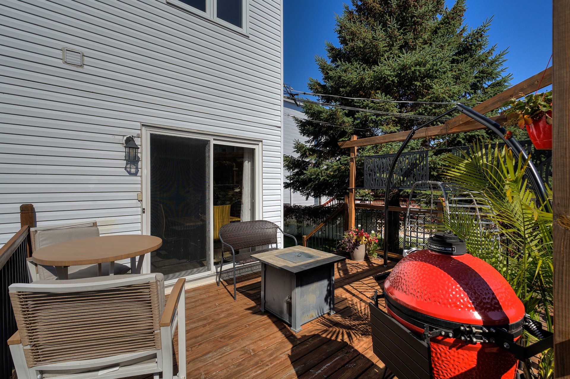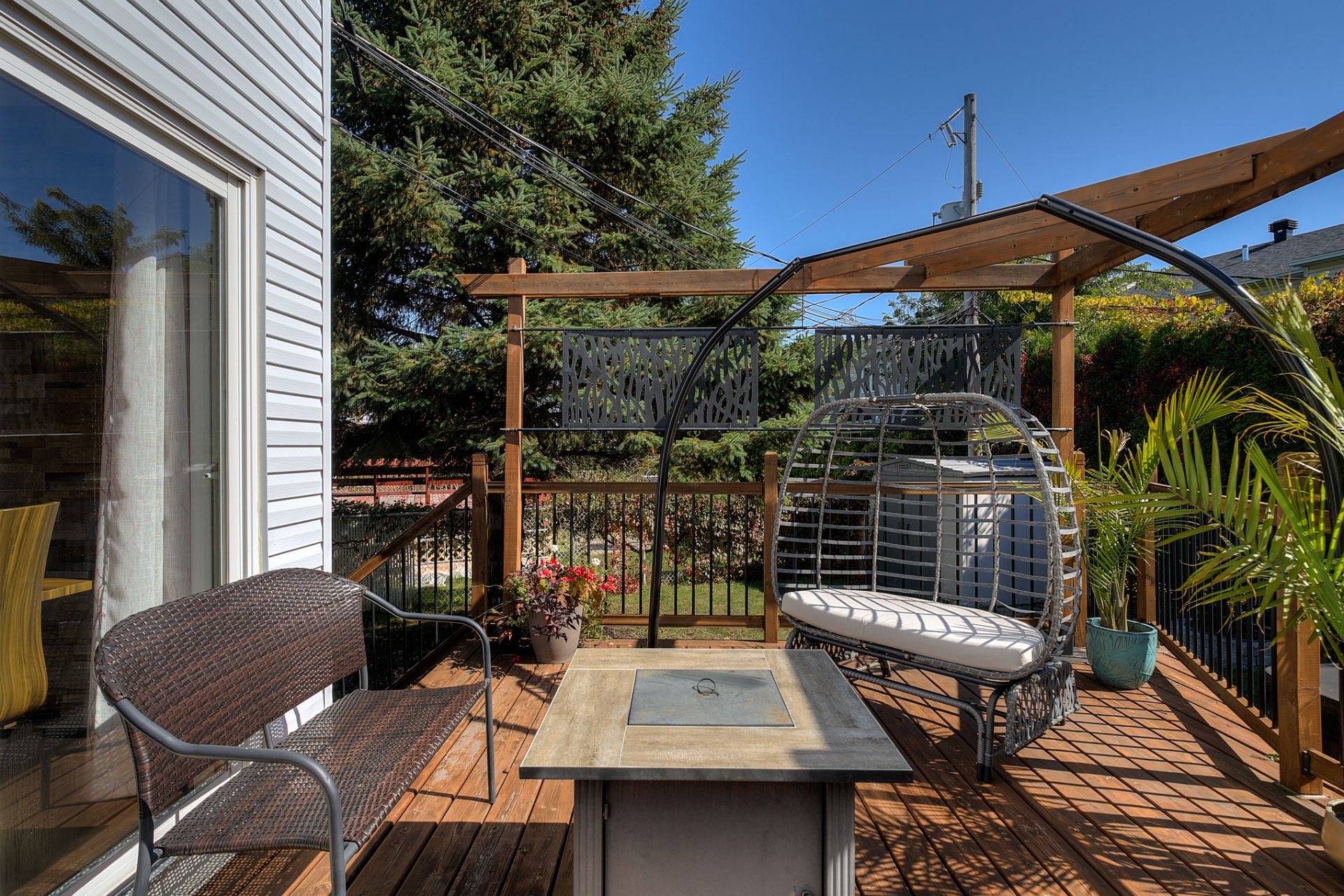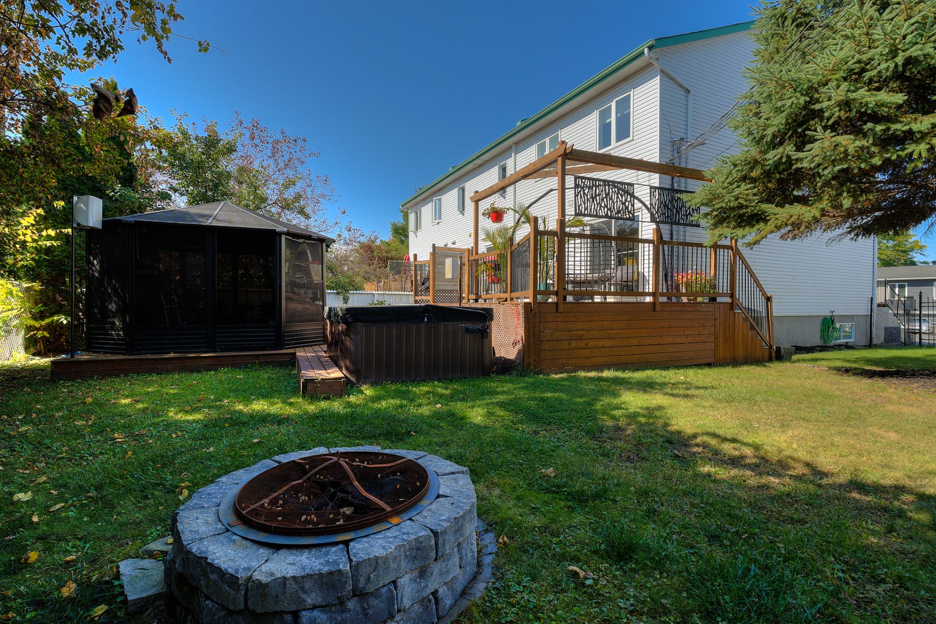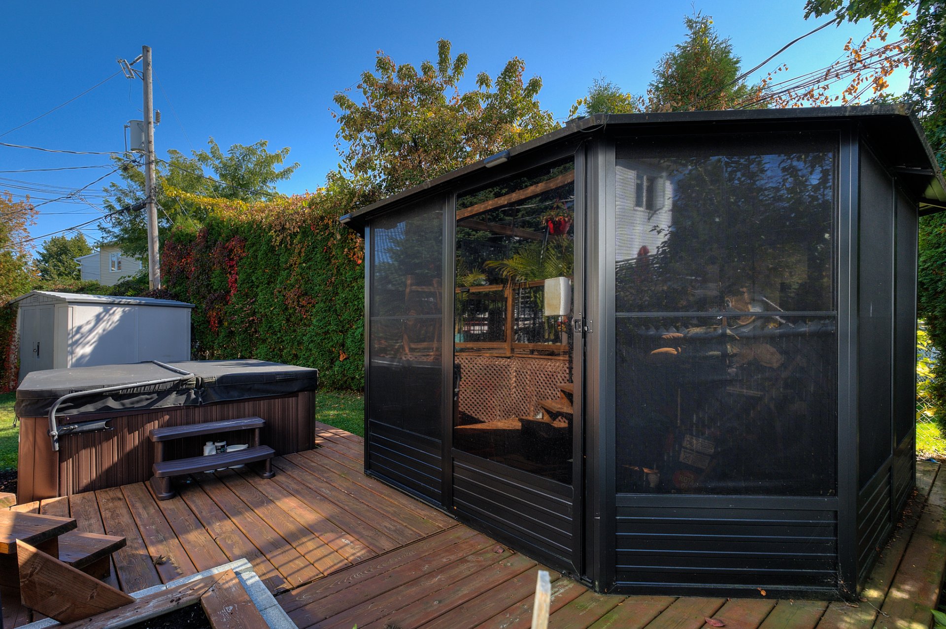 Over the years, several major upgrades have been completed: full basement renovation, modernization of the bathroom and entryway, replacement of doors and windows, resurfacing of kitchen cabinets, addition of a spa, a newly rebuilt wooden deck, a wrought iron fence, and an enclosed outdoor gazebo--perfect for extending your moments of relaxation.