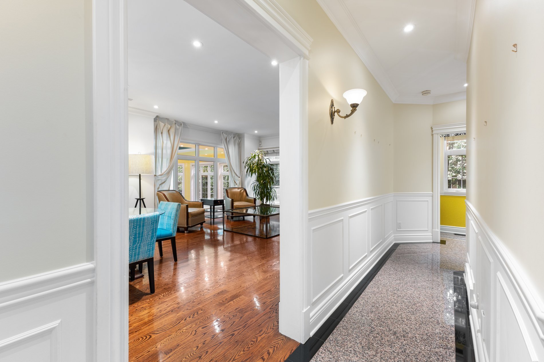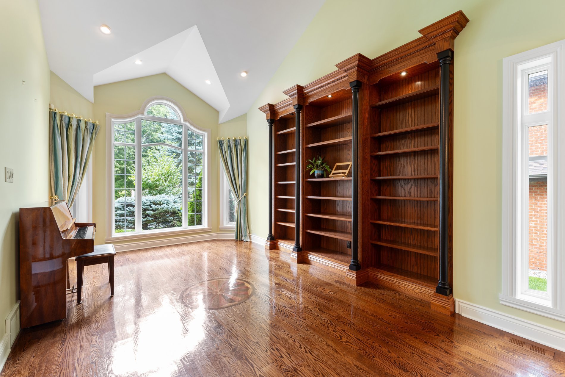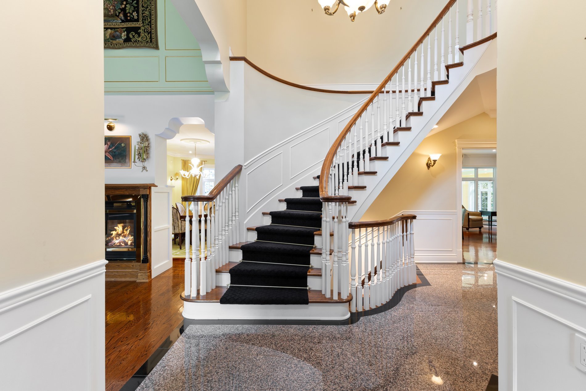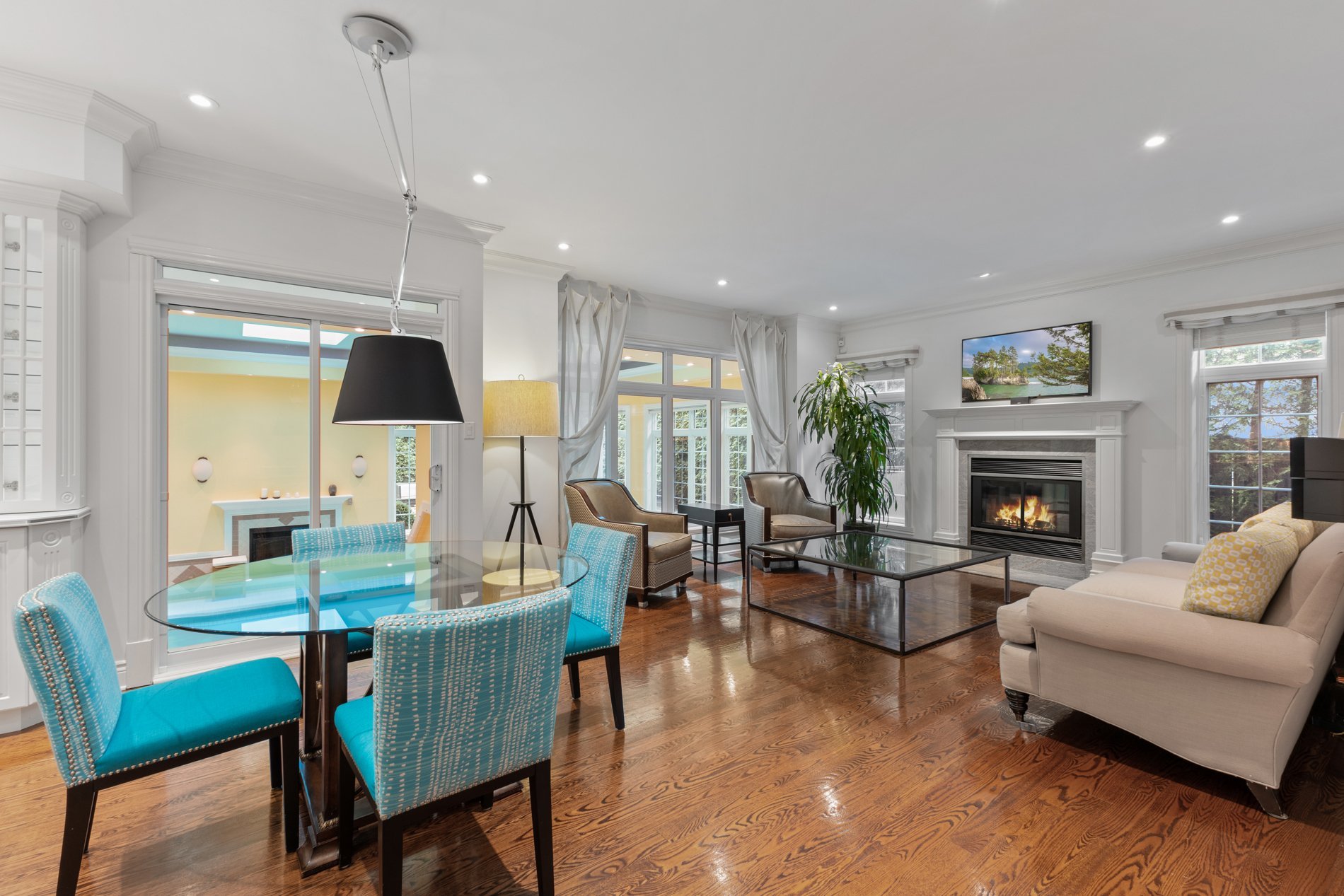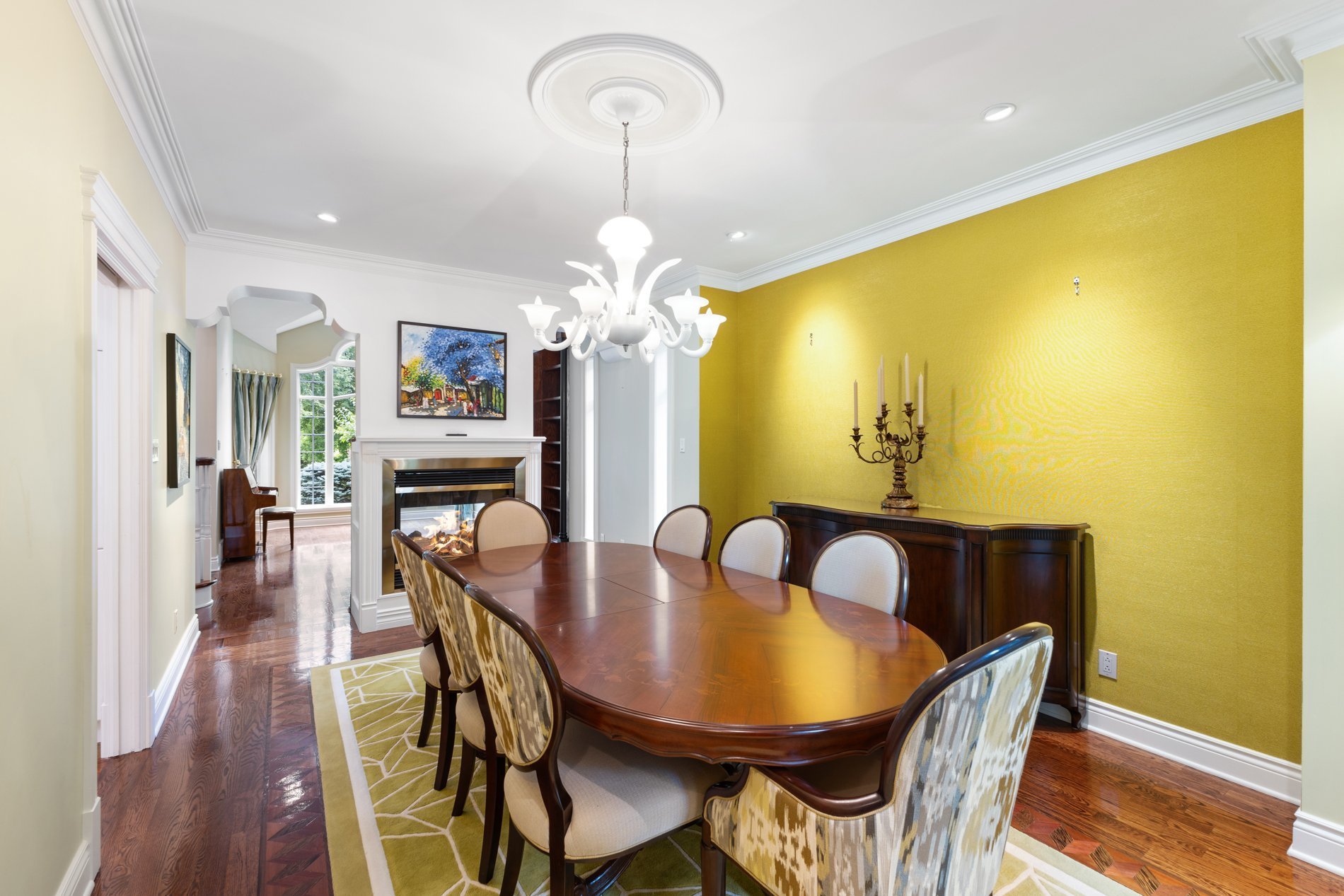 Step into the formal living room featuring soaring 16-foot high ceilings and custom built-in shelving, creating an atmosphere ideal for entertaining. The room features a striking double-sided gas fireplace that seamlessly connects to the spacious formal dining room, making it an ideal setting for sophisticated gatherings and special occasions.