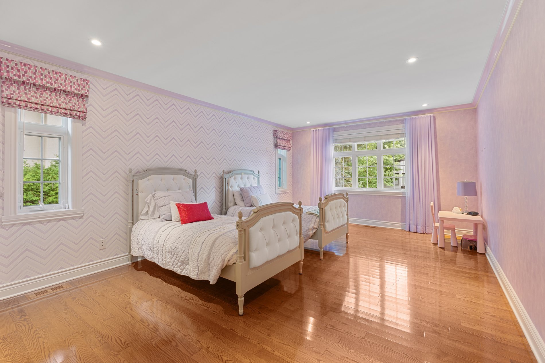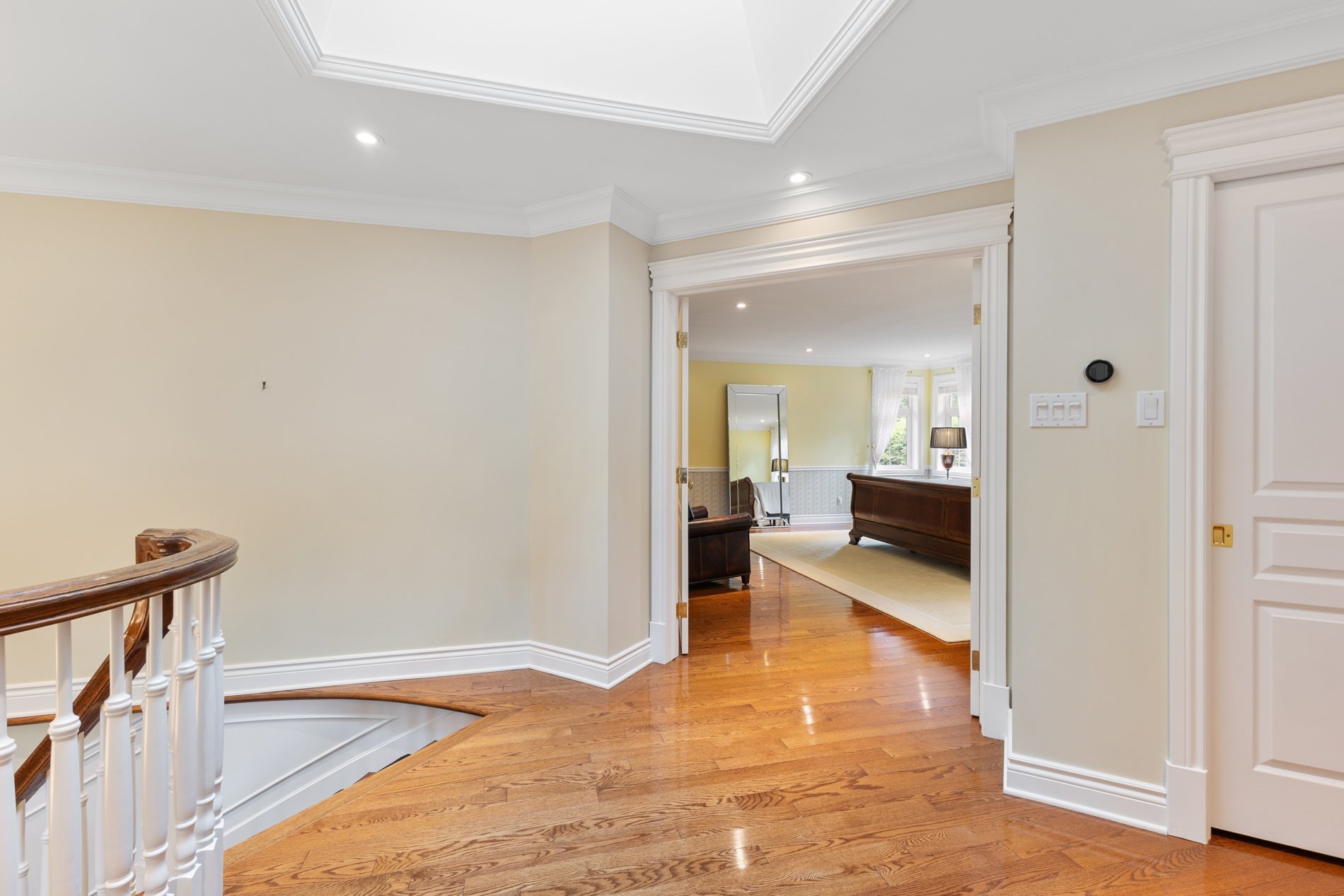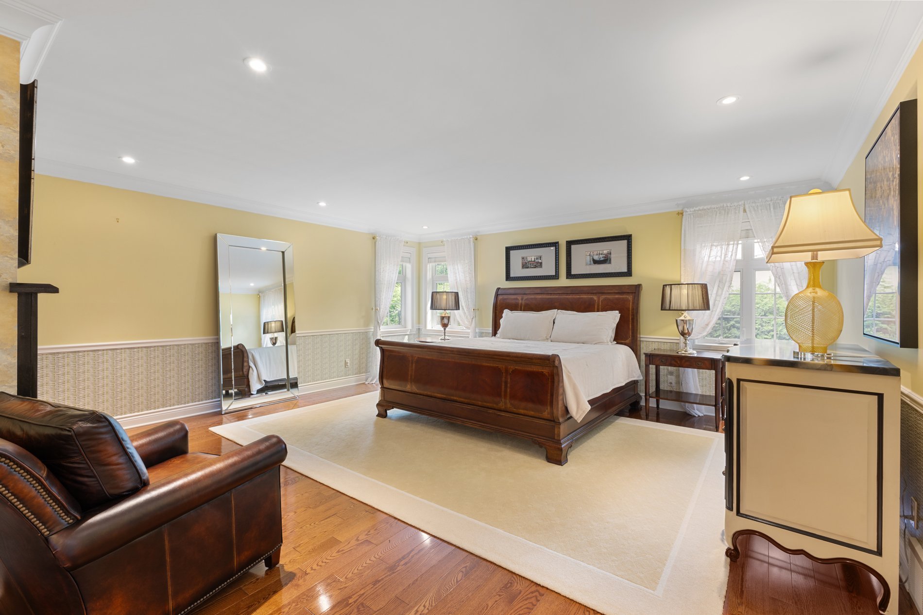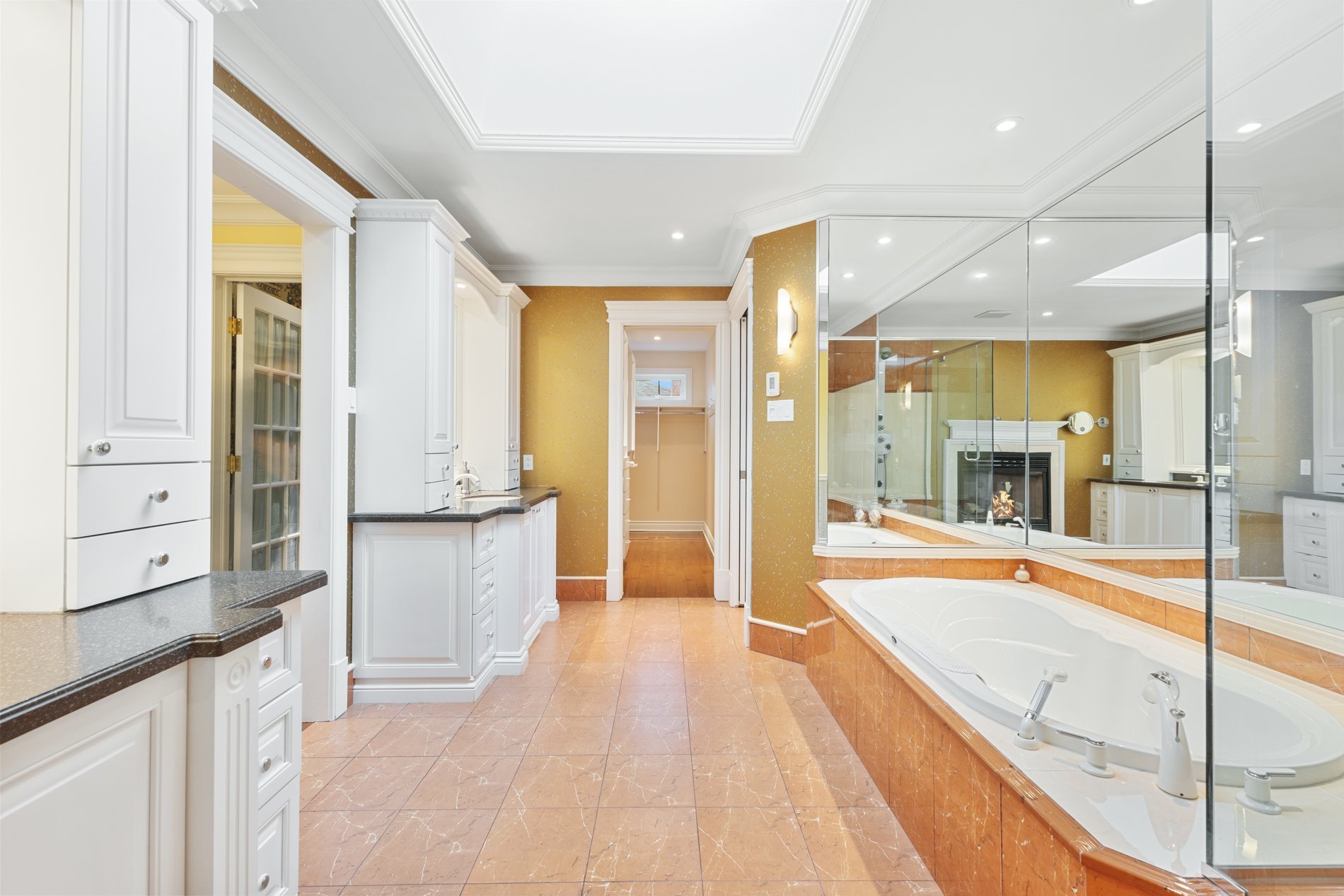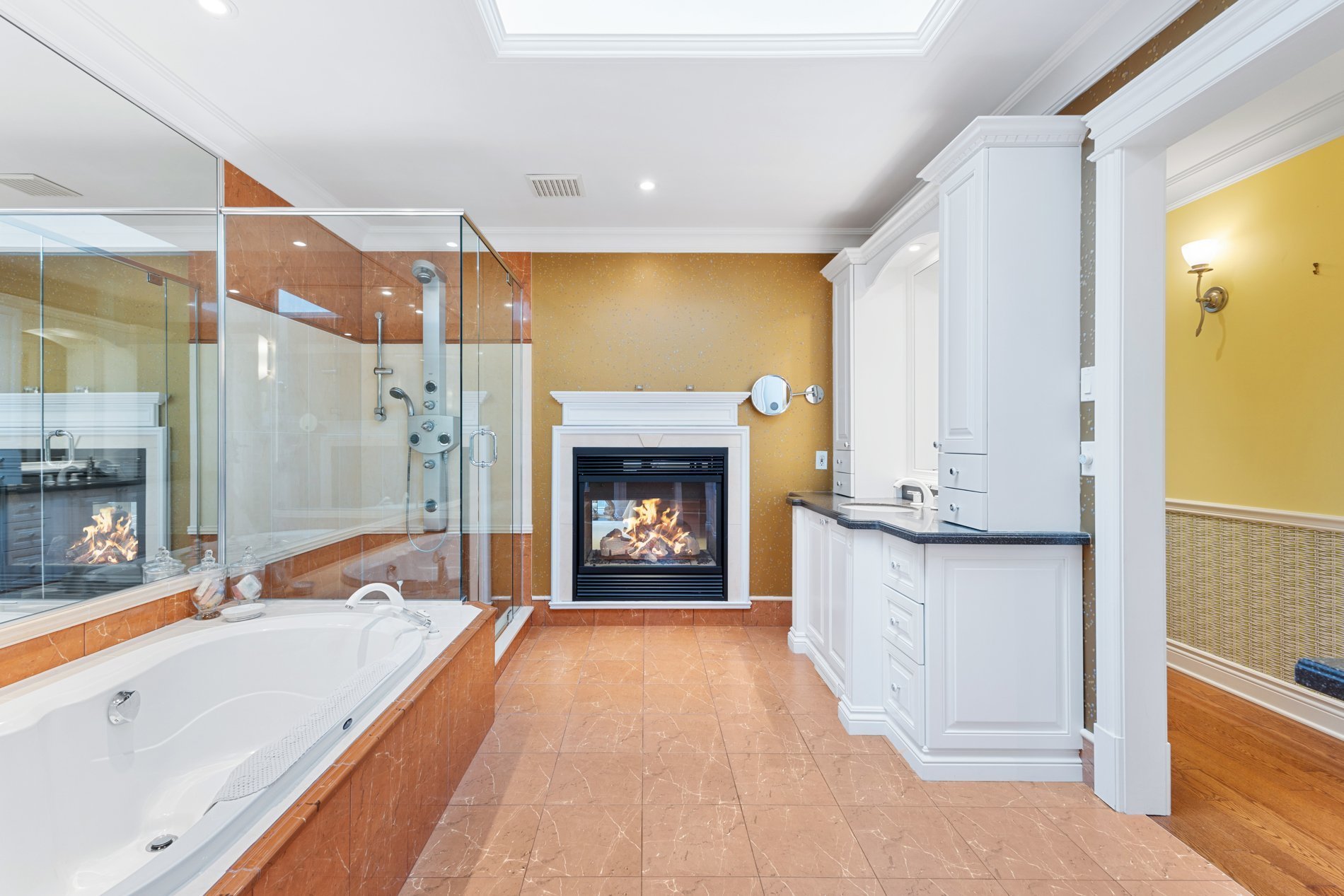 The primary bedroom is a true retreat, featuring an expansive layout, a double-sided fireplace giving onto a bright bathroom with skylight, and a large walk-in closet.