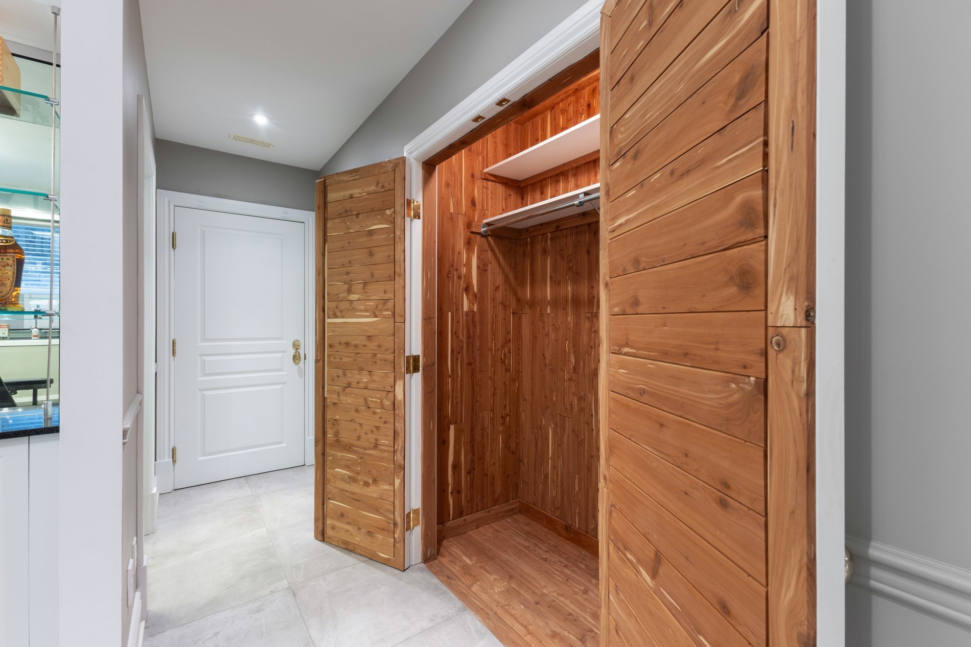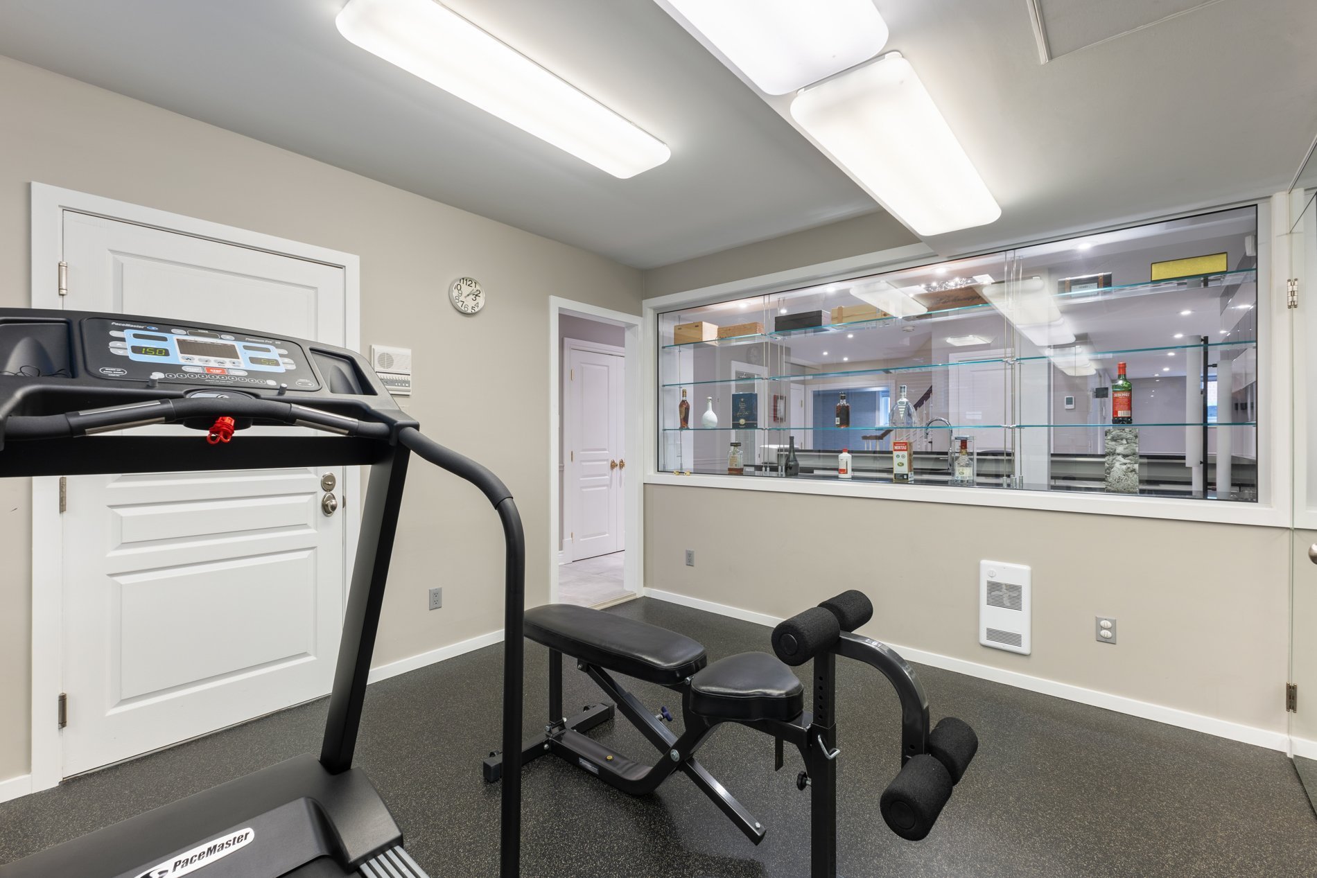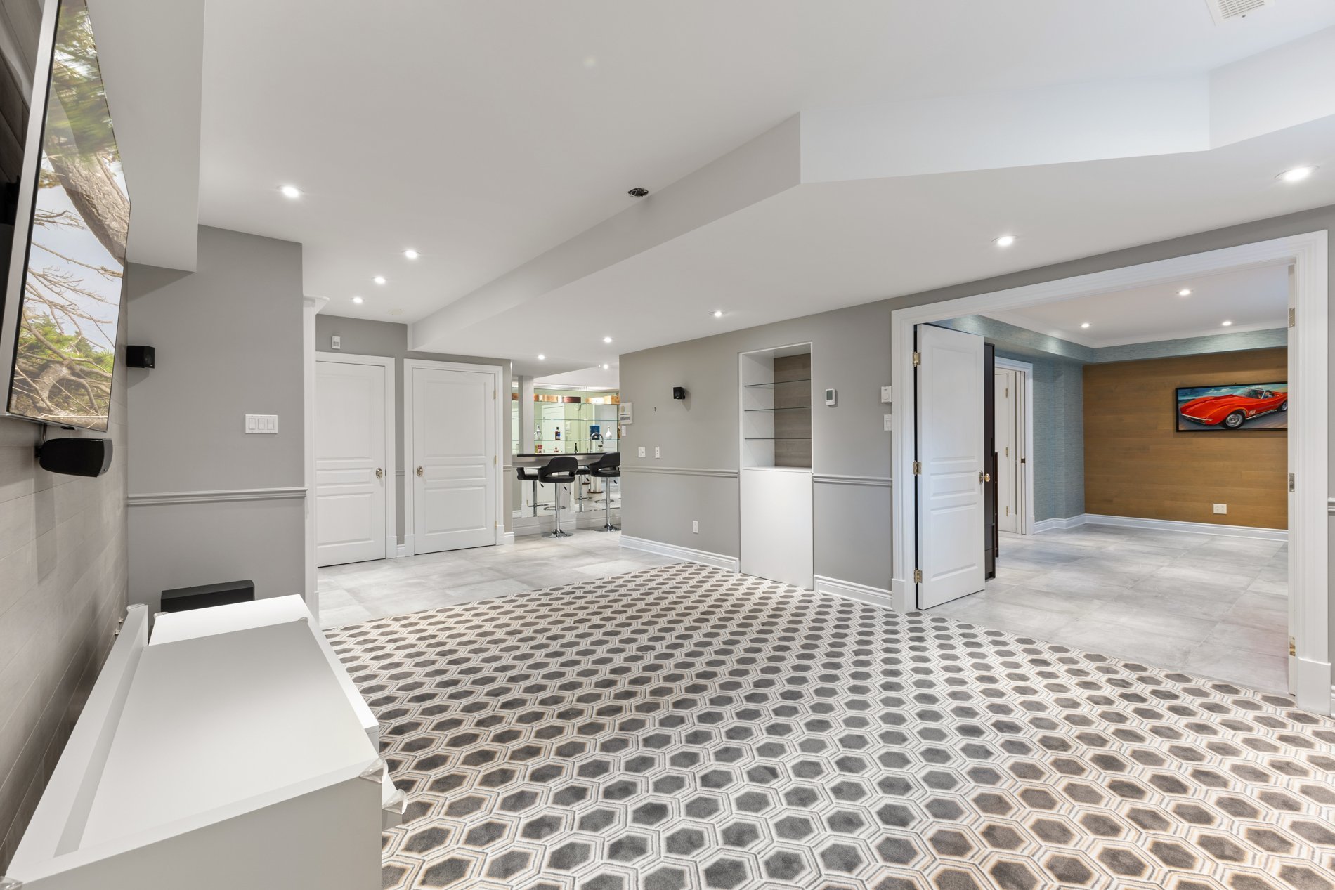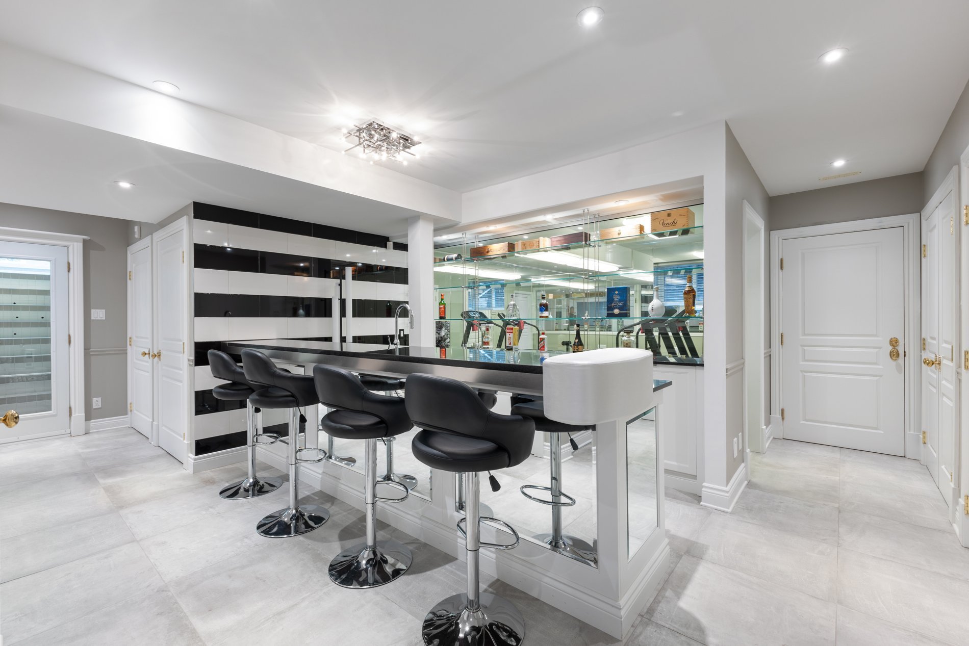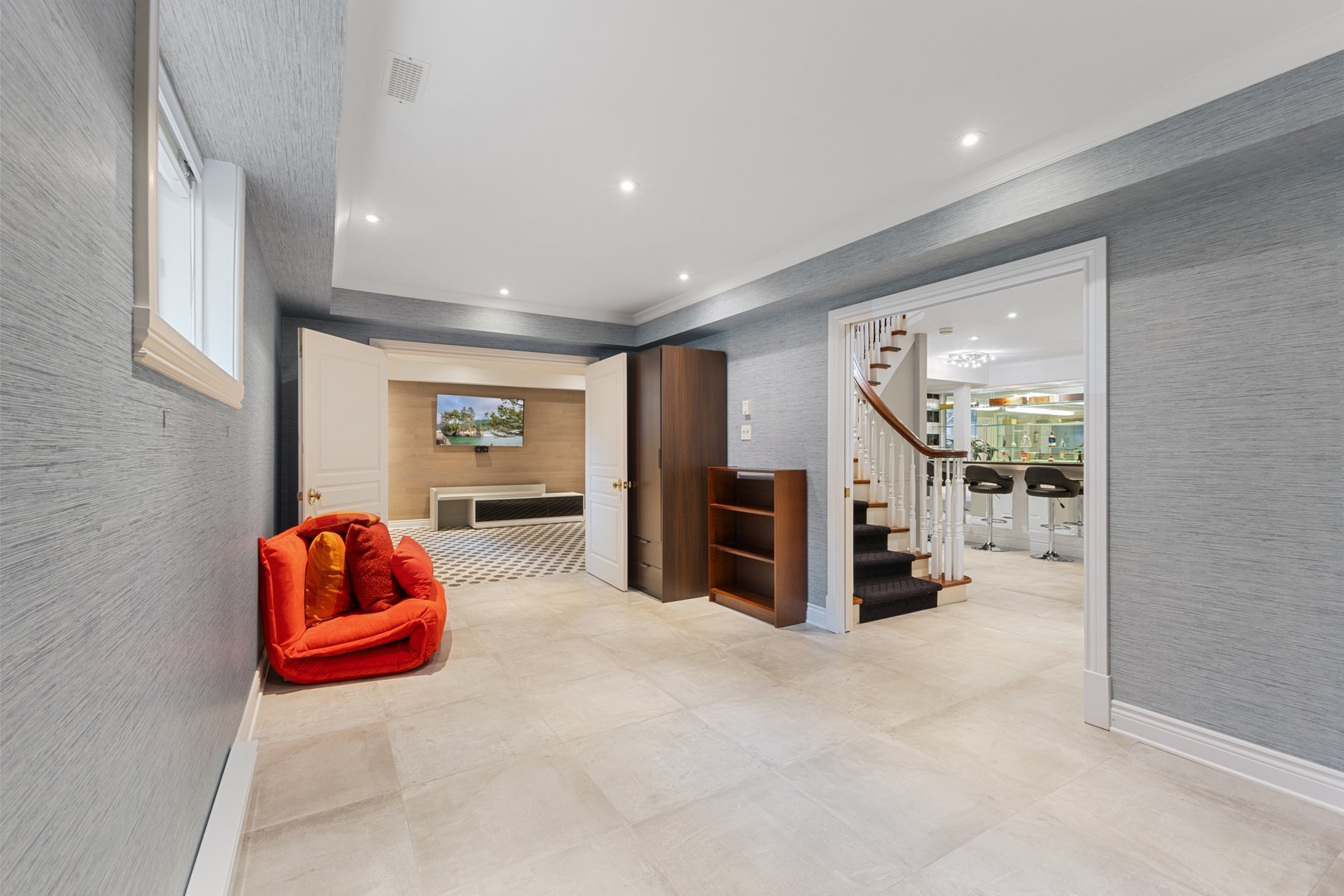 The renovated basement (2014) features heated ceramic tile flooring, a spacious bedroom, full bathroom, home gym, elegant wet bar, ample storage, access to the 4-season pool, and a family room with cozy heated floors, offering a warm and inviting space for movie nights, family gatherings or casual lounging.