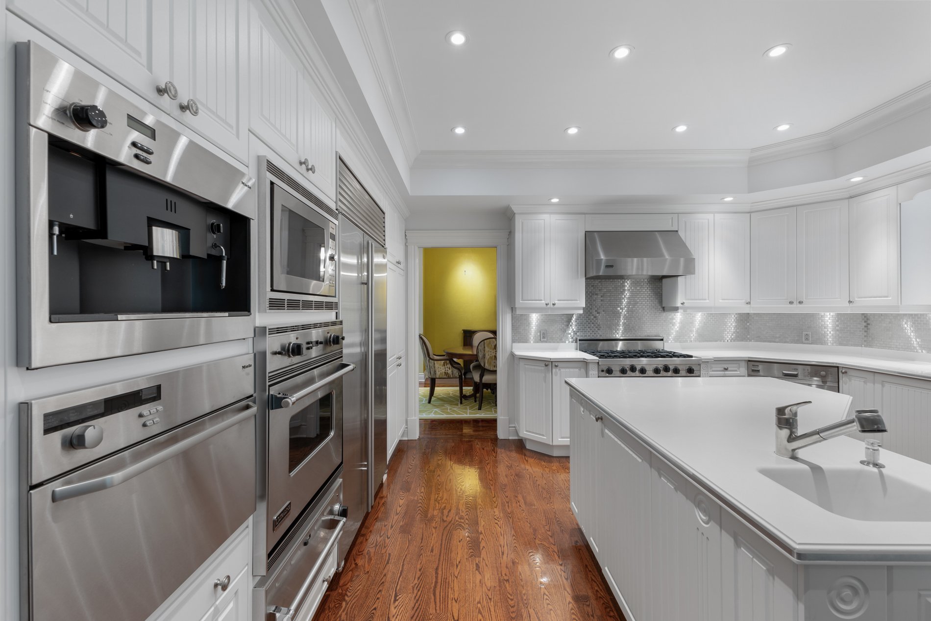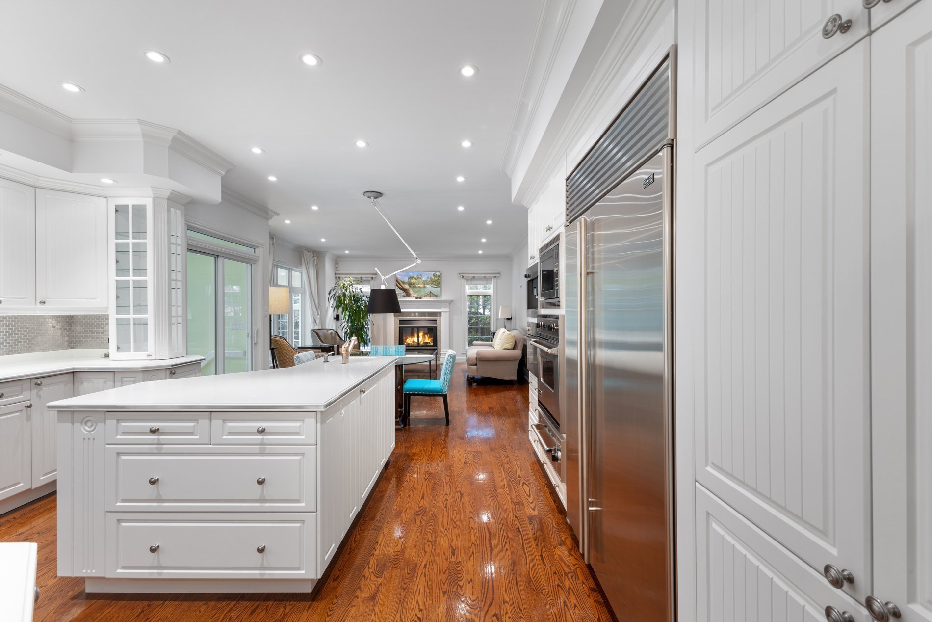 The gourmet kitchen is a chef's dream, outfitted with high-end appliances (refrigerator and freezer (Subzero), 6 burner gaz stove (Ultraline), double oven (Ultraline), warming drawer (Ultraline), steam oven (Miele), built in coffee machine (Miele), dishwasher (Miele). An inviting eat-in area open to the warm and inviting family room, which is highlighted by a cozy wood-burning fireplace.